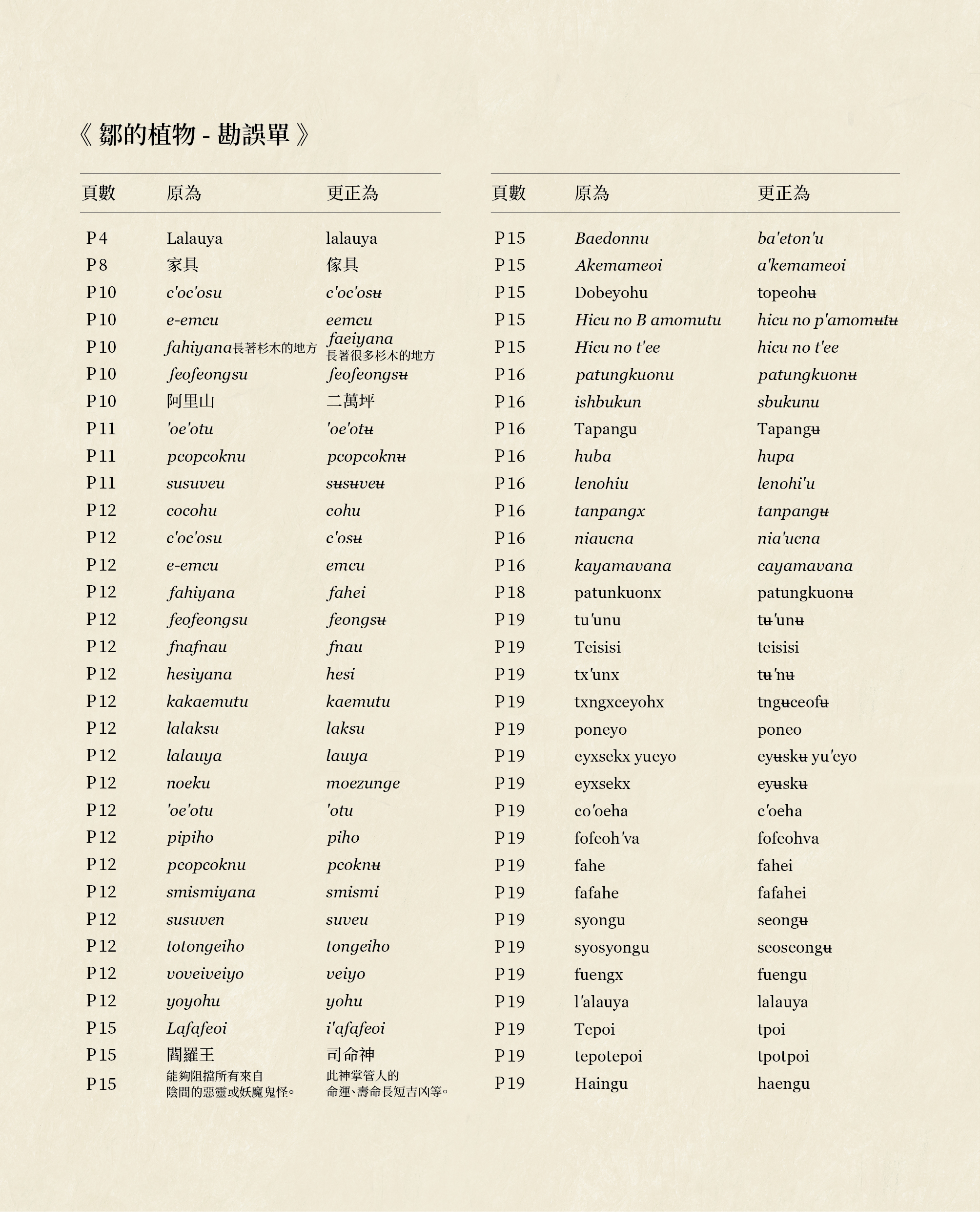 本處於109年11月出版《鄒的植物書》(ISBN:978-986-544-917-9),經查內容鄒語需校正一版,圖示內容為書籍勘誤單。