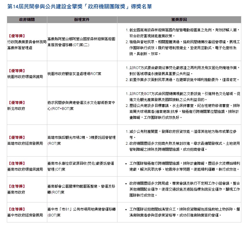 嘉義縣阿里山鄉阿里山國家森林遊樂區遊園車服務營運移轉(OT)案,創全國高海拔森林遊樂區國內智慧電動遊園車之先例,有效紓解人潮,符合政府重視綠能產業政策。積極與當地民眾、相關團體溝通,協助民間機構改善經營環境,展現工作團隊執行成效;履約管理制度健全,並使用互動式、電子化查核系統,具創新、效率,同時獲得民間經營團隊獎及政府機關團隊獎,充分展現民間團隊經營效率、服務品質及政府機關積極招商、落實履約管理成果,符合「公私協力,共創三贏」促參目標,堪稱民間參與公共建設最佳典範。