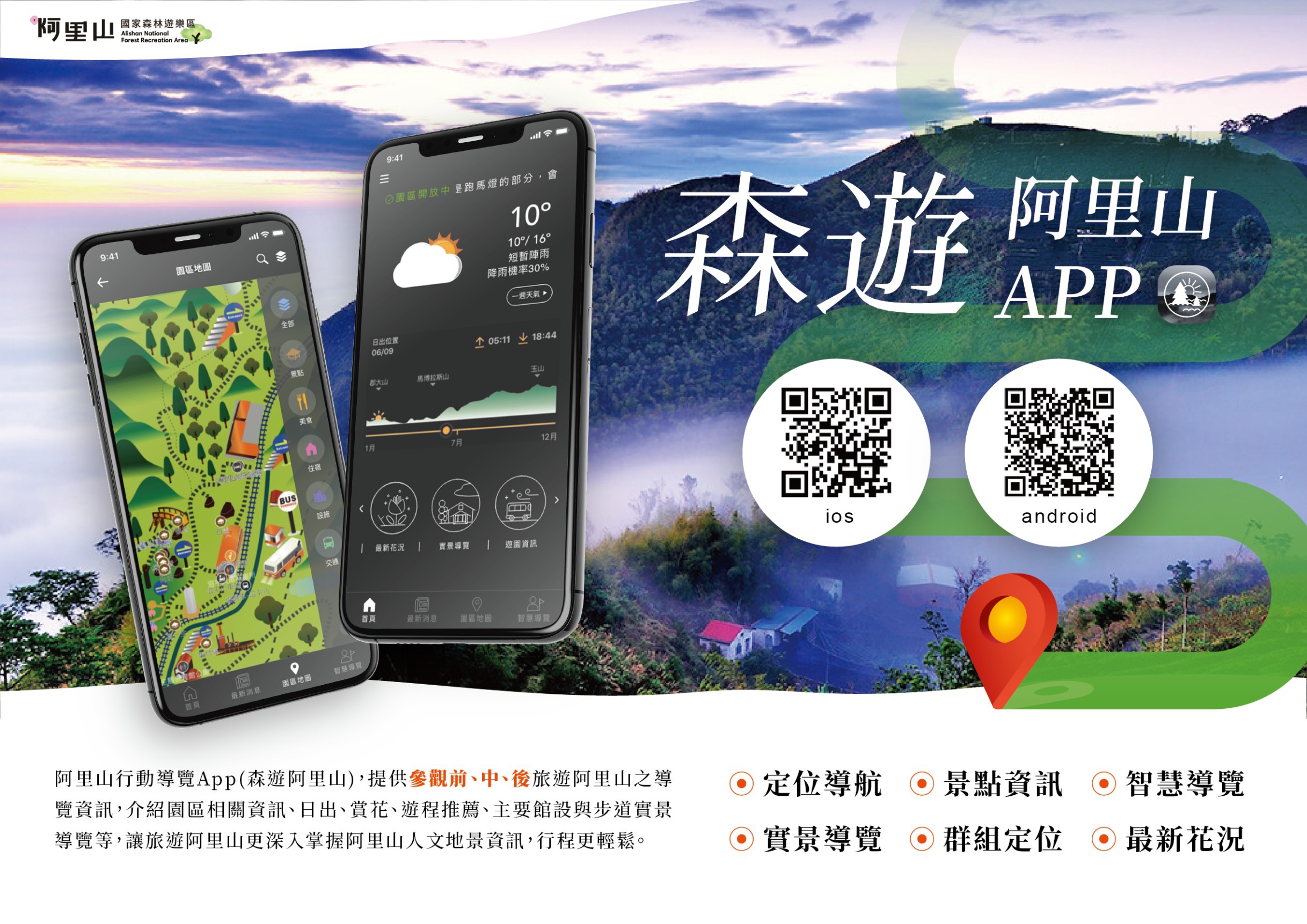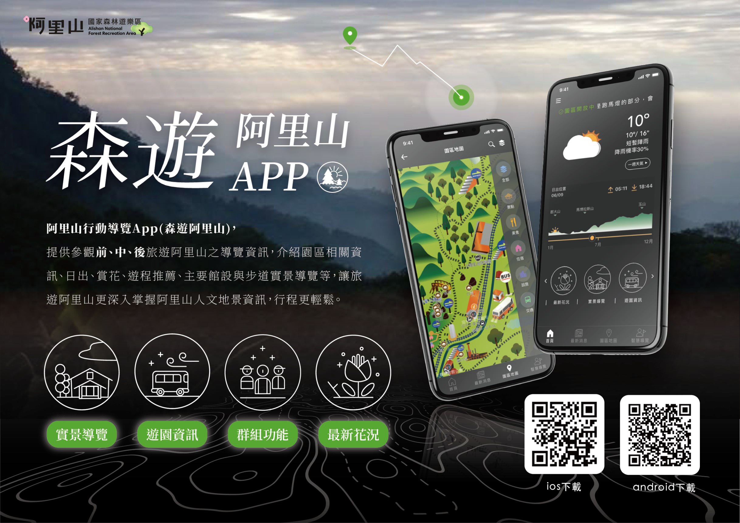 森遊阿里山Alipedia APP下載 (android) 森遊阿里山Alipedia APP下載 (ios) 藉由下載「森遊阿里山」APP,免費提供給民眾查詢阿里山交通、日出時刻、天氣、導覽地圖、花況及花種介紹的相關資訊。 本程式由「中華民國農業部林業及自然保育署嘉義分署」進行規劃、開發。 阿里山國家森林遊樂區FB