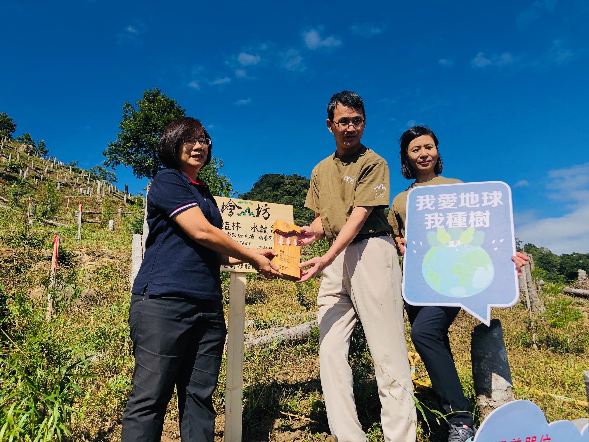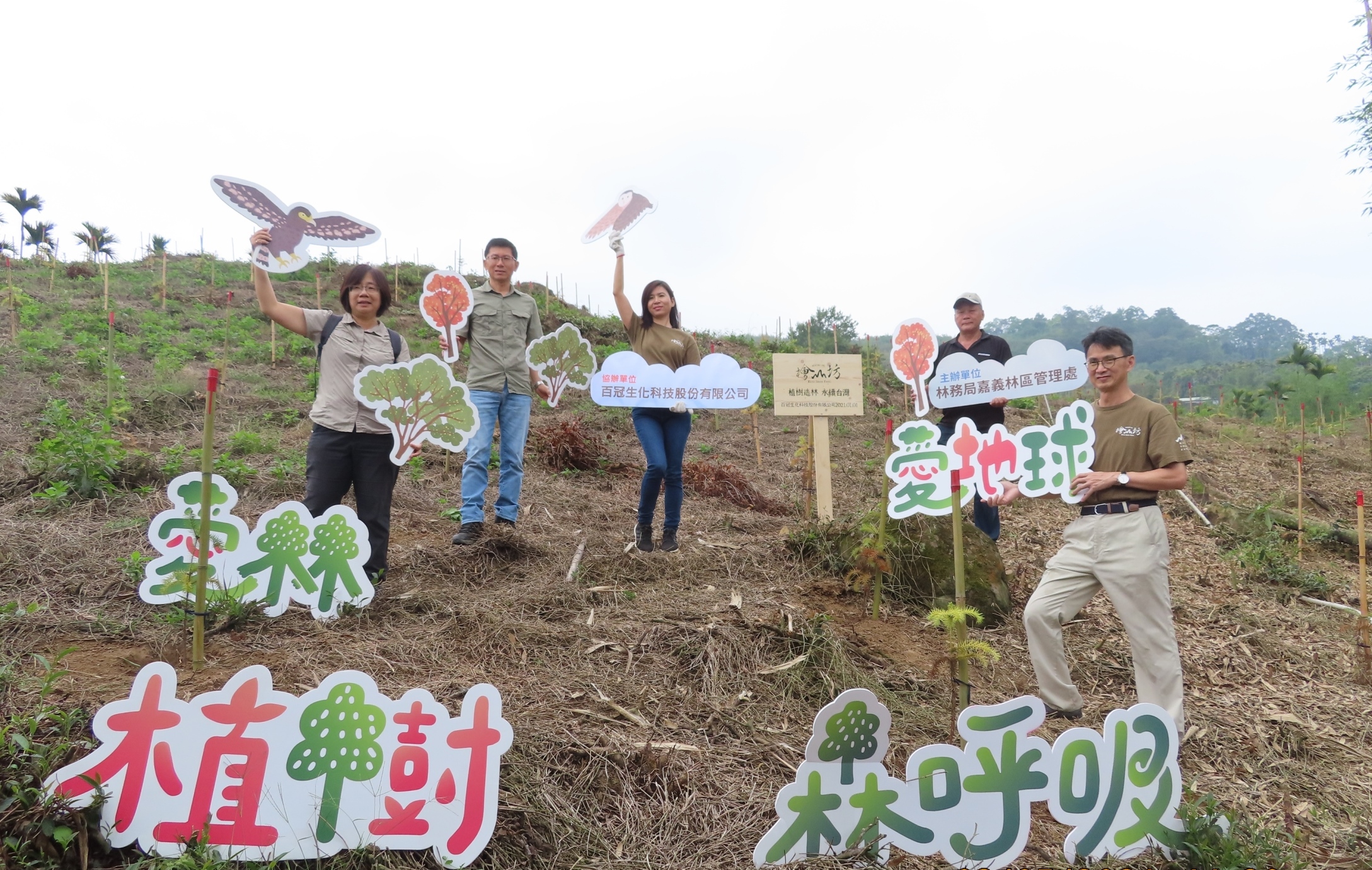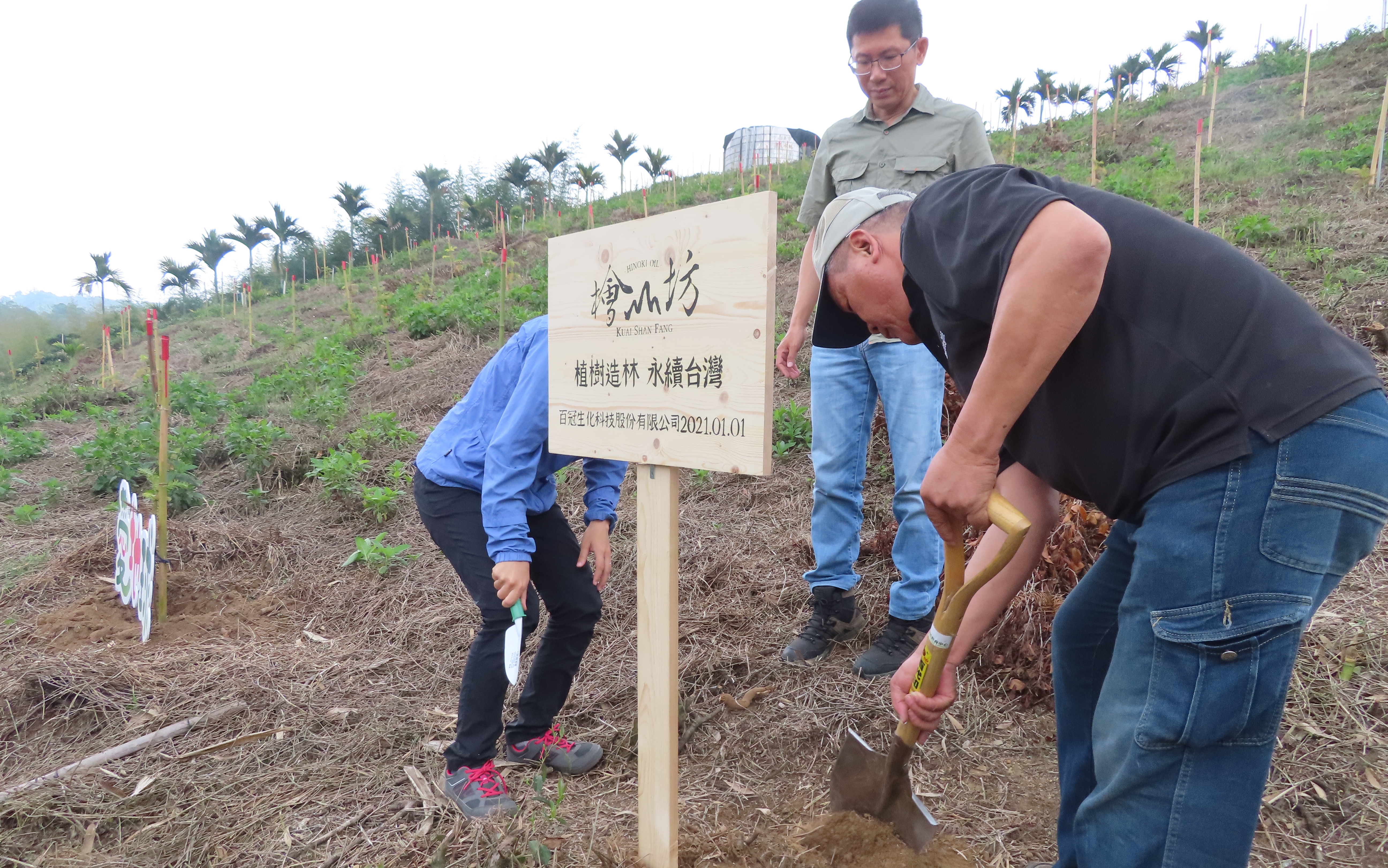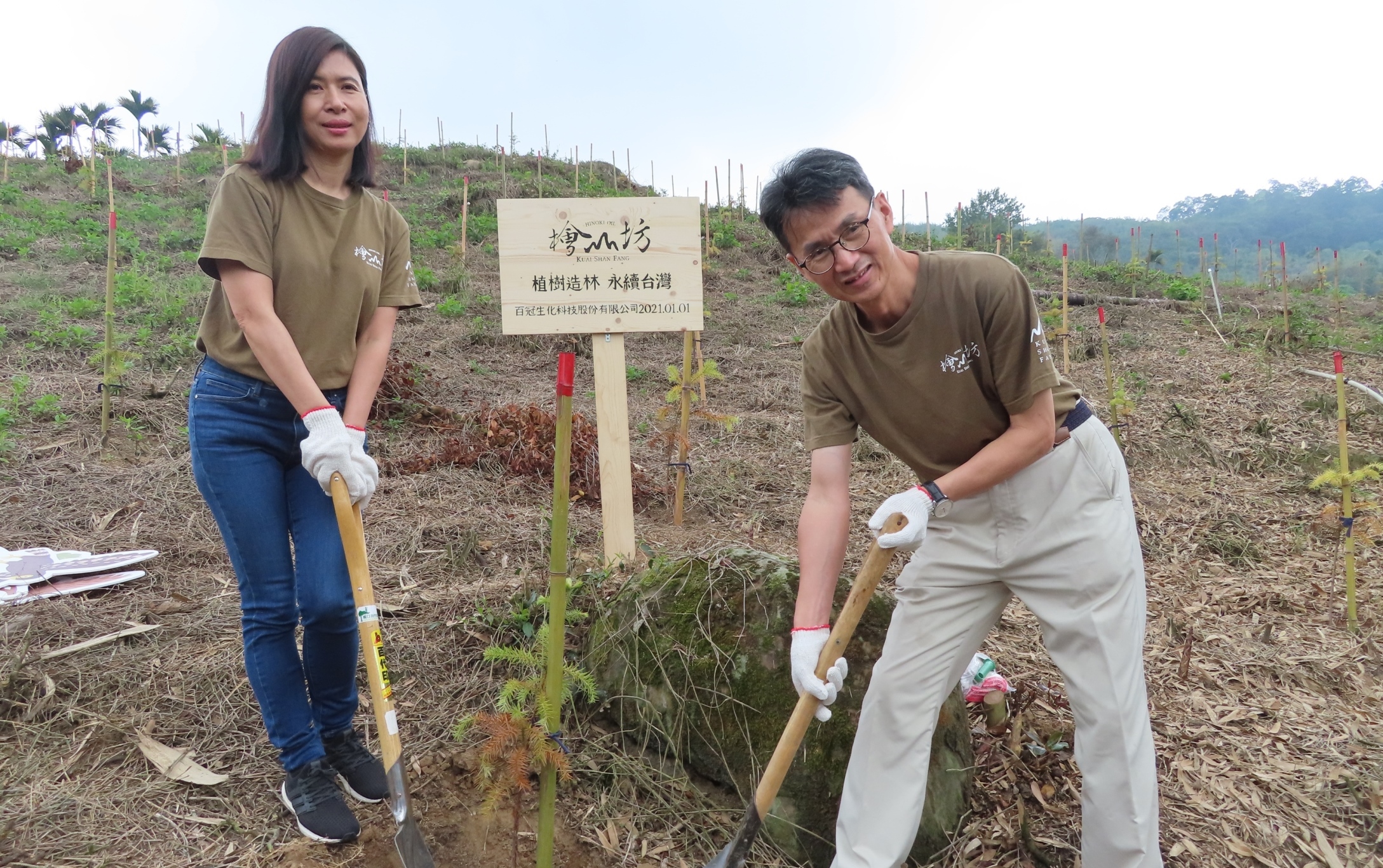 百冠生技科技股份有限公司創建檜山坊品牌,檜木精油原料來自老牌木業家具公司製作頂級家具時剩餘邊角料及木屑,經二次再蒸餾所得,堅持循環再利用、守護環境永續發展的理念,參與嘉義林區管理處捐款認養護樹計畫,認養嘉義縣番路鄉造林地,種植香杉,於110年5月3日與嘉義處共同辦理植樹活動,於造林地親手植下一株小苗,邀請大家起身成為參與者,一起守護地球。