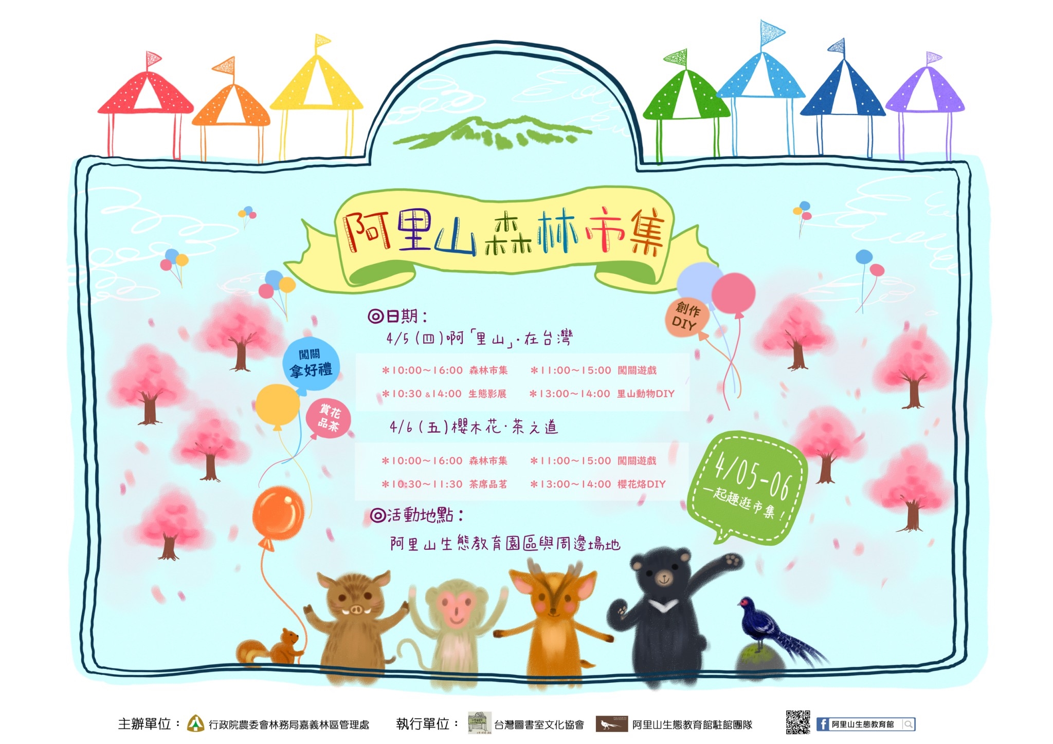阿里山花季自3月15日開跑至今,兩週來已湧入16萬餘名遊客上山觀賞櫻花,上週氣溫回暖,「櫻王」達綻放高峰,白色花瓣近日掉落,陣陣微風吹來,形成櫻吹雪的景緻,更讓遊客驚呼連連,染井吉野櫻大放異彩之後,一葉櫻、普賢象櫻、枝垂櫻等重瓣櫻及木蘭、紫藤接力綻放。 花季將於4月10日結束,嘉義林區管理處結合璀燦耀眼的花季,訂於4月5日及6日兩天在遊樂區內舉辦「阿里山森林市集」活動,邀請鄒族部落、自然綠保、在地社區及特色手創等攤位一同參與,透過熱鬧有趣的森林市集活動大力宣揚「里山倡議」永續環境的理念。 鄒族部落齊聚森林市集 參與阿里山森林市集的鄒族部落包含樂野、來吉、茶山、里佳及新美等部落,族人們帶來了各部落的農特產品及手工藝品。其中新美部落的「打手機鄒」(taso ci Cou)自然農園,致力於推動有機農業及秀明自然農法之栽種,最難能可貴的是復育原生物種如原生種糙薏芢、赤小豆等,吃起來不僅美味而且散發天然的香氣。樂野部落除了高山茶及竹類特產外,栽種的咖啡更是香醇! 來吉部落以獵人後裔自居,獵捕山豬才能獲得勇士稱號,是集智慧與勇氣的象徵,山豬(fuzu)是部落的吉祥物,以山豬作為主題發展手作工藝頗具特色、趣味。 「里山」精神 活動寓教於樂 林務局大力推廣「里山倡議」的理念,強調森、里、川、海之間的生態、農業與地景永續共榮的願景,藉由熱鬧的阿里山森林市集活動傳達里山精神再適合不過了。今年的市集規劃了兩大主題,第一天的主題是「啊『里山』•在臺灣」,活動內容包含了在阿里山生態教育館放映《里山臺灣:滄海桑田桃花源》等生態影片外,也設計了以「里山倡議」為主題的闖關遊戲,闖關成功者還可獲贈小禮物。此外,遊客們也能以疏伐柳杉為素材,以林務局設計的石虎、食蛇龜等里山動物圖案,DIY創作出一隻隻可愛的動物作品帶回家。 第二天的主題是「櫻木花•茶之道」,開放遊客現場限量報名,透過茶席擺設,不僅可以坐在櫻花樹旁喝著茶道達人沖泡的阿里山茶,同時欣賞園區的美麗花海;而以木片為素材,結合阿里山櫻花意象所設計的烙燒體驗,更能讓遊客創作出屬於自己獨特的「櫻花烙」做紀念。 凡是在森林市集消費的遊客,也有「消費贈禮」好康活動,只要遊客在攤位消費時自備購物袋與攤主合照,照片上傳FB並在「阿里山生態教育館」打卡,即可獲贈嘉義林管處特地準備的「神秘好禮」一份,送完為止,喜愛賞花的民眾要抓緊春天的腳步,歡迎來阿里山國家森林遊樂區賞花逛市集!