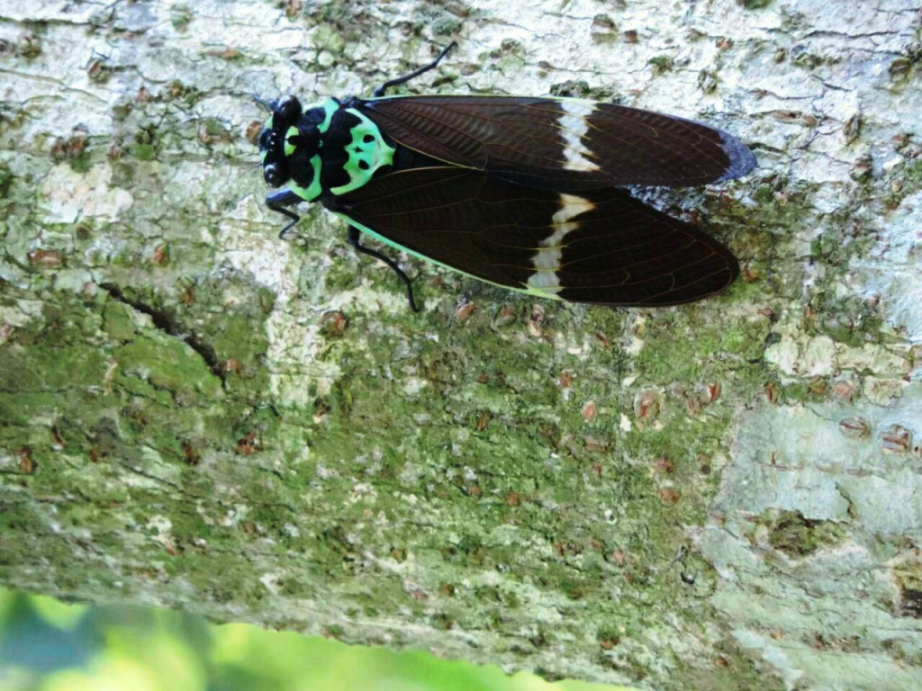 在臺灣的蟬約有70 多種,「臺灣爺蟬」是體型最大的,因身體和前後翅都是黑色,堪稱是蟬中的黑美人。另因胸部及翅背面的美麗淡綠色紋彷彿狐狸的臉,所以也有「青頭蟬」、「狐狸蟬」的美名。