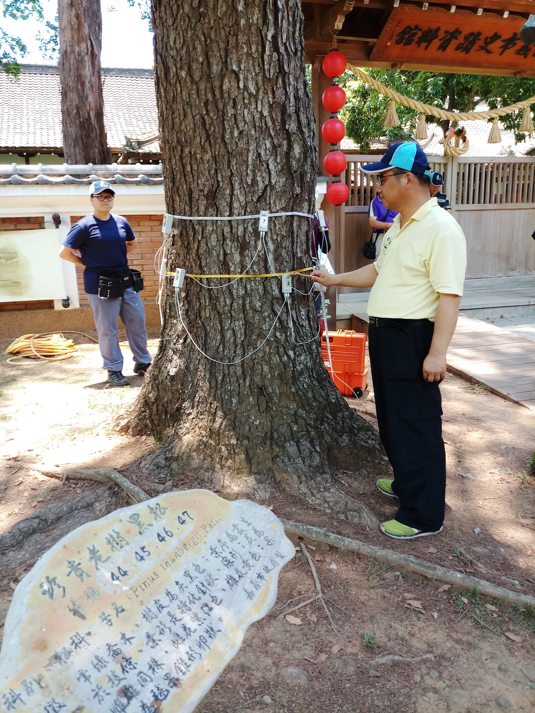嘉義林區管理處今(28)日邀請到林業試驗所副研究員傅春旭,為嘉義公園內市府列管的老樹日本黑松及金龜樹進行健檢,並採用應力波檢測儀為老樹「斷層掃描」,以發現老樹潛藏病灶,對症下藥,提供市府維護管理老樹的建議。