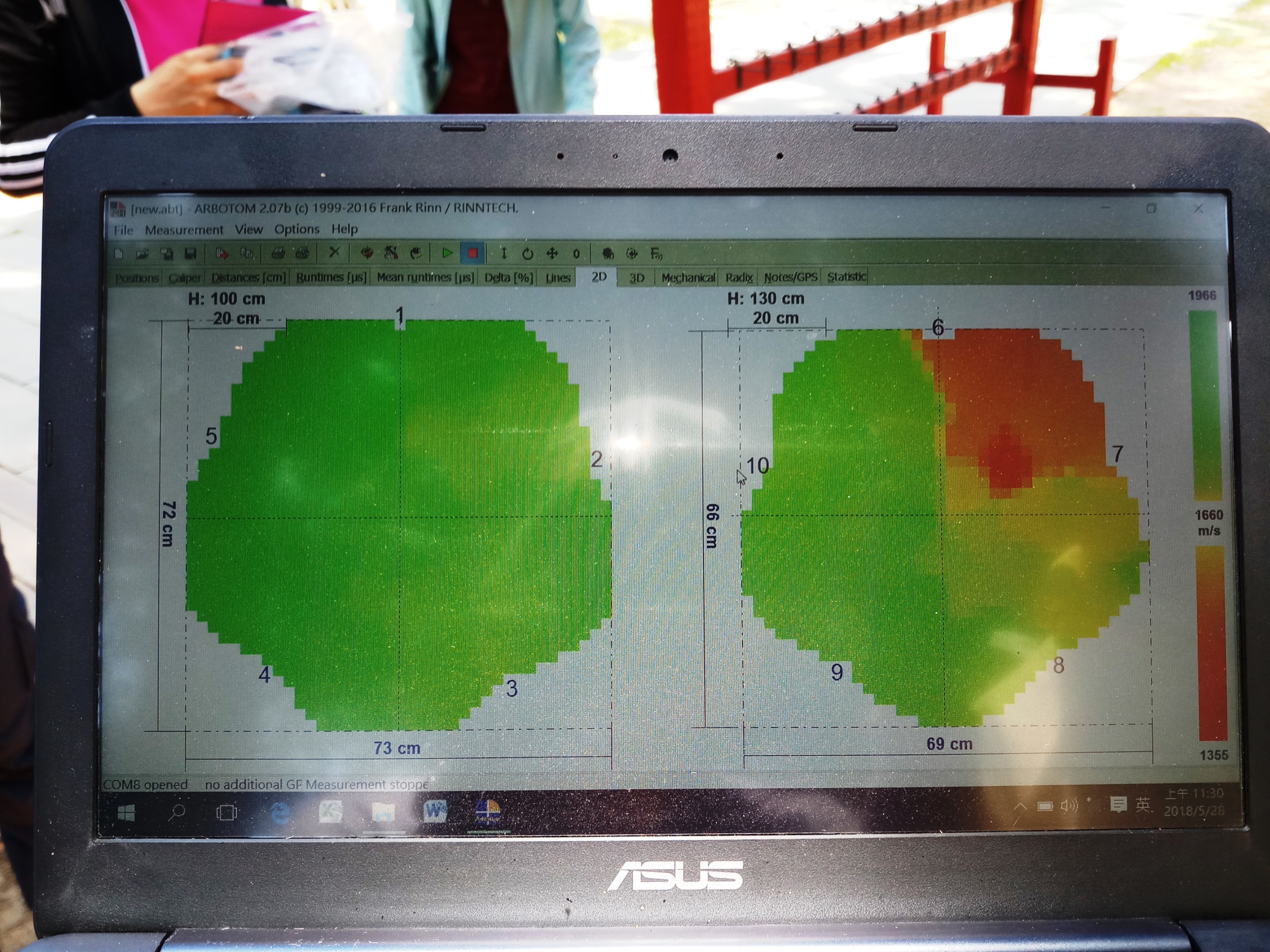 近年來樹木保護觀念逐漸受到重視,老樹更是各縣市政府重要列管保護的對象,但如何保護呢?以往多以「樹木健康評估表」採目測法進行健康性評估,惟其主要是以檢視外觀病徵為主,無法立即判斷林木內部是否有腐朽空洞情形發生,隨著科技日新月異,樹木保護概念逐漸專業化,現可透過非破壞性的「應力波檢測儀」掌握樹木內部腐朽程度並進行定期監測,有效管理防範於未然,其原理主要是透過鎚子敲擊樹體產生的聲波,從聲波傳導速度變化即可以非破壞性的方式,了解樹木內部的結構及健康情形,若結構越密實,聲波傳導速度越快,反之則越鬆散,並配合電腦解析可以有效及準確地讓我們「看」到樹木內部的情况,進而採取適當保護措施。