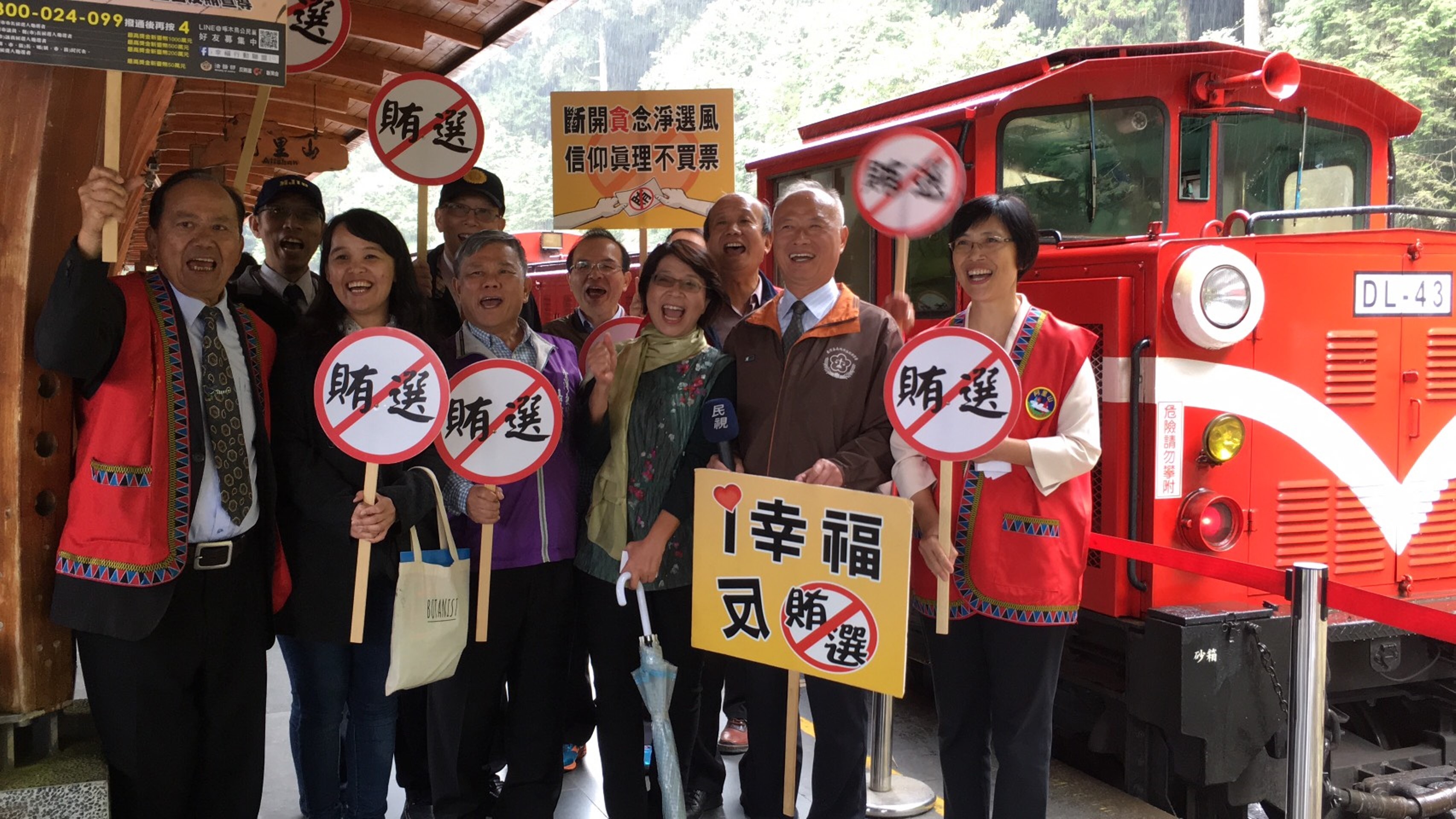 嘉義地區檢、警、調、廉政、林政對於打擊違反森林法之不法案件,一向合作無間,查緝山老鼠成果豐碩,今(31)日再度「跨域合作守護原鄉」,辦理反賄選宣導活動,透過原住民頭目錄製反賄選廣播帶,公開呼籲原鄉族人不賄選、不買票、不賣票,強化原鄉住民反賄選觀念,以淨化選風,落實選賢與能之民主政治。 反賄選大家一起來 為乾淨選舉、清廉政治共同努力 今天嘉義地區檢、警、調、廉政、林政齊聚在阿里山森林遊樂區台灣最高的火車站─「阿里山車站」啟動反賄選列車,意義非凡,相信在大家的共同努力下,反賄選一定成功,必能達到「乾淨選舉、清廉政治」之目標。 High到最高點 選賢與能 清廉勤政 嘉義林管處鄭鈞謄秘書表示,感謝大家蒞臨阿里山森林遊樂區參加「反賄選列車最高點-跨域合作守護原鄉」活動,並期許透過本次反賄選活動,能強化原鄉住民反賄選觀念,以淨化選風,選賢與能,提升清廉勤政效能,同時也能持續發揮檢警調林政聯繫平台的力量,共同守護、愛護、保護森林資源。