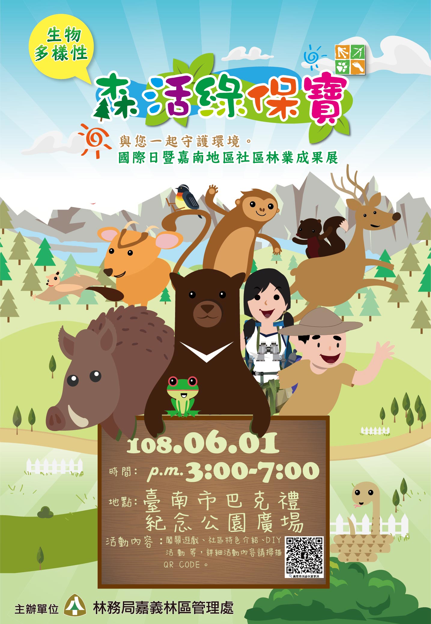 林務局嘉義林區管理處配合國際生物多樣性日,於6月1日(六)下午3時至7時,在臺南市巴克禮紀念公園廣場規劃辦理集結嘉南地區社區林業夥伴的「國際生物多樣性日」推廣活動,以呼應國際生物多樣性日今年的主題:「我們的生物多樣性、我們的糧食、我們的健康」。現場有闖關集點活動、社區特色與生物多樣性介紹、DIY及巴克禮紀念公園生態導覽等活動,歡迎大家來參加! 社區林業與生物多樣性緊密不可分! 嘉義林管處張岱處長表示,管理處長年以來透過社區林業計畫,陪伴社區認識自己環境的動植物與魚蟹,建立生態保育與環境保護的概念,培訓在地居民解說與環境教育推廣,適度的使用在地自然素材開發成DIY材料、手工藝品、風味餐與環境綠美化設施,不僅是管理處在生態保育工作上的好夥伴,也是長期公民實踐生物多樣性的典範。 國際生物多樣性日(International Day for Biological Diversity)是聯合國環境署提議保護和永續利用生物多樣性的國際性主題紀念日,當前定於每年的5月22日。自2001年起,每年訂有主題提醒人們注重生物多樣性。今(2019)年主題為「我們的生物多樣性、我們的糧食、我們的健康」,將生物多樣性作為糧食和健康的基礎,作為改革糧食系統和改善人類健康的關鍵催化劑。 過去100年來,超過90%的作物種類已經從農田消失,為數眾多的家畜已消失了一半的品種,世界上17個主要漁場的漁獲量都達到或超過可持續限額。包括相關原住民、傳統和本地知識在內的各地多樣化糧食生產系統正受到威脅。隨之而來的是農業生物多樣性、傳統醫學以及有關當地食物的基本知識的消失。因此,今年主題旨在利用知識並提高人們對糧食系統、營養和健康對生物多樣性和健康生態系統的依賴性的認識。 社區林業,森林活化與綠色保育的寶庫! 6月1日的推廣活動有來自嘉義山區的十字社區、公興社區與逐鹿社區,臺南沿海的大港社區、鹿耳社區、投入北門地區生態旅遊的團隊、臺南淺山地區的天埔社區及管理處生態保育與林業推廣攤位,分別帶來各具特色的社區林業成果展示、DIY活動與社區特色問答,只要成功回答現場任一攤位問題即可獲得貼紙一枚,在現場提供的闖關地圖上收集5枚社區貼紙、各2枚里山動物與產業貼紙,即可到服務台兌換小禮物。 活動當天下午4時起,由臺南市巴克禮紀念公園永續經營協會夥伴帶領民眾認識巴克禮紀念公園生態與設計理念,現場於服務台開放報名20個名額,額滿為止! 相關活動詳細資訊請至嘉南森活綠保寶家族FB粉絲查閱https://www.facebook.com/Greenforestry/。