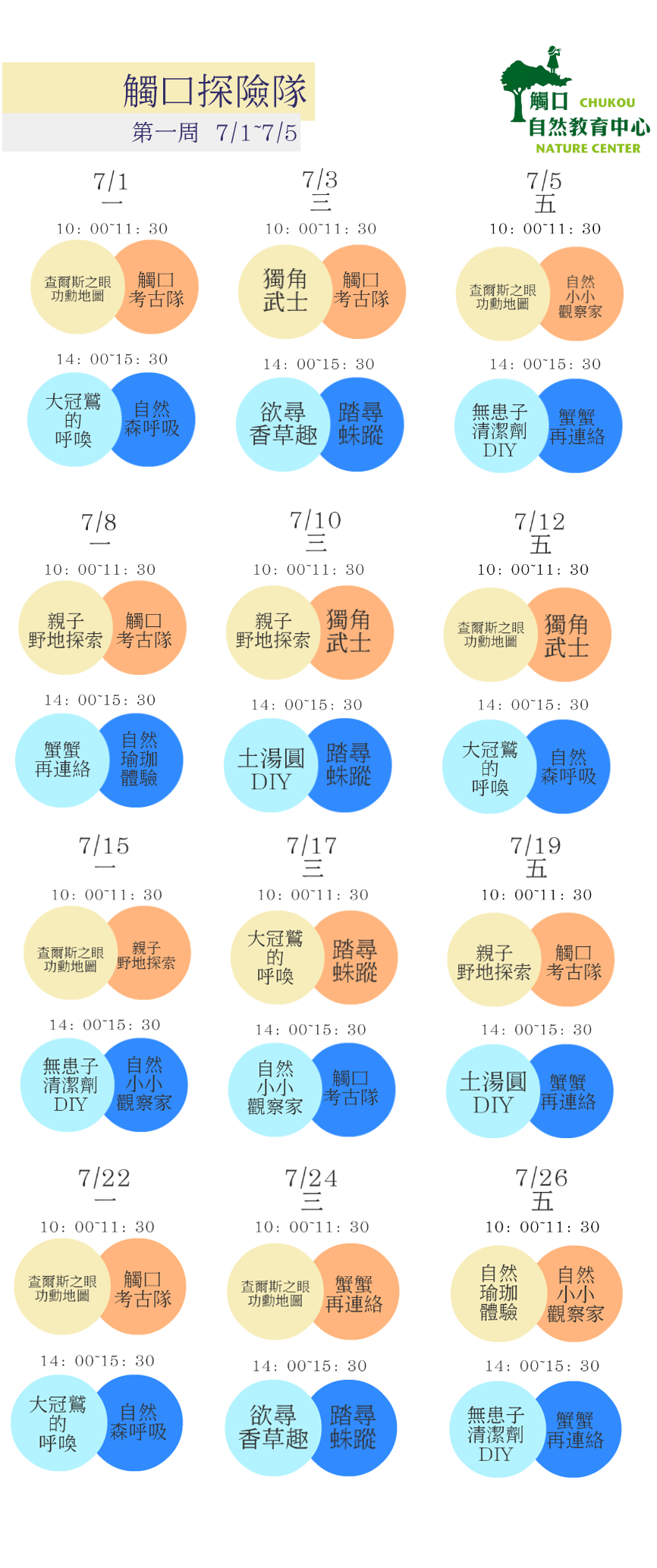 林務局嘉義林區管理處觸口自然教育中心十歲了,自108年6月22日起至7月26日,觸口自然教育中心特別推出「觸口探險隊」活動,規劃13套精選定時定點課程,邀請大家一起來歡慶十週年生日。 炎炎夏日 觸口探險「趣」 嘉義林區管理處觸口自然教育中心自98年7月18日正式營運以來,推出的課程服務皆採預約制,平時前往中心園區踏青的民眾因未預約申請且人數少,無法體驗中心的課程活動。有鑑於此,中心特別推出十周年特別活動—「觸口探險隊」, 精選13套定時定點課程服務,於6月22日到30日,每周六、日各提供2場次活動;7月1日到7月26日每周一、三、五各提供4場次活動,一次滿足大家的需求。「觸口探險隊」系列活動可現場報名,只要年滿6歲以上民眾,於課程開始前10分鐘至園區綠意館一樓報名及繳費即可參與。課程時間約為1.5小時,每項活動每人收費50元,課程詳細內容可至觸口探險隊專頁(https://sway.office.com/PEss2pulYiULTLJW?ref=Link)查詢。 打開探索自然的視野 「觸口探險隊」系列課程有自然探索、動物視野、輕鬆生活、DIY活動四大類,讓民眾根據喜好及需求,選擇不同的課程來接觸自然。自然探索課程〈親子自然同遊趣〉、〈查爾斯之眼—功勳地圖製作〉、〈觸口考古探險隊〉、〈自然小小觀察家〉,提供親子學習如何進行安全有趣的野地探索活動。動物視野〈蟹蟹再連絡〉、〈無「獨」有偶〉、〈踏尋蛛蹤〉課程以中心園區熱門生物臺灣南海溪蟹、獨角仙、蜘蛛等為主角,帶領大家認識園區原住民,學習如何與萬物共生共榮。輕鬆生活〈欲尋香草趣〉、〈無患子清潔劑DIY〉及〈自然瑜珈體驗〉,學習運用自然元素增進生活品質。DIY活動有〈土湯圓〉及〈大冠鷲的呼喚〉適合喜愛動手作的民眾來進行種子球盆栽、種子鳥笛DIY體驗。 觸口自然教育中心位於阿里山公路約29.5公里處,交通便利,園區動、植物生態豐富,是適合大朋友、小朋友親近自然的好地方。中心持續推出適合社會各界及各年齡層民眾體驗學習的新課程,歡迎民眾前來師法自然,快樂學習。中心地址:嘉義縣番路鄉新福村五虎寮18號,開放時間9:00~17:00,中心各項活動訊息可至林務局自然教育中心網站 (https://recreation.forest.gov.tw/)及觸口自然教育中心Facebook粉絲專頁(https://www.facebook.com/cycknc/)查詢,或來電洽詢(05)259-0211。
