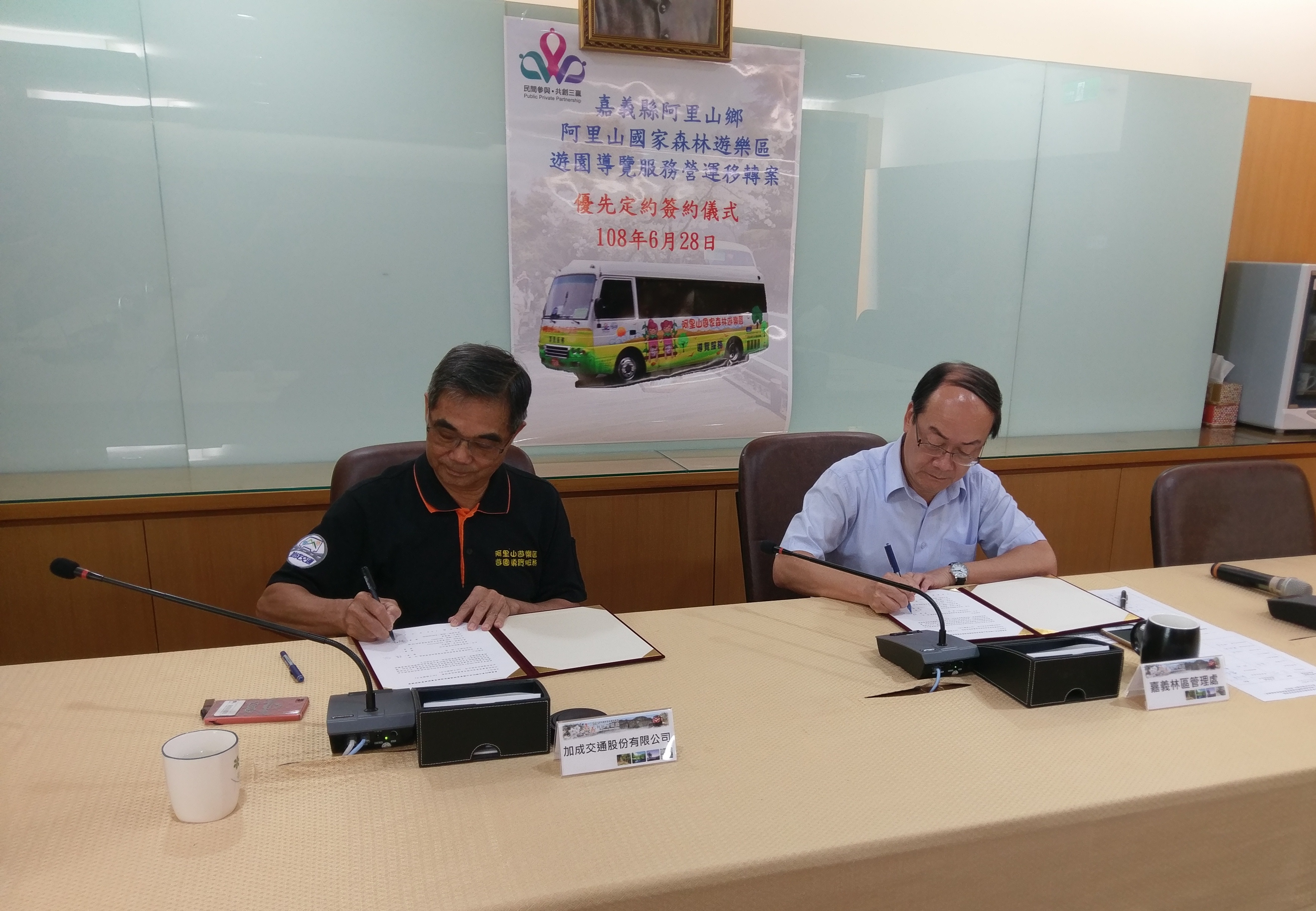 林務局嘉義林區管理處於103年7月依促進民間參與公共建設法,委託加成交通股份有限公司營運阿里山國家森林遊樂區內遊園導覽服務,契約即將屆滿,該公司營運績效良好取得優先定約資格,且經行政院農業委員會同意授權,雙方由林管處張岱處長及加成公司阿里山營業所鄭榮華董事長代表,於今(28)日完成簽約。 阿里山國家森林遊樂區自104年4月成功通過高海拔、高濕度及坡度等考驗,全面採用電動中型巴士作為遊園導覽車種,每年可減少322.75公噸的碳排放量,創造低碳、環保、綠能的阿里山。林管處與加成公司公私協力營運成果顯著,更於105年榮獲財政部第14屆民間參與公共建設金擘獎-政府機關團隊獎、民間經營團隊獎之優等獎的肯定,本次簽約代表政府機構與民間企業持續攜手合作,期許再提升阿里山的旅遊品質,共創公部門、民間企業與遊客三贏的未來。 炎炎夏日,歡迎民眾前往阿里山國家森林遊樂區避暑,除了可造訪全台最高海拔電動車的祝山林道秘境,與迷霧中的王者-帝雉相遇,漫步於高山植物園及具備360度環繞視野的小笠原山觀景台,亦可前往姊妹潭、沼平公園、詩詞步道、櫻之道(天空步道),享受清靜森林浴,或選擇沿著三代木步道往舟之橋方向前行,聆聽阿里山溪支流演奏出的自然樂章,夏季的阿里山提供您不一樣的風貌,園區提供多樣遊程建議,遊客可上山林悠遊網查詢。