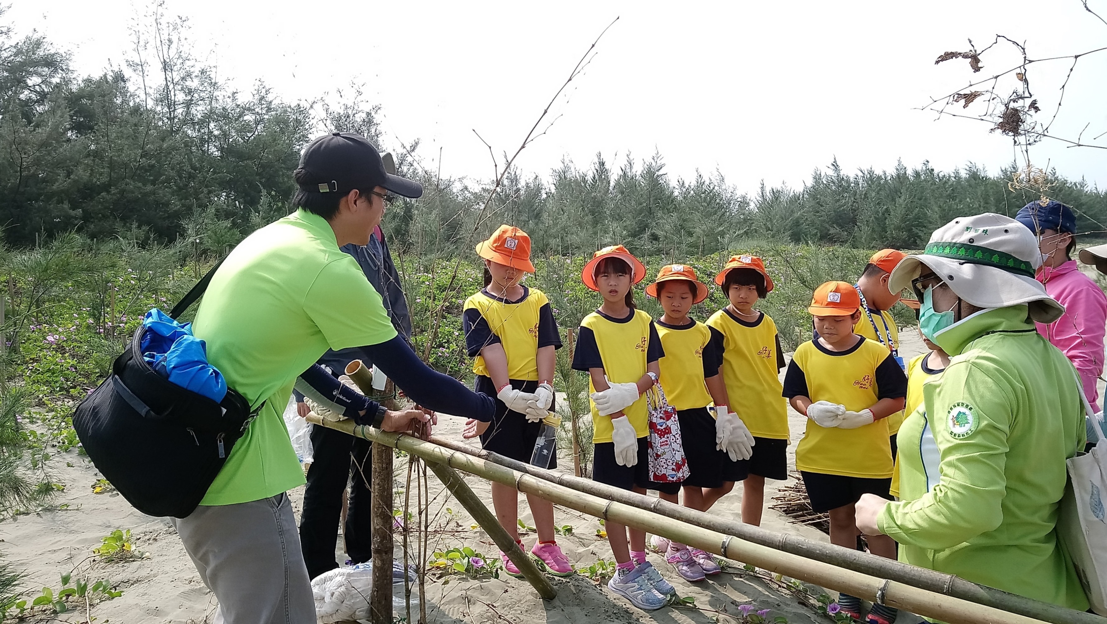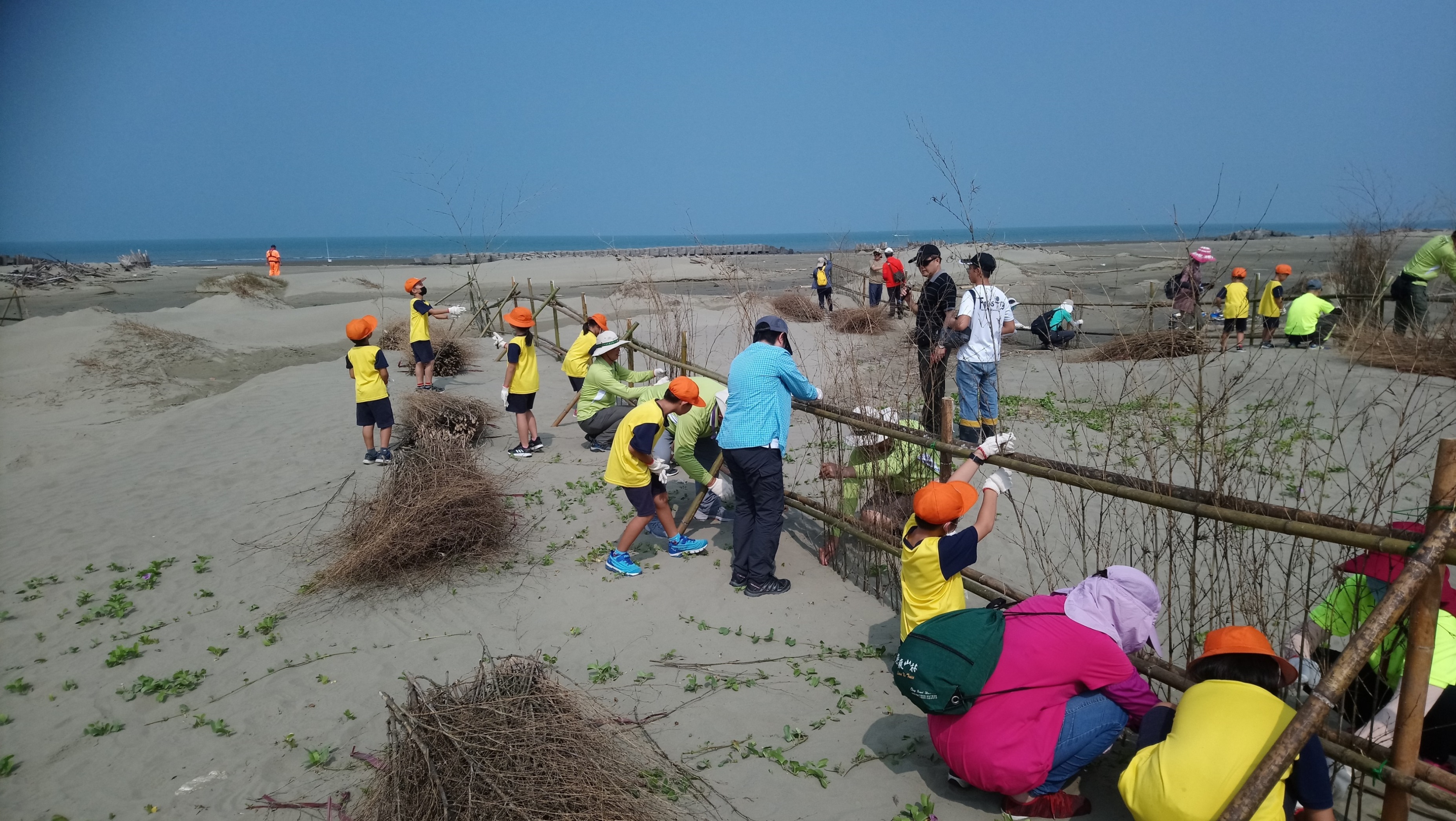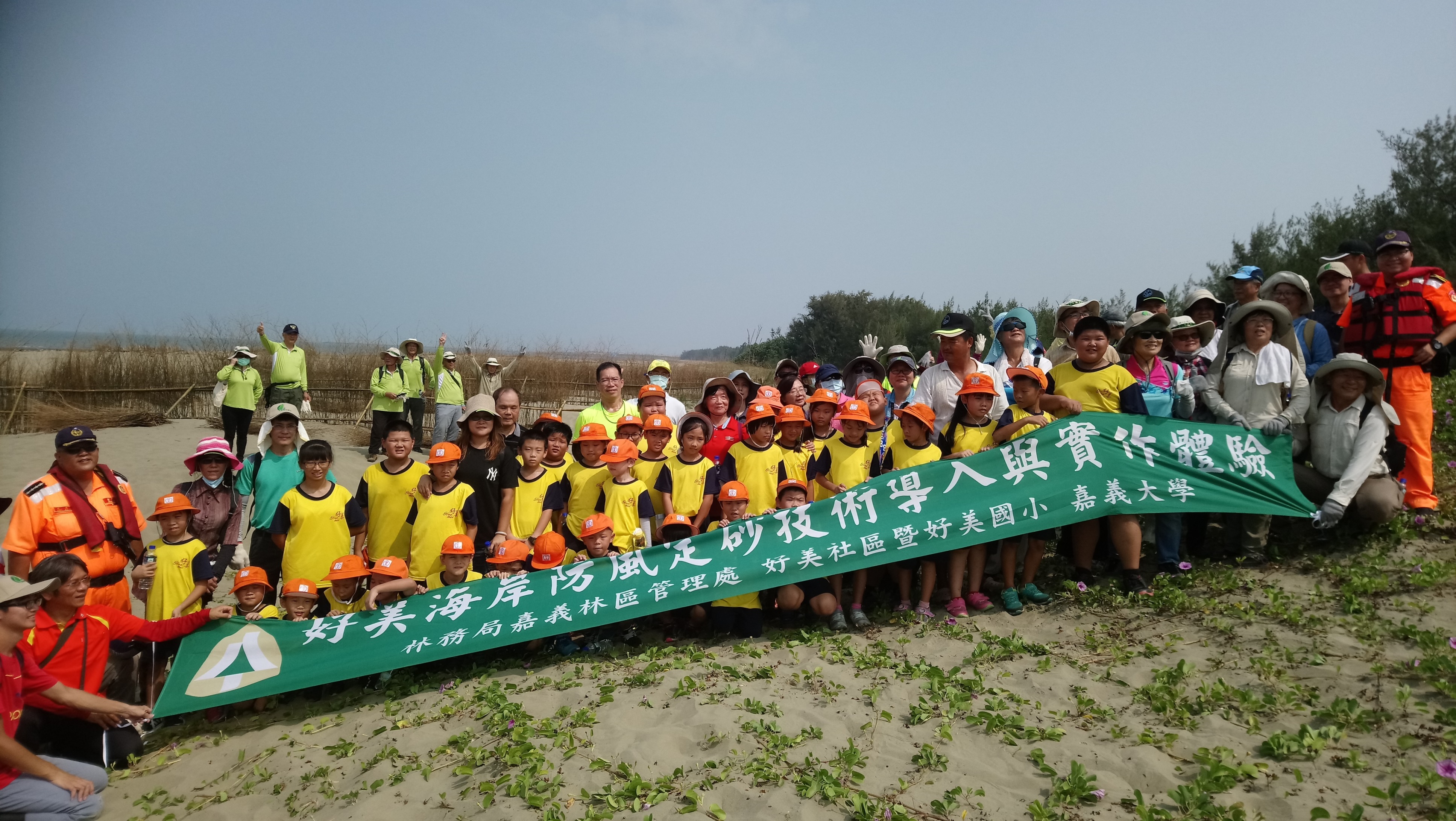 為力挽消失迅速的布袋好美沙灘,林務局嘉義林區管理處結合在地海岸志工隊、好美國小師生及志工計130人,今(5)日在好美國小進行海岸防風定砂技術導入研習,接著前往好美海岸沙灘實地體驗沙丘生態,並親手以竹芒編織堆砂籬,眾人合力完成150公尺長的堆砂籬,期待攔截東北季風帶來的漂砂,營造海岸沙丘自然防禦系統。 與在地人攜手在地關心事 在地耆老蔡信得表示, 60年代茂密的第一線防風林寬達數百公尺,需走約2、30分鐘才能穿越到海邊捕撈,幾經滄海桑田現在防風林已没入海中,於是號召在地志工隊主動堆砂、植樹定砂,讓海岸沙灘一點一點長回來,以往没經費都以克難方式用廢棄蚵架堆在沙灘,嘉義林管處接管區外保安林之後號召其他單位及好美國小師生一起來,並提供堆砂籬材料,在地人十足有感。好美國小校長蔡瑞芳表示,108課綱核心素養,就是將學到的技能落實在生活中,孩子雖然能力小,但也可以為社區盡一份心力,這才是社區認同。 持續進行成果顯現 嘉義林管處處長張岱表示,在地海岸志工隊於編號第1920號飛砂防止保安林外緣第一線沙灘自動自發堆砂、造林已進行好幾年,林管處與在地合作,這些年來堆砂、造林相當成功,今年6月在復育砂丘0.15公頃新植造林木麻黃成活率達99%,最高已達2公尺高,西南海岸流失的速度迅速,林務局十分重視保安林的保安效果,也持續與民間及在地學校攜手保安林各項經營管理,歡迎企業及公部門、團體一起來關心好美保安林