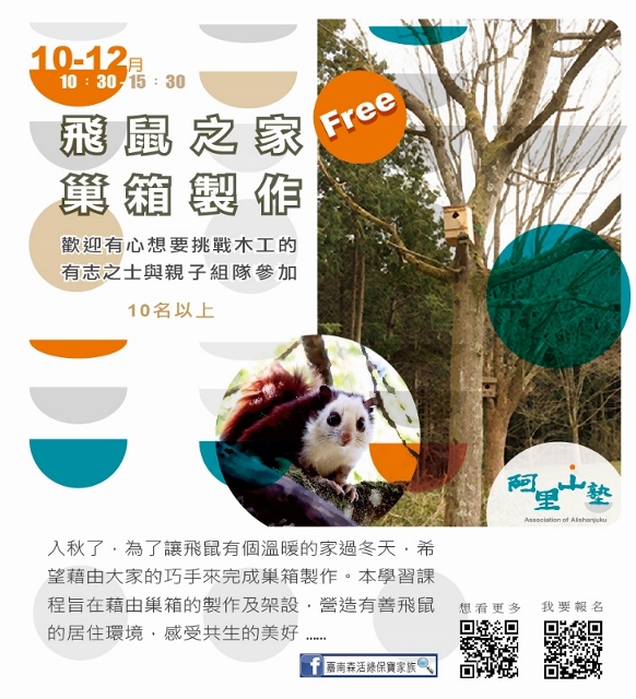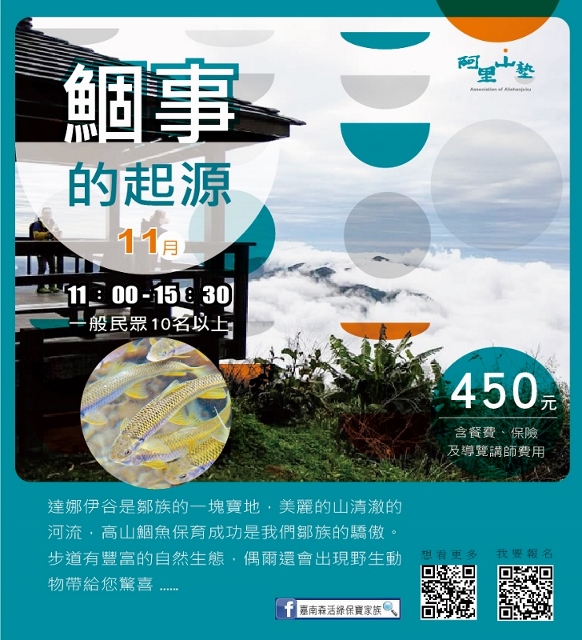 林務局嘉義林管處與阿里山地區的茶山、草山、山美、公興、緞繻及里佳等6個社區合作,自10月底至12月底,推出13種阿里山塾體驗活動,邀請大家來體驗阿里山不同海拔的山村生活與生態。「嘉南森活綠保寶家族」粉絲專頁告訴您更多活動訊息!(https://www.facebook.com/Greenforestry/) 阿里山塾每項體驗活動均由社區最在地的森林達人,帶領大家認識嘉義山區的森林植物特色,運用各種植物特性發展出來的山林生活智慧,透過手與植物的接觸,感受深耕於里山精神的在地知識。 讓您驚奇的里山生活智慧! 此次合作的社區包含阿里山地區3個鄒族部落與3個閩客社區,各自推出2至3個體驗活動,社區夥伴引領大家尋找冰原歷險記中,鼠奎特一直鍥而不捨的石櫟種子,或是徜徉充滿芬多精的杉木林中,感受香氛迷霧,或是跟著農家體驗芋頭、咖啡、山薑的農事管理工作,還可以了解山美達娜伊谷鯝事的起源和飛鼠的家! 嘉義林管處張岱處長表示,林務局近年來推動山村綠色經濟永續發展計畫,以追求社會與自然和諧共處的里山倡議精神,輔導山村發展林下經濟、友善農業、生態旅遊等兼顧生態、生產、生活的永續發展模式。嘉義林管處自去年起,盤點阿里山地區部落與社區的里山生活年曆,配合山村生活的節奏,於今年10月底起,優先推出6個社區13種體驗活動,開辦阿里山塾,建立都市與山村交流的平台,提供一般民眾參與山林生活與工作的機會,歡迎家庭團體,親朋好友一同報名參加,感受隨著四季脈動的生活智慧與步調。更多活動訊息請至「嘉南森活綠保寶家族」粉絲專頁查詢!(https://www.facebook.com/Greenforestry/)