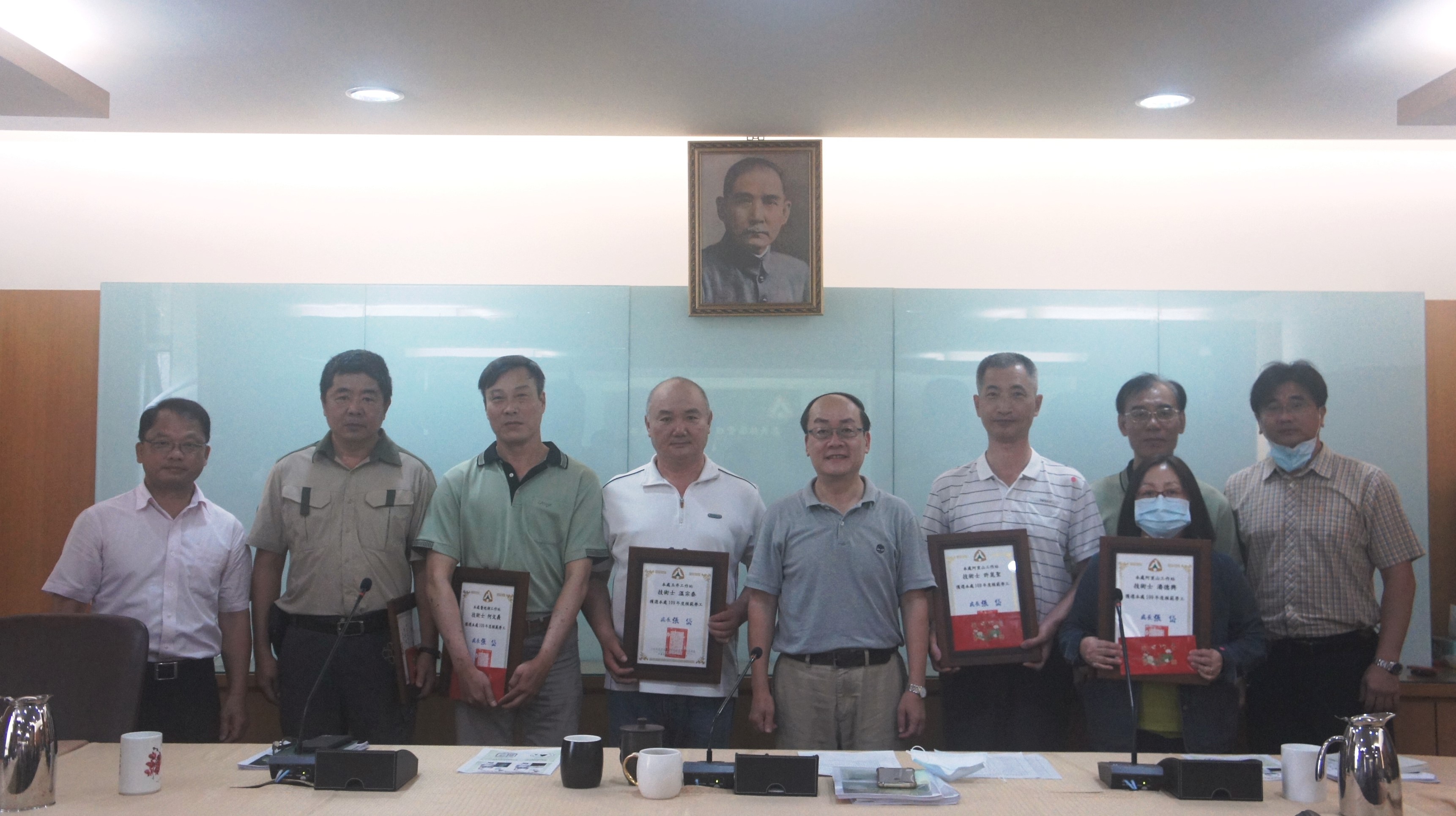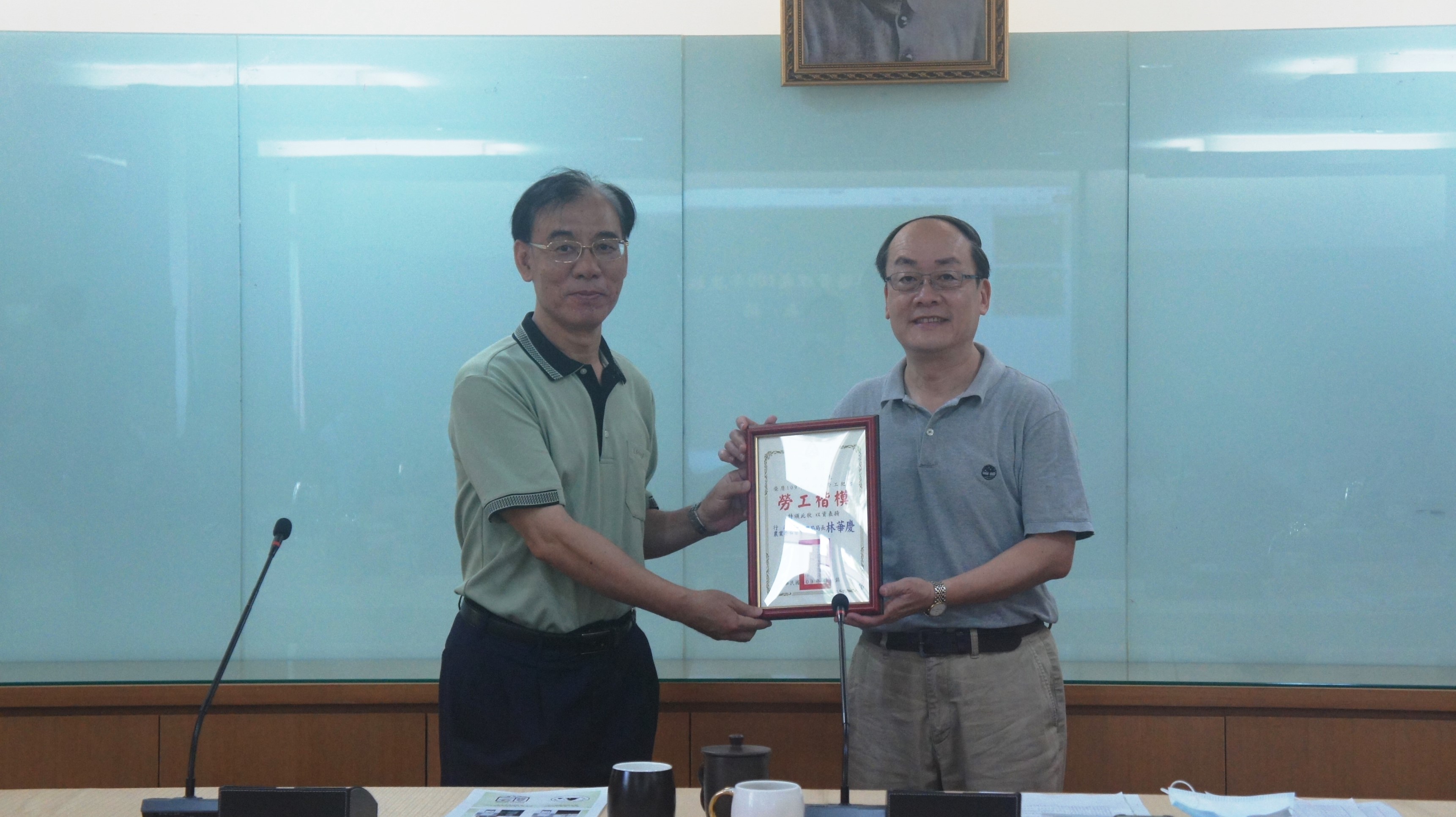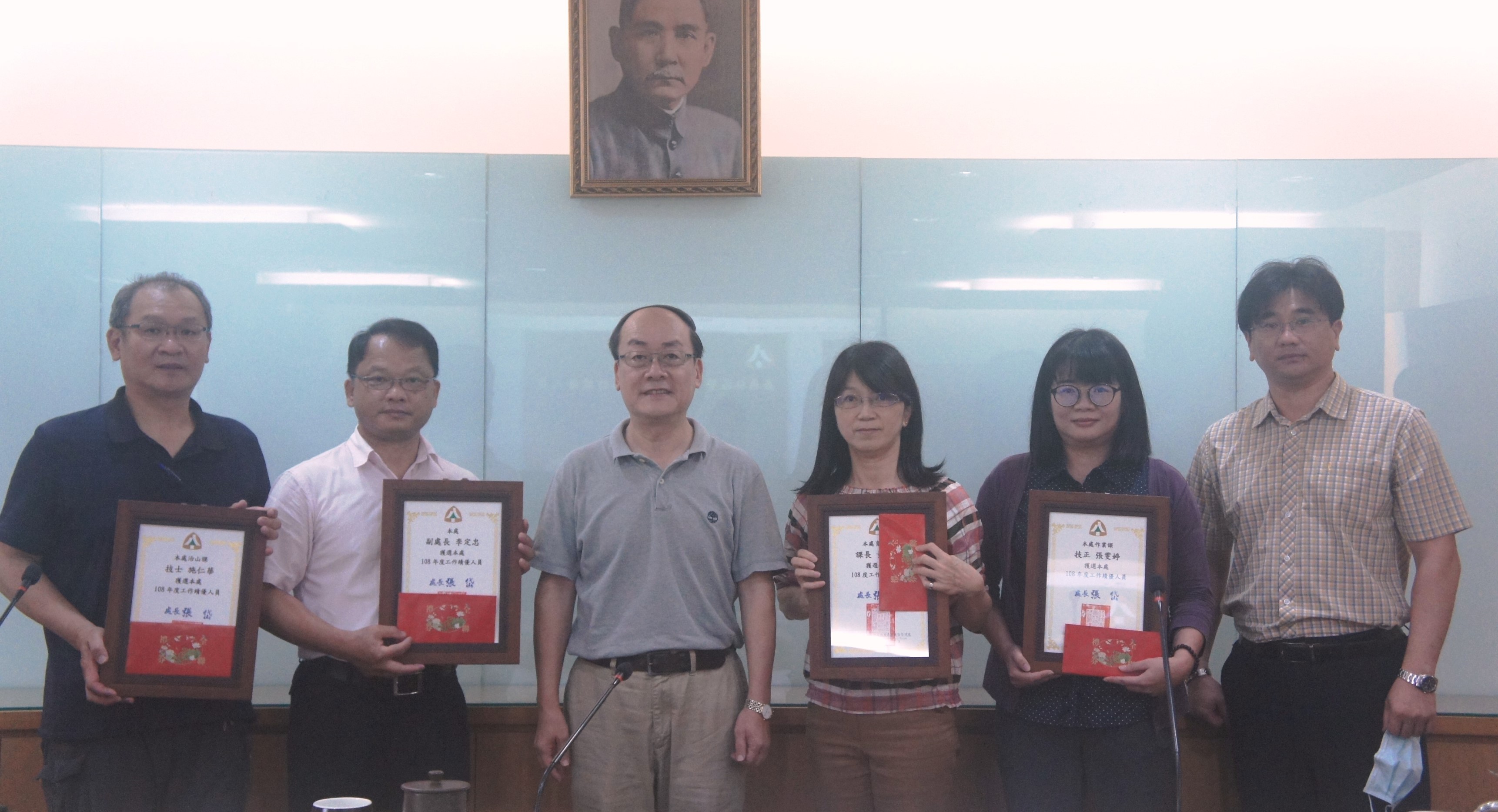 為慶祝「五一勞動節」,行政院農業委員會林務局嘉義林管處於本(109)年4月20日公開表揚109年度模範勞工及108年度工作績優人員,由處長張岱親自頒發獎狀及獎品給獲獎人,嘉許同仁的用心與奉獻。 獲頒模範勞工共計6人:技術士凃○俊、許○聖、溫○泰、何○義、呂○浚及潘○興。技術士凃○俊,承辦林地治理防災工程及民眾陳情案件;經辦的整治工程囊括公共工程金質獎、優良農業建設工程獎等多項獎項,成果豐碩。今年度更於眾多優秀勞工競選中脫穎而出,獲選全國模範勞工。 獲頒工作績優人員共計4人:副處長李定忠、課長黃○緞、技士施○華及技正張○婷。近年來嘉義林管處在各項業務推動上迭創佳績,包括開發文創商品、完善國家森林遊樂園區服務、防災整治工程獲獎、導入FSC森林認證及推動原民合作,本年度甫完成簽訂原住民族智慧財產權同意使用授權工作,保障原住民族的文化與精神。 張處長除恭賀每位獲獎人外,並表示每位獲獎同仁都是多年辛勤耕耘,獲獎可謂實至名歸;未來將持續利用各種機會表揚優秀同仁,希望給予表現傑出的同仁肯定與掌聲。