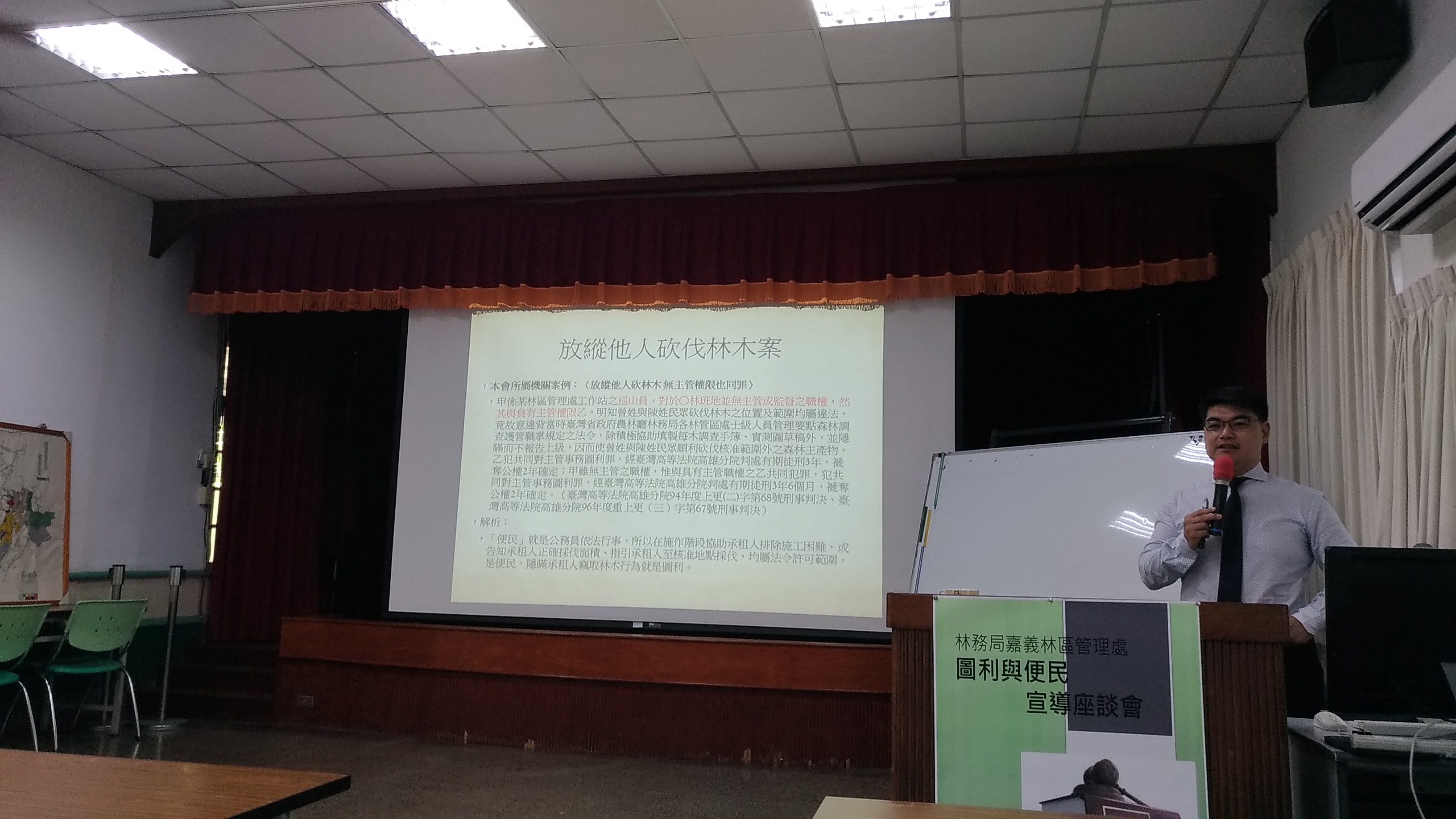 林務局嘉義林管處業務面向十分多元,為民服務的機會相當多,為加強同仁正確法律認知,林管處特別於109年6月20日(六)邀請臺灣嘉義地方檢察署陳昱奉檢察官蒞臨「圖利」與「便民」宣導座談會,為同仁講解「圖利」與「便民」如何區分,透過相關法令的適用、法律效果等概念的介紹,以及相關案例研討,有效持續深化同仁廉政法治教育。 林管處張岱處長強調,第一線的同仁在面對民眾的要求與期待時,要如何在合於法律的規範下提供便民的服務,有時候只是一線之隔,若稍有偏差,不只對個人或機關聲譽產生損害,連帶著也會造成民眾對於公務部門的不信任,所以林管處對於同仁最基本的要求就是依法行政,希望同仁能發揮勇於任事的精神,做好各項林務工作,提升為民服務的效能。
