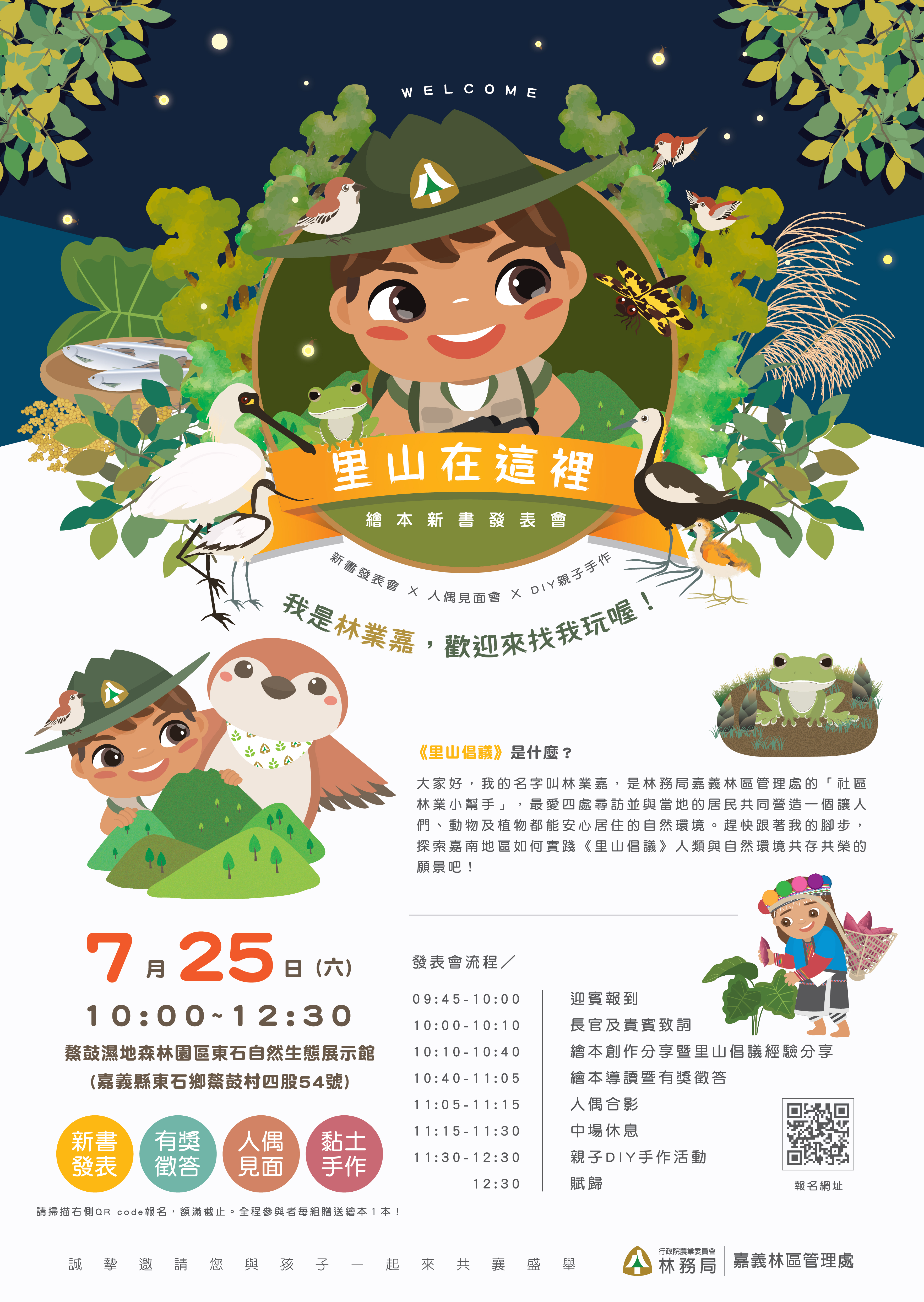 林務局嘉義林區管理處委託逢甲大學專業團隊,推出《里山在這裡》繪本合輯,將於109年7月25日在鰲鼓濕地森林園區東石自然生態展示館舉辦新書發表會。活動於7月13日上午9點開始報名,歡迎對自然生態、里山倡議有興趣的親子家庭踴躍參加。 什麼是里山 里山一詞源自日文,里山生活本質,在於重拾人類與土地的和諧關係。2010年在日本舉辦的聯合國第十屆生物多樣性公約締約國大會啟動《里山倡議國際夥伴關係網絡》,提出里山倡議指的是高山與平原之間,森林、社區與農業生態系構成的地景,是實現社會與自然和諧共生的理想,以永續利用的方式來管理土地和自然資源,達到兼顧生物多樣性維護與資源永續利用的願景。 社區林業小幫手「林業嘉」 為了讓里山的精神從小札根,嘉義林區管理處以繪本形式,搭配書中主人翁社區林業小幫手「林業嘉」、輔以童趣圖像及深入淺出的文字,推出《里山在這裡》繪本合輯,收錄阿里山鄒族傳統生活、頂笨仔聚落、水雉生態教育園區、上林社區、鰲鼓濕地森林園區、臺南市巴克禮紀念公園等地經驗。一起跟著「林業嘉」的腳步看看社區夥伴們是如何實踐里山倡議的精神。繪本除了有生動的主題故事外,繪本末頁還有「給家長的話」導讀知識頁,簡要說明故事源起背景,方便家長為孩子導讀,適合國小3年以上學童閱讀。 活動介紹 想更完整瞭解繪本精彩內容,一定不能錯過「里山在這裡新書發表會」。本活動將於109年7月25日(星期六)上午10時,於鰲鼓濕地森林園區東石自然生態展示館辦理。當天除了邀請繪本創作團隊、繪本設計師及社區夥伴分享創作及里山倡議實踐心得之外,更邀請繪本設計師徐千舜為大家導讀。設計師徐千舜才華洋溢,曾為知名兒童節目主持人千千姐姐,將以活潑生動的方式為觀眾導讀。還有可愛山麻雀人偶吉祥物合照與里山動物DIY黏土手作活動,歡迎有興趣的親子家庭報名,報名日期自7月13日(星期一)上午9時開始,限額15組,額滿為止!成功報名且全程參與者,每組可獲得精美小禮物及限量版繪本1本。(報名連結已過期)活動詳請上鰲鼓濕地森林園區臉書粉絲專頁查詢,相關問題請洽育樂課05-2787006分機148江小姐。無法參加現場活動的民眾,如想認識里山也可於國家書店及五南書局的實體店面及網站購買繪本。