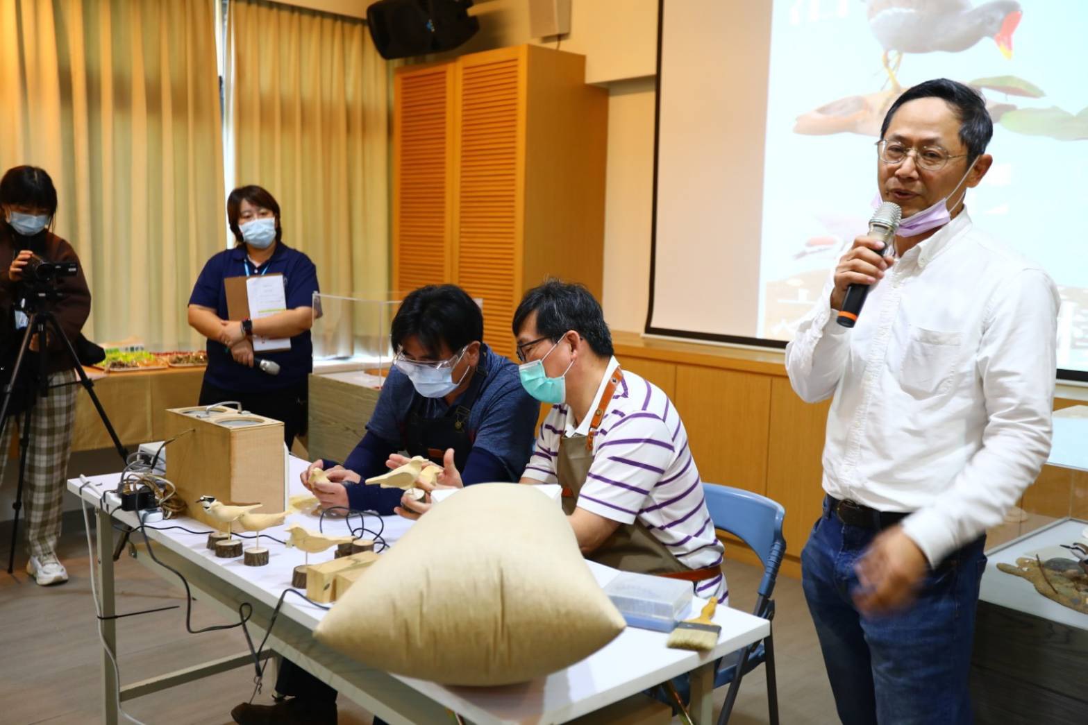 林務局嘉義林區管理處於今日(2月26日)在鰲鼓濕地森林園區東石自然生態展示館邀請國家級鳥類木雕大師-李宜融及黃麟鳴2位老師辦理聯展開幕。現場除了鄰近周邊的國小及幼兒園師生參與,還邀請到貴賓台北野鳥學會張瑞麟理事長、嘉義縣野鳥學會李灌霖總幹事、黃金蝙蝠生態館張恆嘉館長、水雉生態園區李文珍主任到場共襄盛舉,大小朋友看著維妙維肖的木雕品,下午在戶外彩繪木雕鴨、解放壓力,現場約80幾人參與、座無虛席,讓大家直呼過癮。 現場共展出42件鳥類木雕作品,不乏數件得過日本Bird caving大賞的作品。黃麟鳴老師更與鄭秘書共同手作示範木雕鳥的過程,並由李宜融老師搭配即時解說,也讓現場參加民眾了解製作過程、並開放即時問答;下午更接續彩繪木雕鴨,讓遊客化身木雕藝術家、親自製作自己獨有的「鳥媒」,現場氣氛熱絡好不熱鬧。 嘉義林管處秘書鄭鈞謄致詞時更表示,木雕鳥的角色原本是北美州作為鳥媒,吸引鳥類聚集增加獵人收穫,而隨著時代推衍,在現代逐漸轉變,而更有保育的價值,對自然生態有興趣的民眾一起來走訪鰲鼓濕地,展覽期間自今日起至6月20日止, 歡迎大家細細品味作品中蘊藏的生態之美。