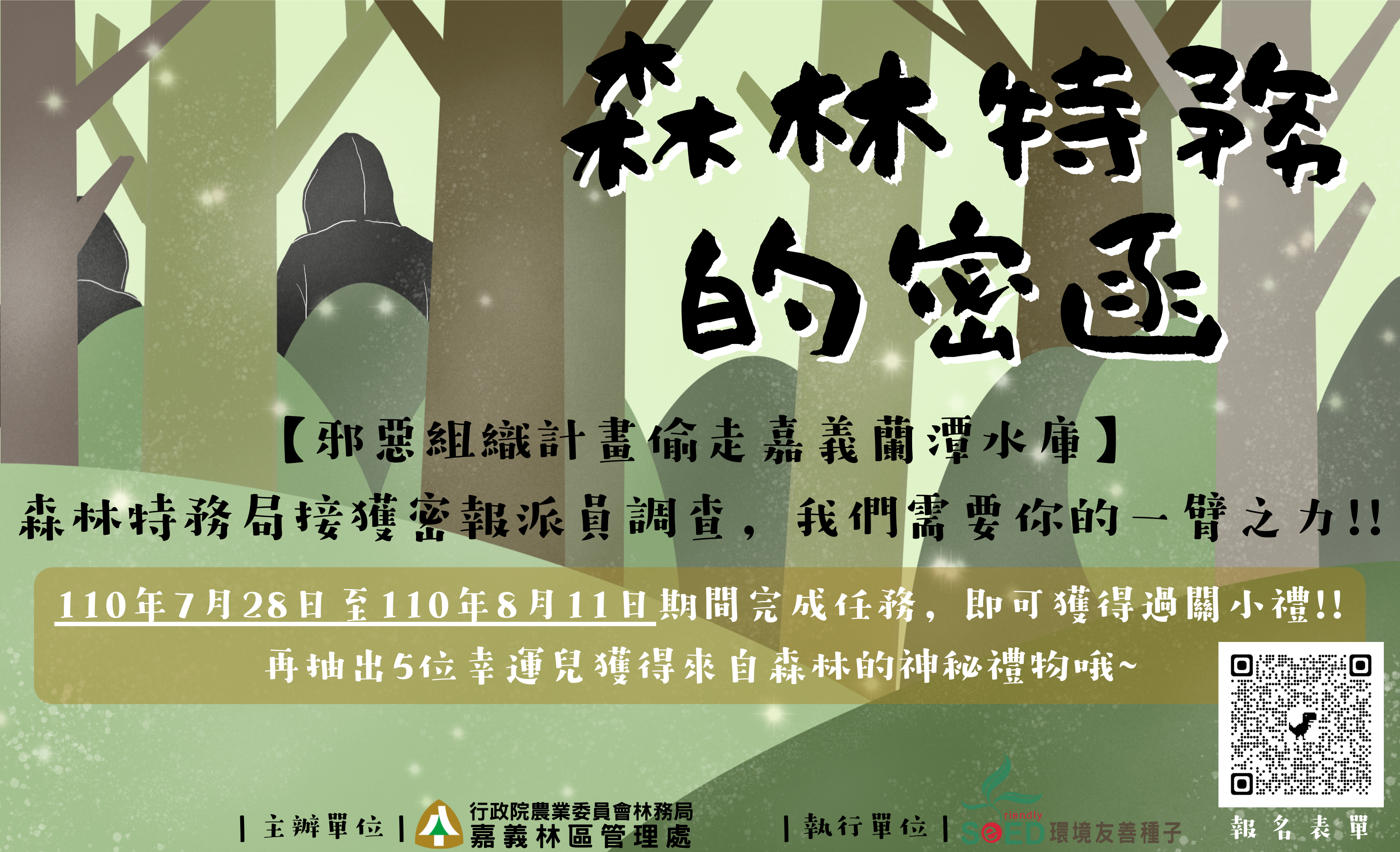 嘉義林管處以蘭潭周邊保安林的環境與功能進行設計,結合LINE@平台的便利性與操作,運用影片、圖片等素材,推出「森林特務的密函」線上解謎活動。透過劇情引導,讓民眾一步步了解保安林的重要性以及編號第1924號保安林的功能,搭配各種線索解開保安林謎題,深入認識保安林與蘭潭水庫間的關係。活動期間完成所有謎題並上傳過關截圖及問卷,即可獲得林管處特別準備的森林小物。活動截止後將再加碼抽出五名幸運民眾,贈送限量好評的阿里山DIY貼紙化妝包、臺灣杉手機架、臺灣杉黑熊杯架及四季玻璃杯。
