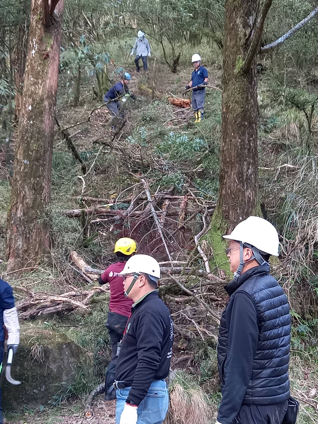 林管處3月5日號召玉山國家公園管理處、國立臺灣大學生物資源暨農學院實驗林管處、國家森林志工、台灣千里步道協會、大亞集團旗下大亞電纜美麗家園基金會企業志工,以手作步道的方式修繕新高口旁玉山林道,手作步道是一種強調融合自然的工法,使用現地天然素材。本次活動完成了砌石駁坎、砌石截水溝、沖蝕溝處設置消能木結構、陡坡踏點、砌石階梯、亂石堆整理,讓山友行走更加順暢安全,另封掉幾處捷徑,避免棲地切割破碎化。
