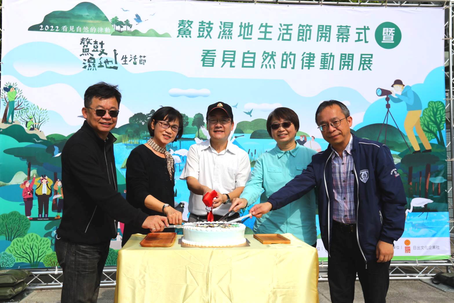 林務局嘉義林區管理處今(10)日上午,在鰲鼓濕地森林園區舉辦「2022鰲鼓濕地生活節」開幕活動,由處長張岱與貴賓們共同切下蛋糕,歡慶鰲鼓濕地森林園區開園十週年。另外「看見自然的律動」開展,由林務局組長翁儷芯、嘉義林管處處長張岱、嘉義縣東石鄉公所秘書蔡武憲等人一同揭牌開幕,象徵鰲鼓濕地生態保育及在地人文歷史的教育邁向新的里程碑。