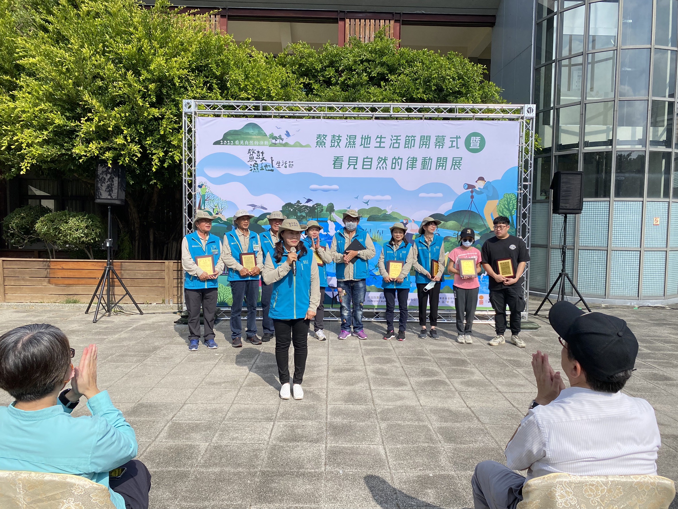 嘉義林管處培訓之鰲鼓濕地解說服務團隊,每年均會密集的進行濕地巡守及環境監測,共同維護鰲鼓濕地資源、景觀及環境,為感謝在地12位解說員10年來的付出,林管處特別頒發感謝狀。解說服務團隊成立之初也同步設立「東石鄉環境保育及社會公益基金」,將所得的解說費用撥出一定金額作為港口、四股及鰲鼓社區發展協會的社區公益基金,造就在地解說員回饋在地社區的美事。