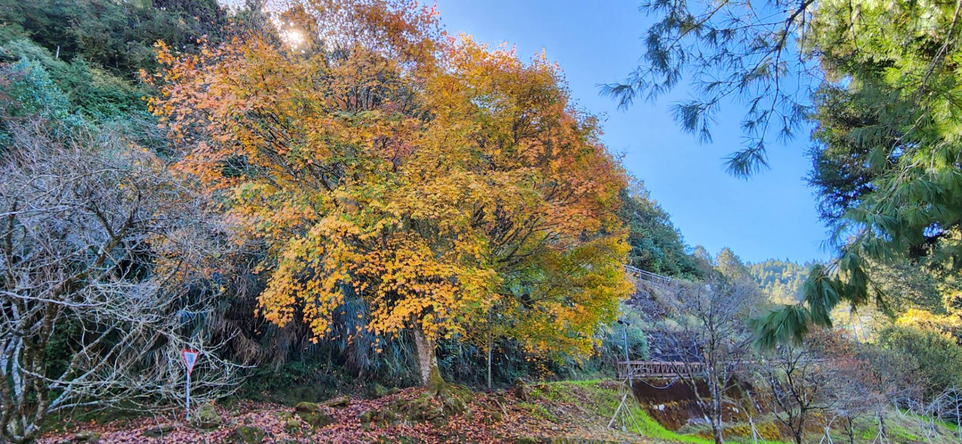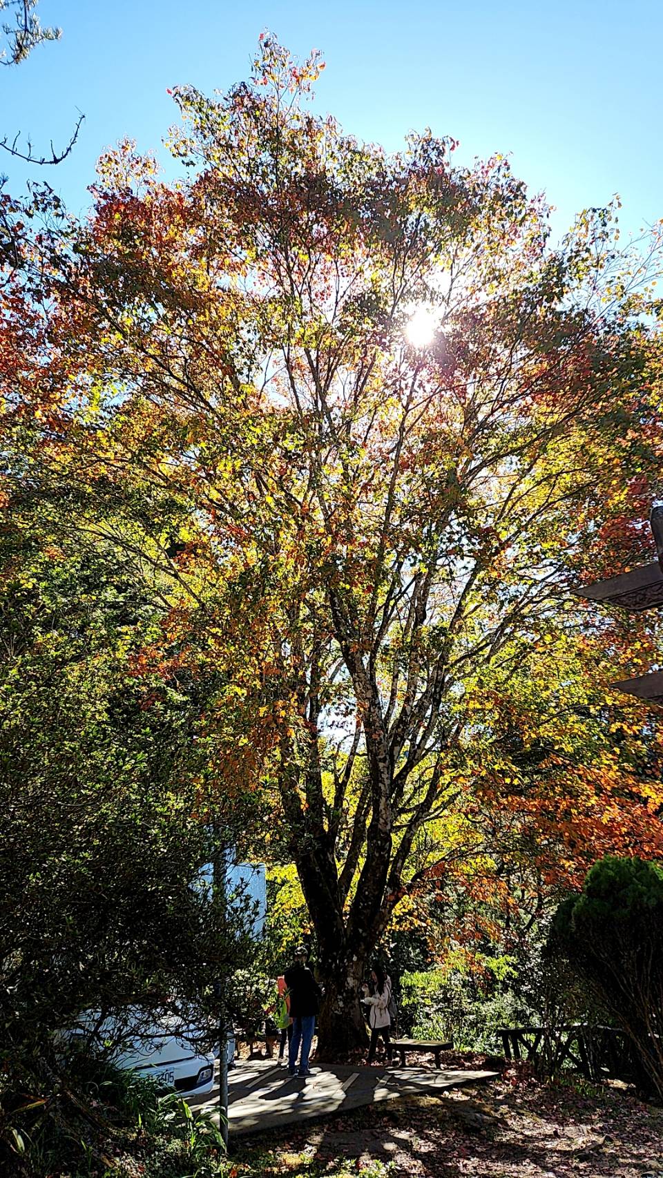 入冬以來,寒流次次發威,林務局嘉義林區管理處所轄阿里山國家森林遊樂區氣溫已降至5度以下,清晨甚至出現0度低溫。因氣候乾燥寒冷,晴朗無雲,藍天楓紅相映。遊樂區慈雲寺前不只有金黃銀杏、古鐘樓前青楓透著陽光映照出綠黃橙紅漸變色彩,為阿里山美拍秘境。目前遊樂區內楓紅已近八成,除慈雲寺外,推薦觀葉景點包括小笠原觀景平台(臺灣紅榨楓)楓紅已近八成,落葉鋪成精緻紅毯、大客車迴轉區前方斜坡(青楓)及祝山平台(臺灣紅榨楓、青楓)均轉黃紅,為遊樂區妝點歡慶金色耶誕節。