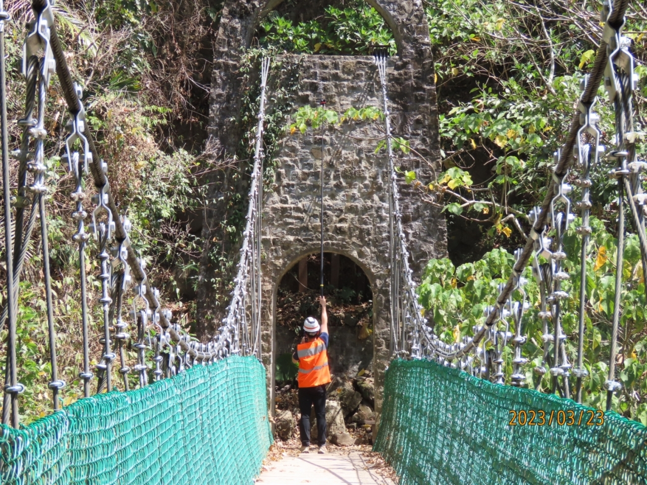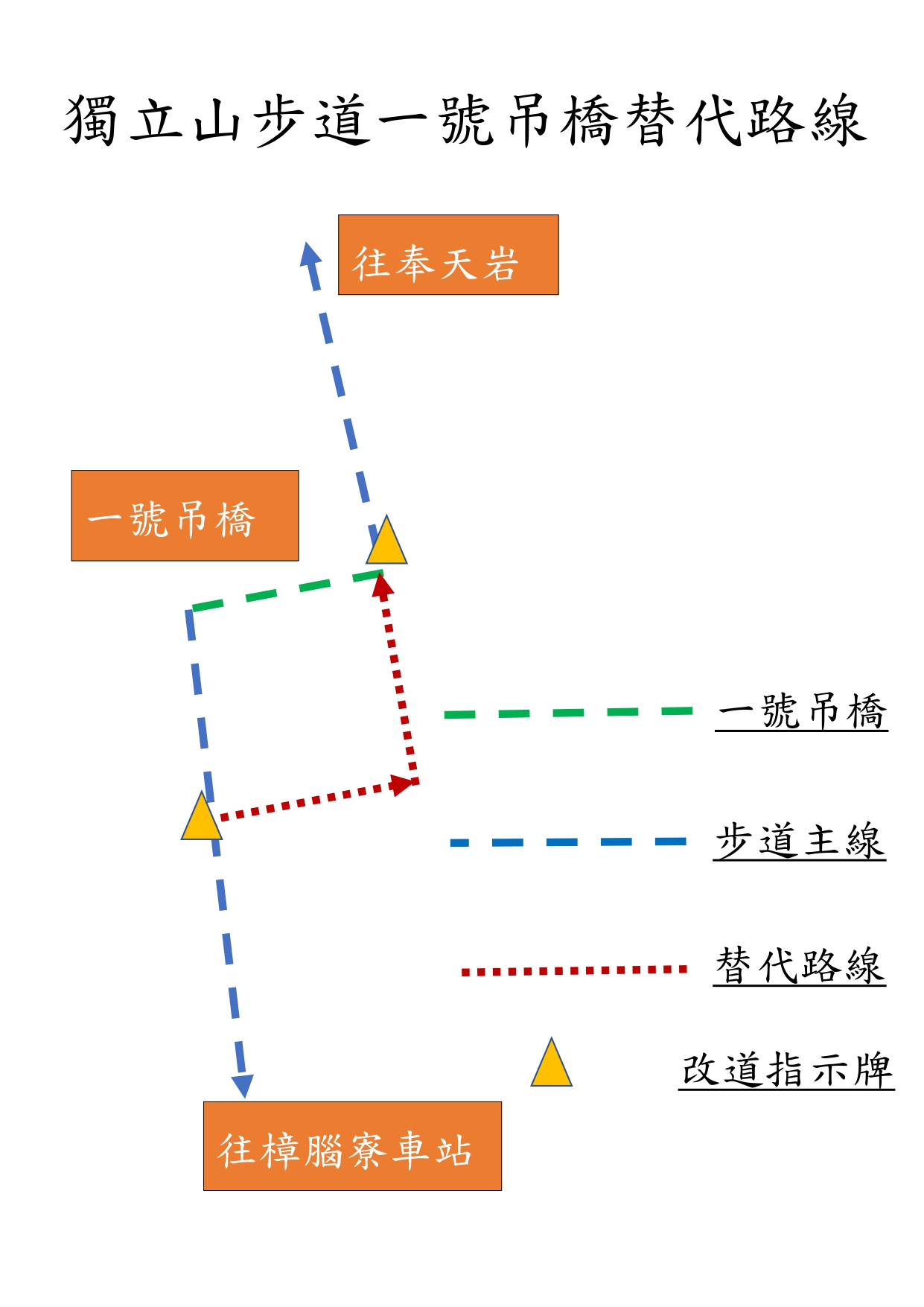 位於嘉義縣竹崎鄉全長5公里老少咸宜廣受民眾歡迎的獨立山步道,前段地勢較為平坦共有2座吊橋,後段則為陡上的枕木階梯,因步道橋樑已興建近20年,其中1號吊橋經林務局嘉義林區管理處委託專業檢測公司進行安全檢測,發現其構件主索等已有劣化現象,林管處為確保遊客通行安全,預計自即日起暫時封閉1號吊橋進行橋樑整修,整修期間在吊橋下方闢有臨時便道,供遊憩民眾通行,明(113)年5月工程完成將再重新開放服務山友。