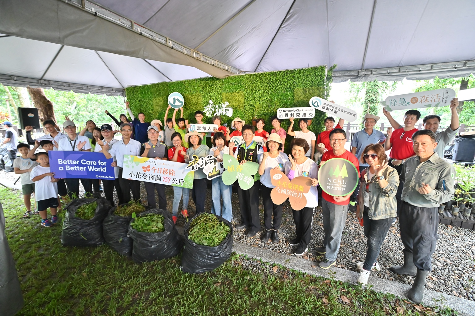 今日(9月2日)是一年一度「小花蔓澤蘭全國防治日」,農業部林業及自然保育署王芳簡任技正及嘉義分署張岱分署長率同仁偕同國立中興大學農業暨自然資源學院實驗林管理處、臺南市政府、金百利克拉克臺灣分公司、富邦人壽、學校師生、國家森林志工及社區居民等計180人,在新化林場共同參與「香滿山野!除蔓新森活」除蔓宣導活動,讓民眾認識小花蔓澤蘭植物危害特性與了解防治移除的重要性,並展示小花蔓澤蘭多元創新利用產品。參與人員剷除小花蔓澤蘭共計757公斤,移除後空隙地栽種過山香等芳香植物,一同為保育臺灣生態環境共盡心力。