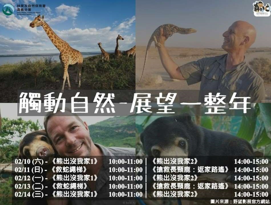 為迎接新年,嘉義分署觸口自然教育中心春節期間放映「救蛇繩梯」、「搶救長頸鹿:返家路遙」、「熊出沒我家1」、「熊出沒我家2」等4部自然紀錄片,讓民眾透過影像感受大自然奧妙之處,啟發人們對自然保育的熱忱。觀賞具深度的自然紀錄片,以知識展望新的一年也是走春的新選擇。相關活動資訊可至