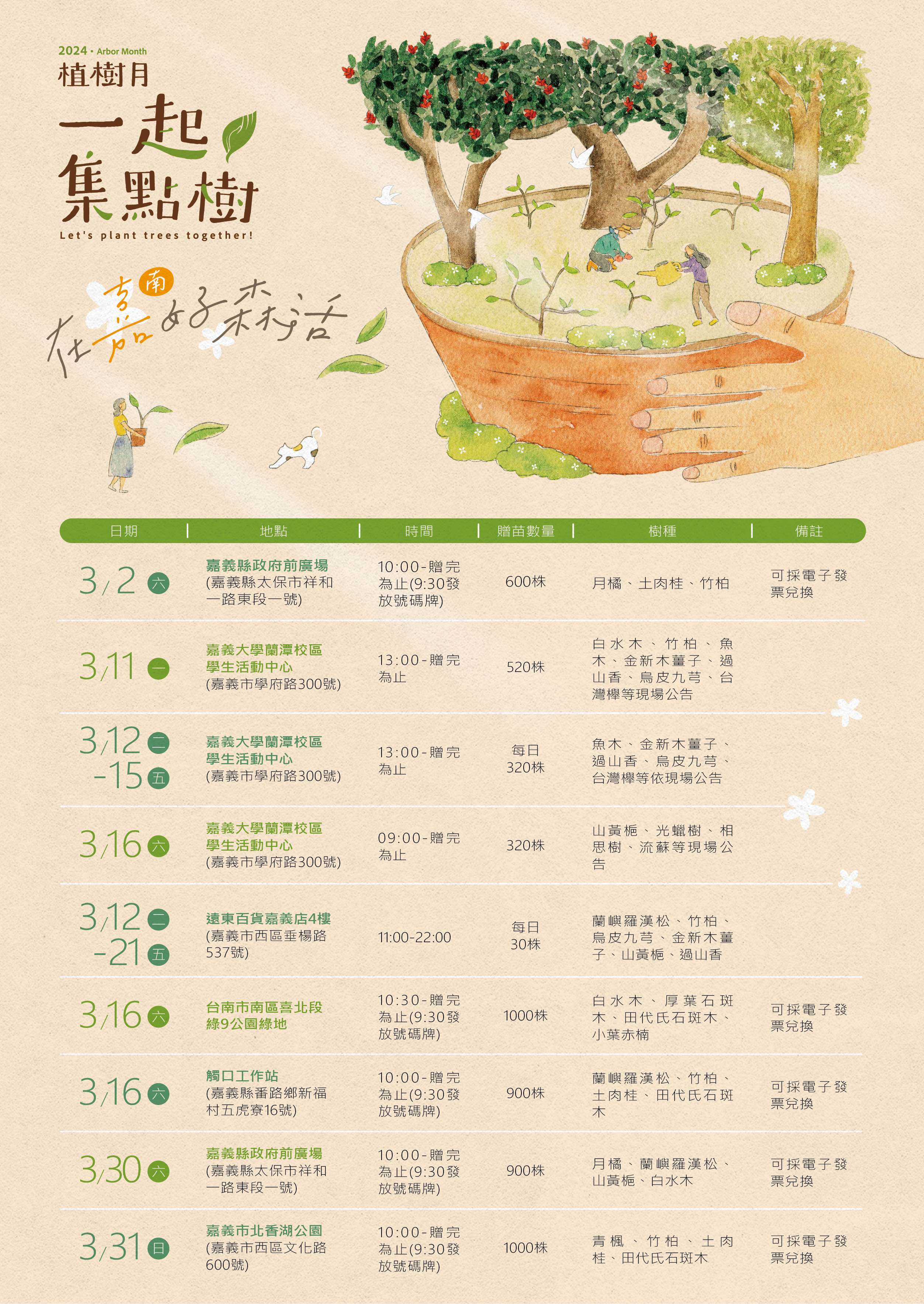農業部林業及自然保育署嘉義分署響應e時代潮流,今(113)年首次試辦線上登記預約苗木兌換,113年3月19日起開放2場次苗木兌換登記,兌換時間及地點分別為3月30日(六)嘉義縣政府前廣場(嘉有好市集)及3月31日(日)嘉義市北香湖公園廣場,限量400株,請至線上預約網址登記,登記期間至3月26日17時或額滿為止。