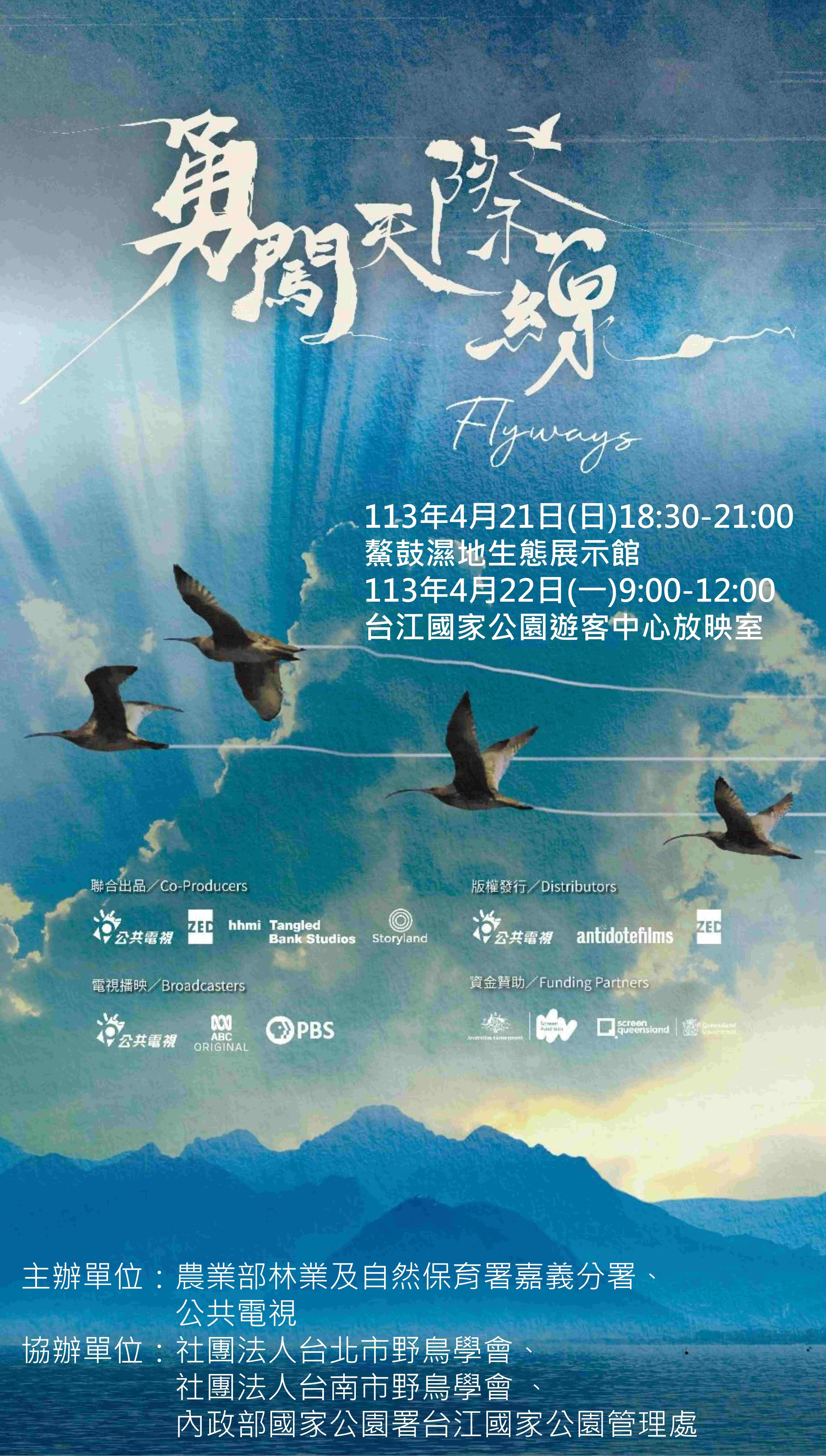 為推廣水鳥生態與濕地保育,林業及自然保育署嘉義分署將於4月21日世界杓鷸日晚間6點30分在鰲鼓濕地生態展示館播放《勇闖天際線》露天電影,4月22日世界地球日上午9點於台江國家公園遊客中心舉辦第2場次,活動皆免費參加,民眾即日起即可報名,放映會同時邀請公視影片製作人與資深鳥友進行映後分享,歡迎踴躍參加。