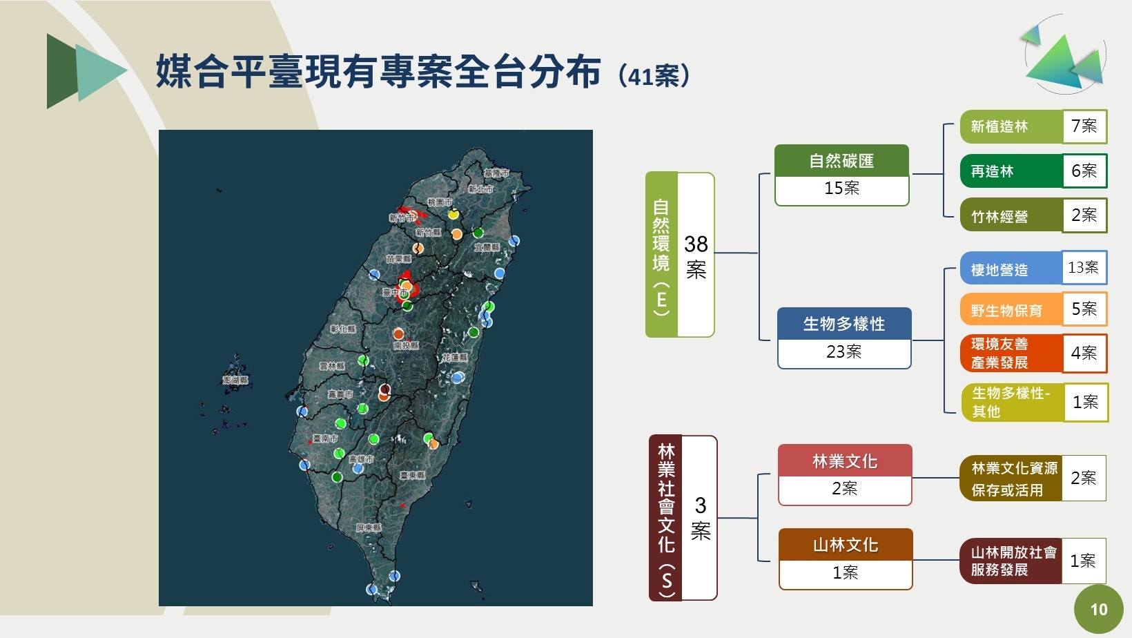 嘉義分署表示,目前階段媒合平臺規劃以國有林地為主,第二階段將規劃開放公、私有土地參與自然碳匯媒合機制,企業團體可利用ESG媒合平臺之媒合專區進行專案查詢,提供企業在參與ESG需求上之服務。目前專案媒合平臺上共計有41案專案,主要分為自然環境面與社會文化面兩大類型,嘉義分署自專案媒合平台上線後亦接獲企業界多方的詢問,該分署亦配合企業團體需求,進行專案之現地勘查,讓企業團體對於專業執行上之規劃能更貼切現況及達成更高效益,並結合當地社會夥伴,達成企業永續經營、企業社會責任落實的永續發展目標。