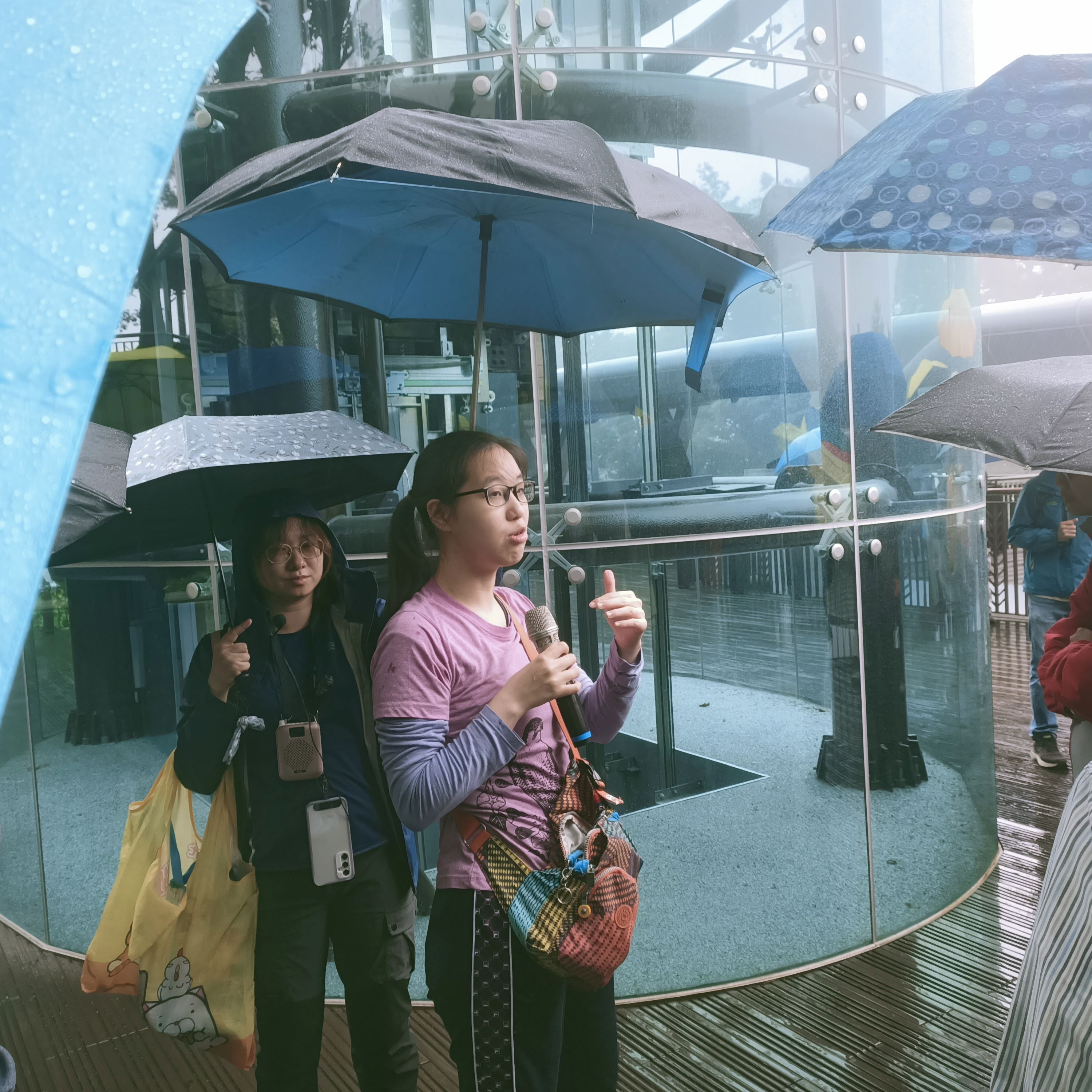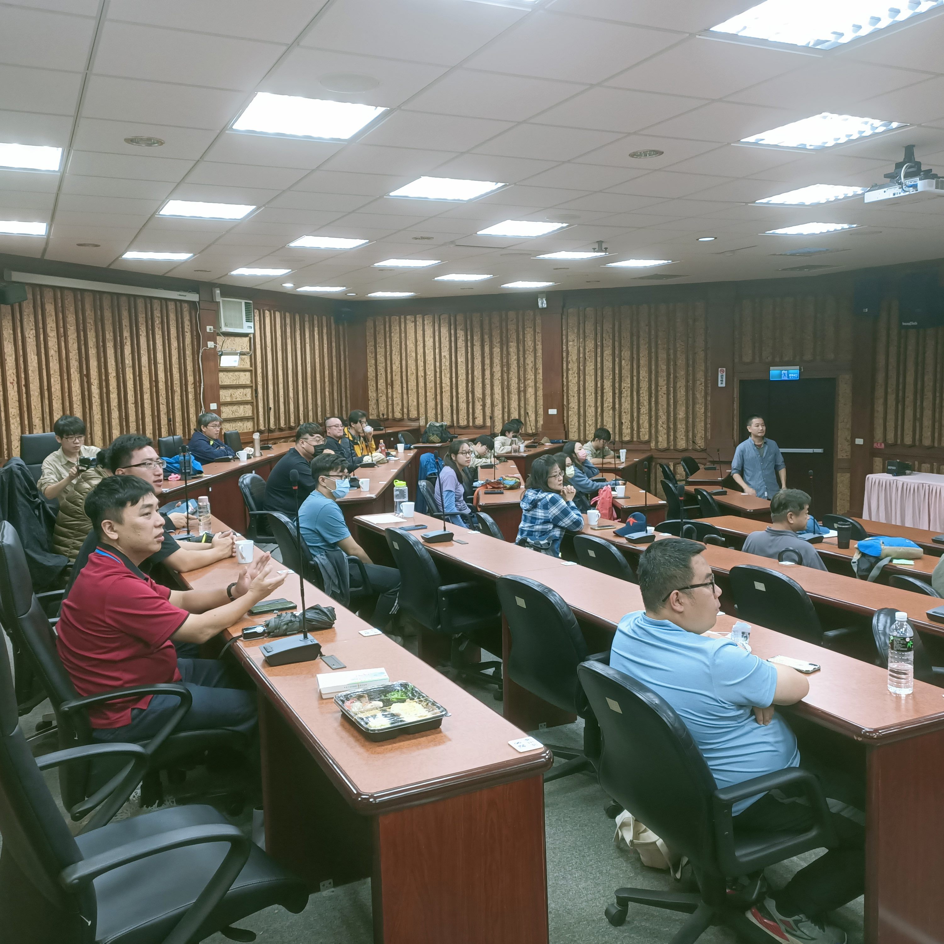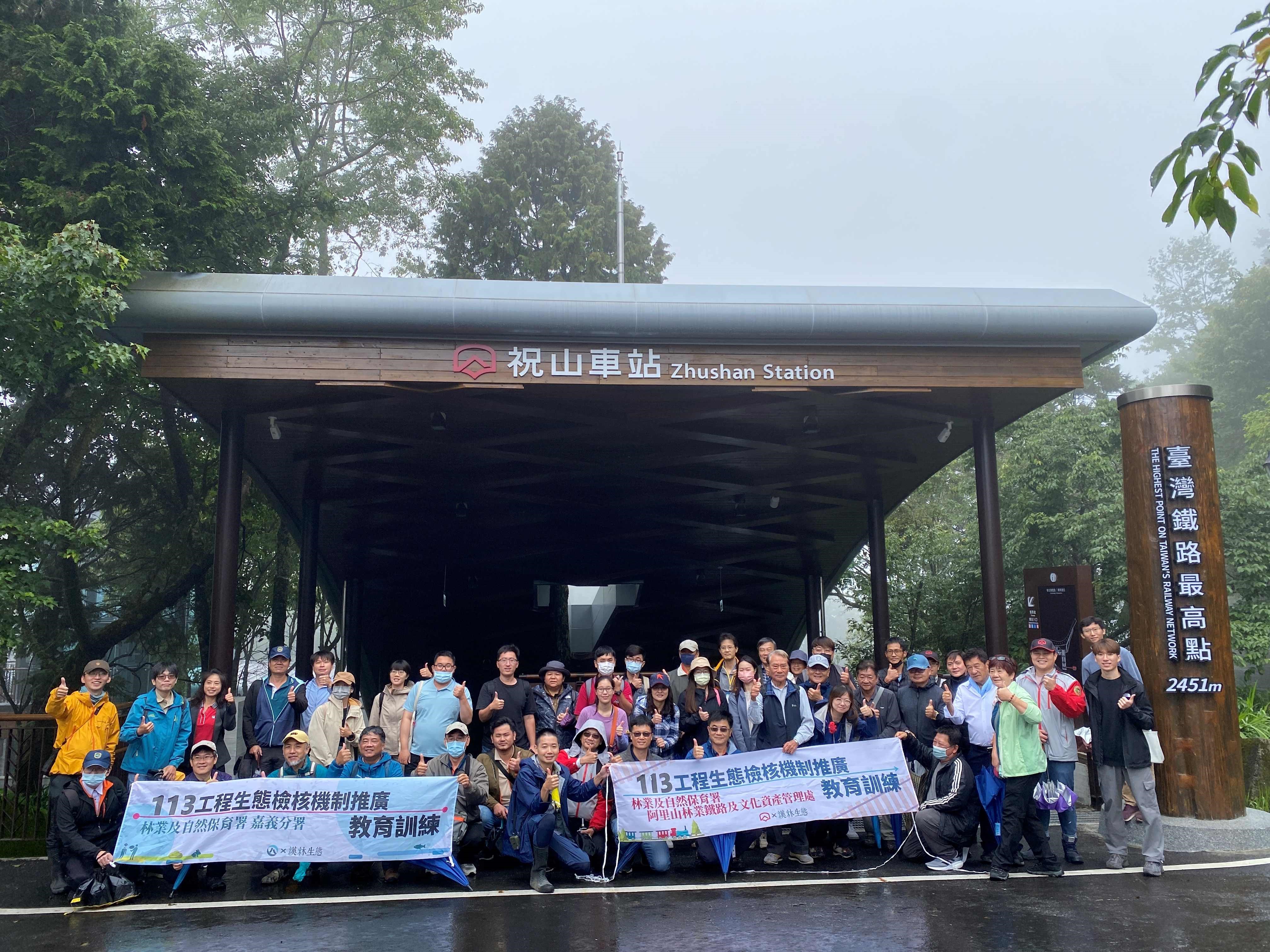 本次教育訓練場域有2處,為112年度榮獲第23屆公共工程金質獎特優的改建祝山車站,該車站充分利用自然的地形坡度,將車站棚頂從月台、車站前廳、主要階梯通道一直延伸到觀日涼亭,站體外觀於山林間創造多條美麗的弧線,交織成雲頂上最美的車站。其生態友善措施包含排水結構兼顧動物通行、降低鳥類撞擊玻璃帷幕風險、減少照明設備對生態環境之干擾、大樹保護及完工後植被回復,由講師講解野鳥窗殺議題,帶領學員評估車站電梯玻璃帷幕之窗殺風險,並介紹車站周圍排水設施之動物逃生通道。