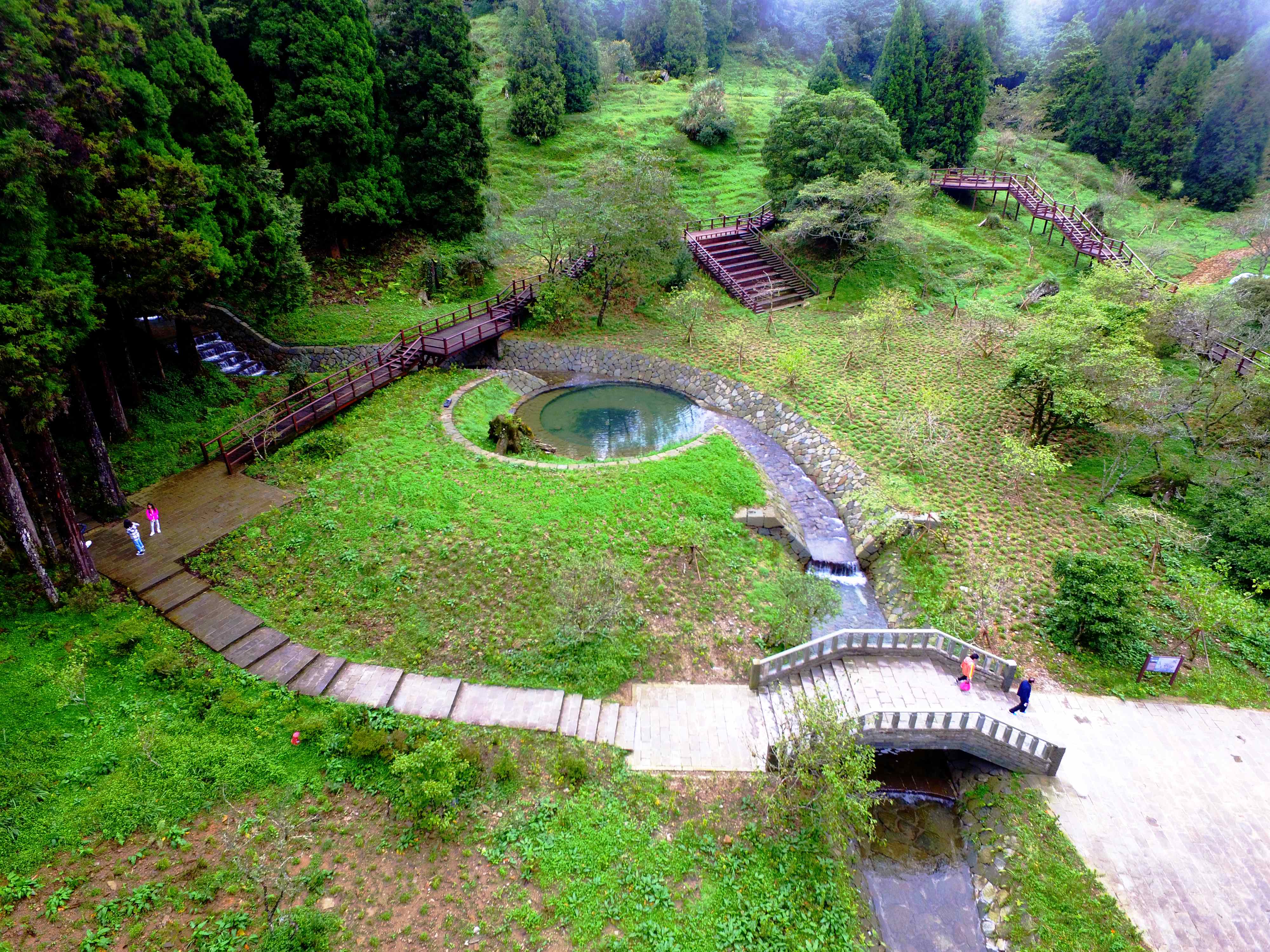 第2場域則為榮獲第19屆公共工程金質獎優等的阿里山森林遊樂區木蘭園排水改善工程,木蘭園區生態友善措施設置有具調節水流功能的生態靜水池及溪溝兩側護岸採漿砌石設計,具有多孔隙結構有利植生回復。園區呈現植被多樣且茂密,特別的是砌石護岸縫隙栽植高保育價值第一類的臺灣一葉蘭。由講師介紹該地生態友善措施、植生復育情形,並帶領學員觀察上游森林溪流環境,研討治理方案特點及再精進作為。