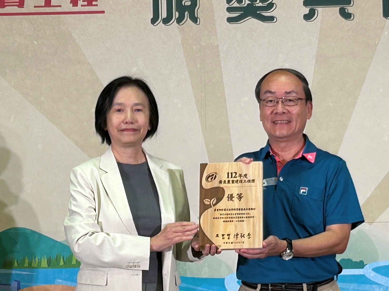 112年度優良農業建設工程獎於今(12)日在農業部舉行頒獎典禮,農業部林業及自然保育署嘉義分署長張岱率同仁及得獎廠商代表參與典禮,此次比賽嘉義分署共獲得5件優等及1件佳作,更勝去年成績,其中包括位於阿里山國家森林遊樂區的「縣定古蹟阿里山貴賓館整修工程」及「祝山林道沿線邊坡及路面改善工程」、保全嘉義縣番路鄉草山村及下游曾文水庫的「大埔區第56林班水源地邊坡崩塌治理工程」、保護關子嶺上游三重溪集水區及172市道的「芋園防砂治理工程」、復育臺南市六甲區175市道旁崩塌地的「六甲區第2007號防砂治理工程」,以及管控南化水庫與後堀溪上游土砂的「玉井區第65林班平坑土砂防治第三期工程」等6項工程。