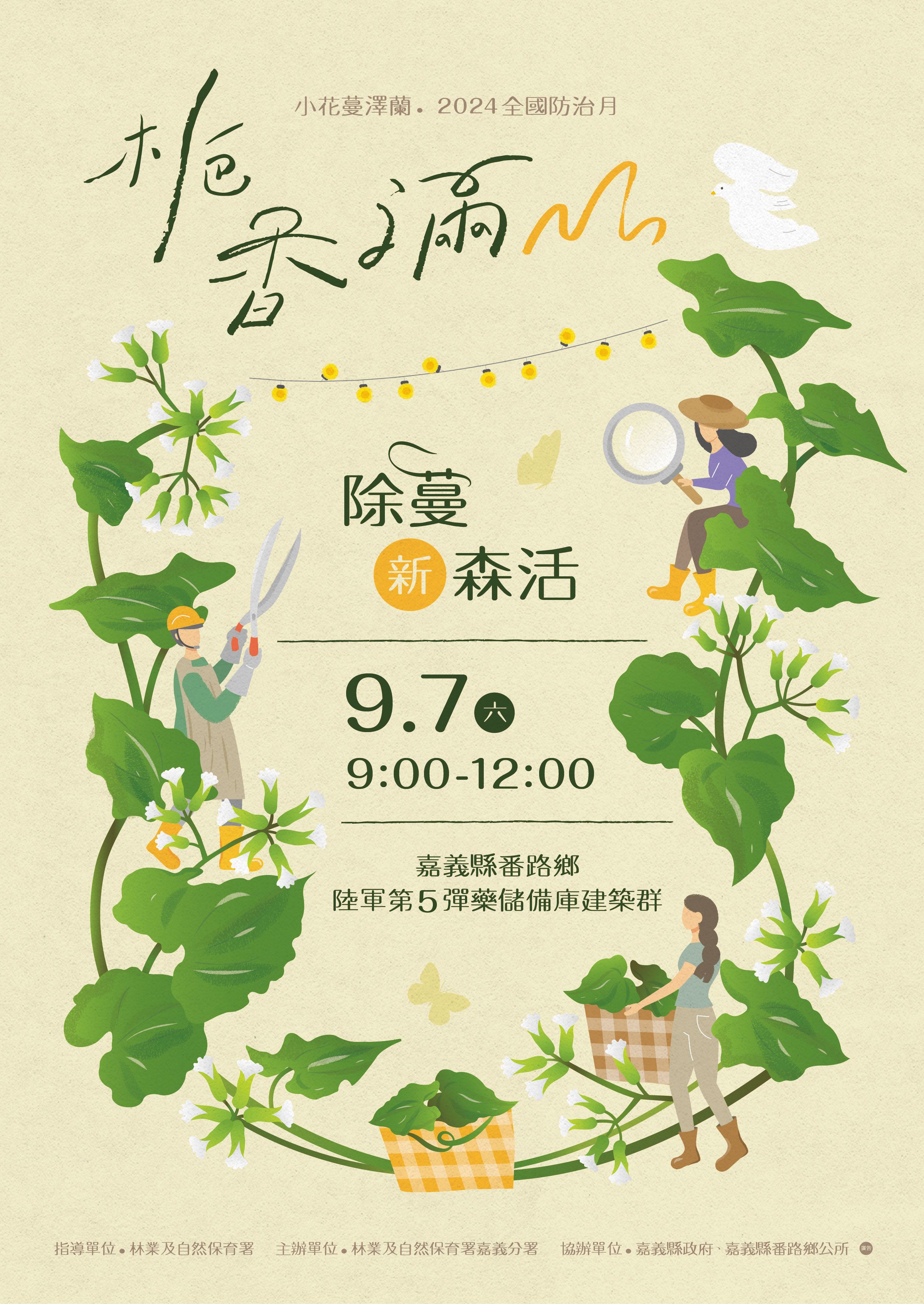 每年八、九月是移除小花蔓澤蘭最佳時節,農業部林業及自然保育署嘉義分署訂於113年9月7日在嘉義縣番路鄉陸軍第5彈藥儲備庫建築群舉辦「小花蔓澤蘭全國防治日」活動,邀請關心環境生態的朋友一起來除蔓護樹保育臺灣生態環境。
