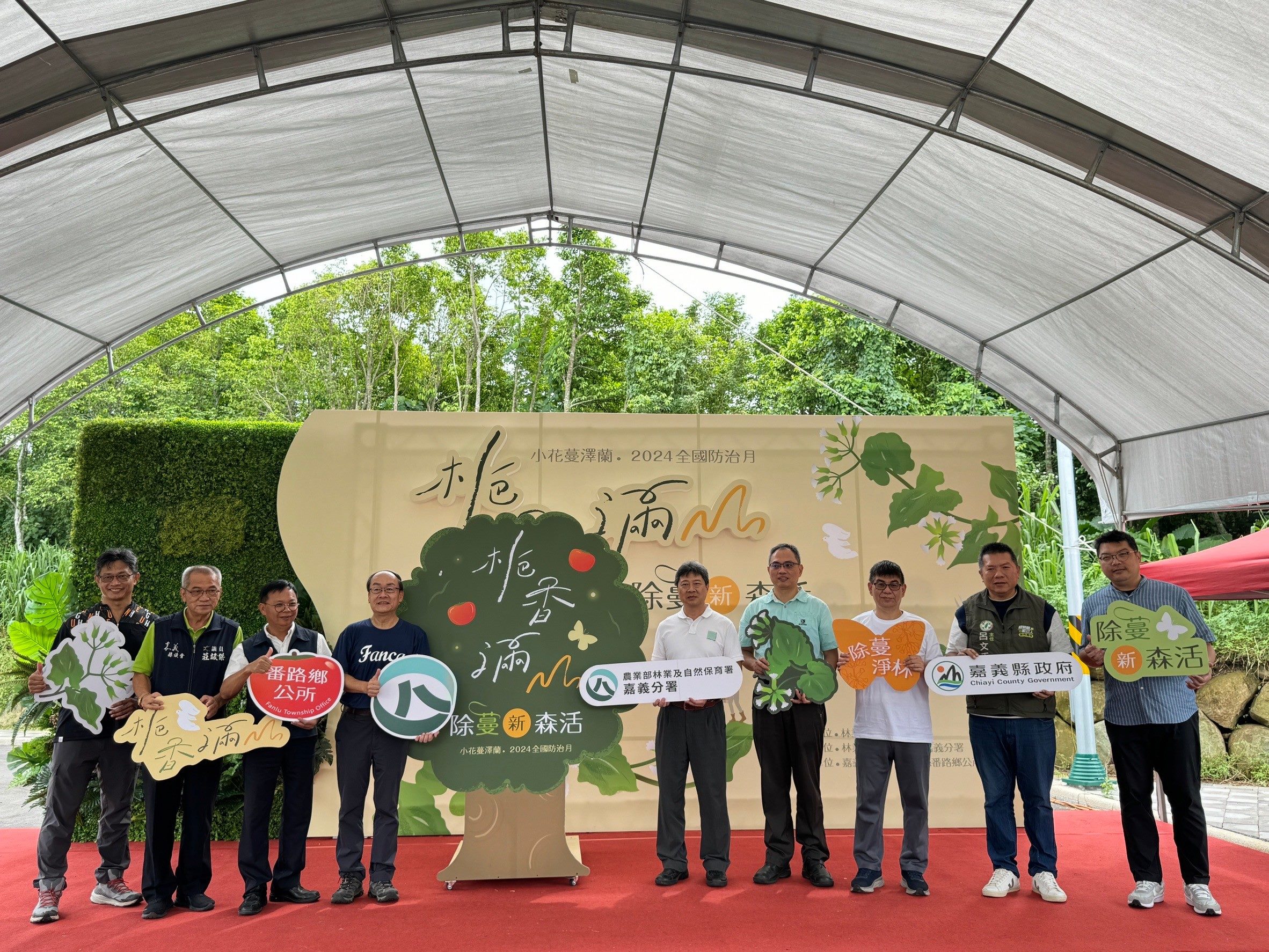 林業保育署嘉義分署表示,外來入侵植物-小花蔓澤蘭會攀附在樹上,影響植物行光合作用造成樹木死亡,因而有綠色殺手之稱,小花蔓澤蘭繁殖及傳播能力極強,須持續不斷防除避免再度蔓延,林業保育署訂定每年8月15日至9月15日為「小花蔓澤蘭防治月」,而9月份的第一個星期六是「小花蔓澤蘭全國防治日」,因此林業保育署嘉義分署也在今天邀請機關、企業、學校、森林志工公私協力共同移除番路鄉陸軍第5彈藥儲備庫建築群周遭環境的小花蔓澤蘭,工業技術研究院黃盈賓博士也在活動中發表近年小花蔓澤蘭多元利用成果,讓民眾了解小花蔓澤蘭也可廢物利用做成薰香驅蚊等用途,以及參與小花蔓澤蘭薰香DIY製作體驗。