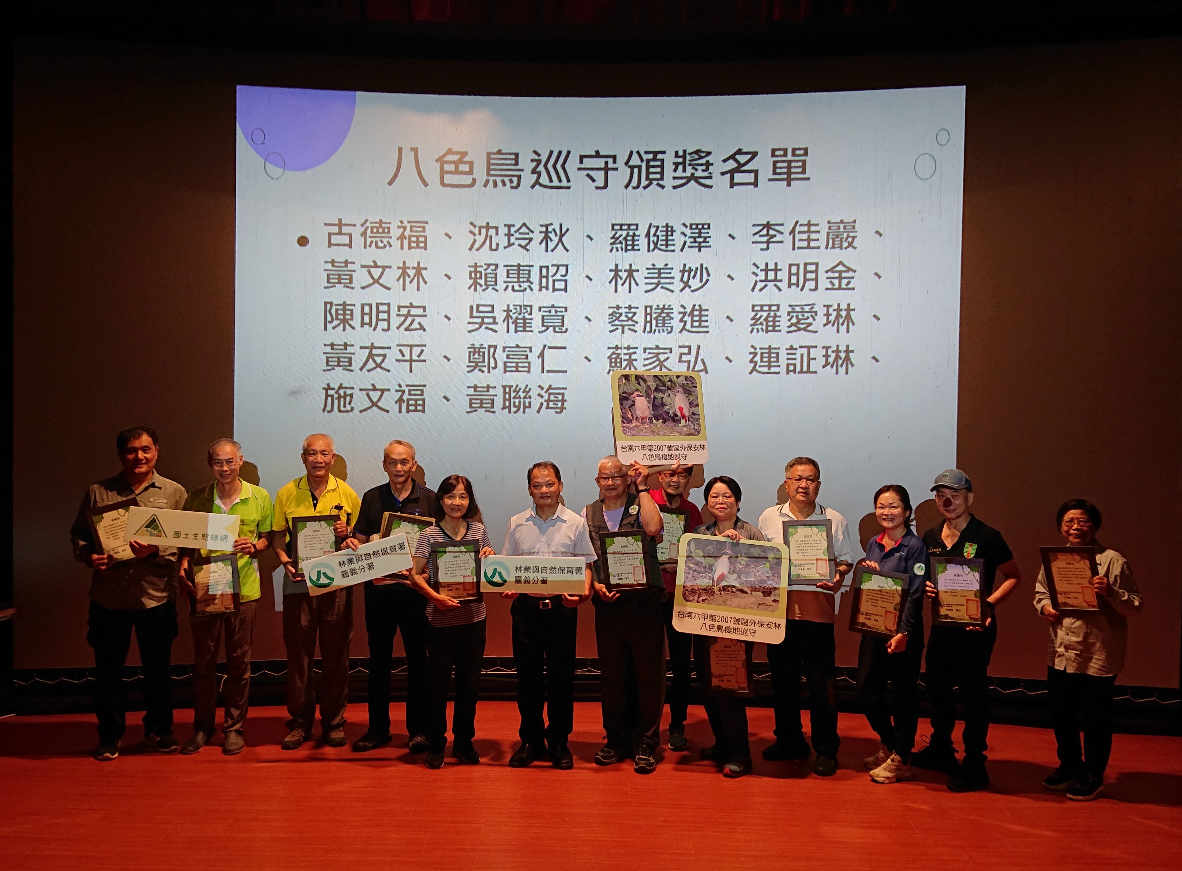嘉義分署表示,臺南六甲第2007號區外保安林是嘉南國土生態綠網「阿里山淺山農地保育軸帶」指認的重點推動區域,為守護八色鳥重要之繁殖棲地,號召國家森林志工積極投入公民科學生態調查,四年來已累計記錄35科73種鳥類,其中有7種特有種及13種保育類,包含八色鳥、藍腹鷴、朱鸝、臺灣畫眉、黑鳶等珍稀鳥種,今年新記錄林鵰等4種鳥類現蹤,觀察到竹雞、黑枕藍鶲、綠鳩等淺山鳥種的精彩繁殖影像。哺乳類記錄到食蟹獴、穿山甲等8種淺山代表性物種,亦記錄到10種爬蟲類、5種兩棲類。保安林底層植被亦精彩可觀,雨季後吊鐘鬼蘭、垂頭地寶蘭萌發綻放,調查成果顯示第2007號區外保安林宛如生態方舟,孕育繽紛的淺山物種棲息。嘉義分署為感謝表揚國家森林志工投身八色鳥棲地保育工作,今年志工大會為18位志工頒發感謝狀,發揮公民科學精神,攜手守護淺山生態系。