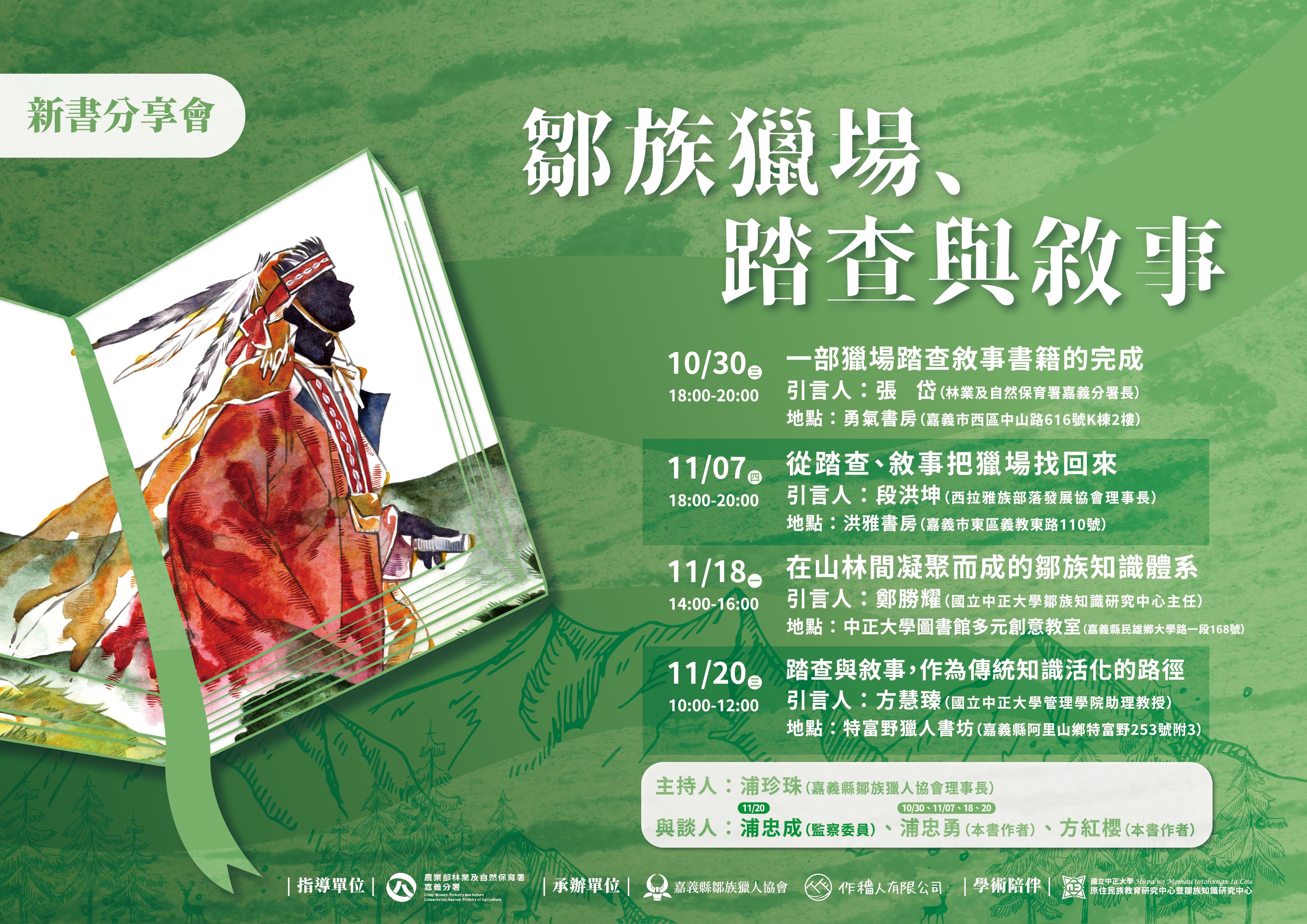 林業及自然保育署嘉義分署與嘉義縣鄒族獵人協會共同發行新書《鄒族獵場、踏查與敘事》甫於9月底出版,該書以嘉義縣阿里山鄉鄒族狩獵場域作為撰寫主軸,首次系統化公開鄒族8個部落間的獵場分布。為與各界分享踏查成果,將於10月30日起於嘉義縣市辦理四場新書分享會,四場分享會主持人皆由嘉義縣鄒族獵人協會理事長浦珍珠擔任,與談人則由兩位主筆者—鄒族獵人學者浦忠勇教授以及女性獵人方紅櫻校長擔任,另外還分別邀請政府機關、其他部落、研究學者代表擔任引言人。