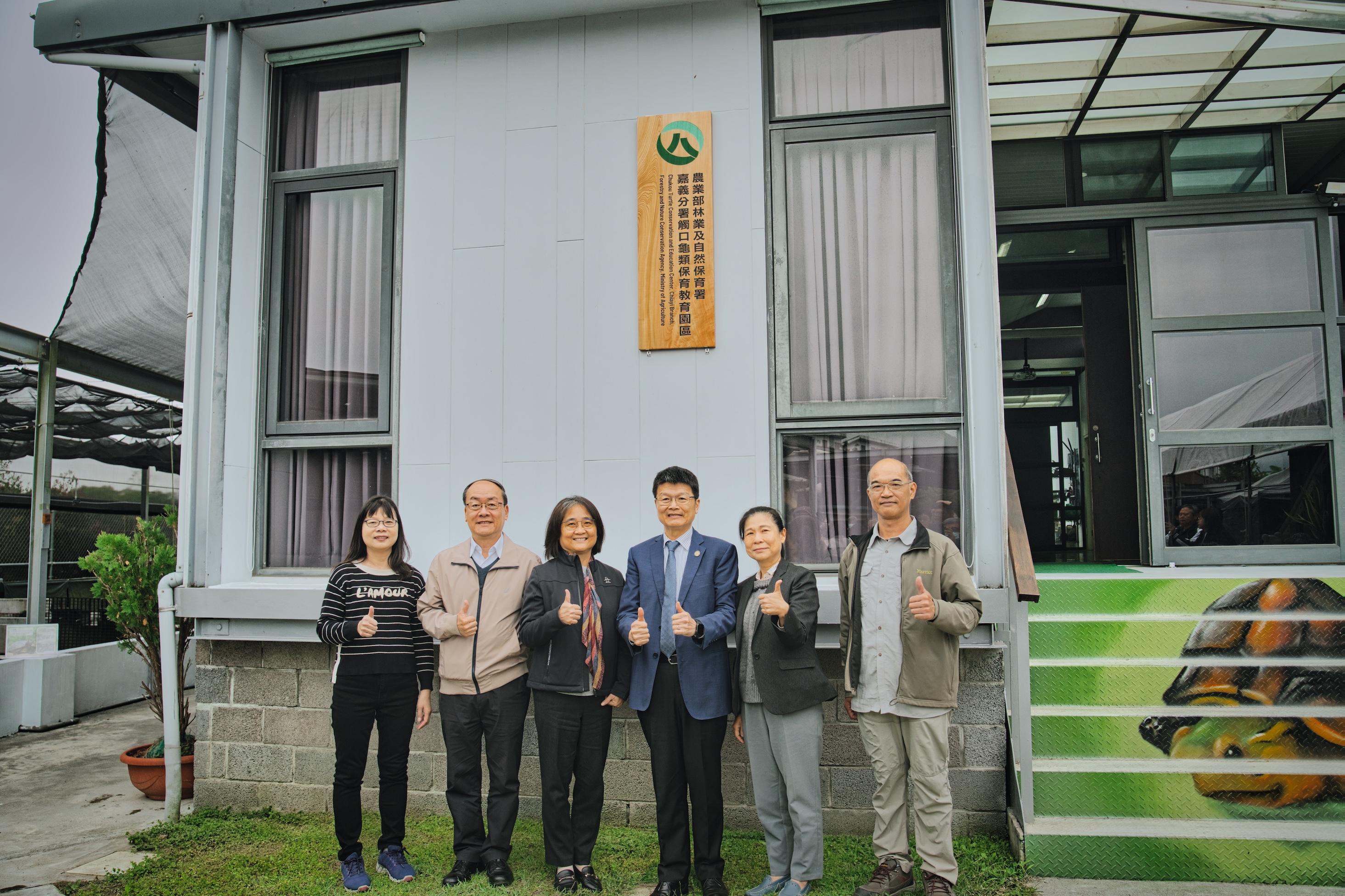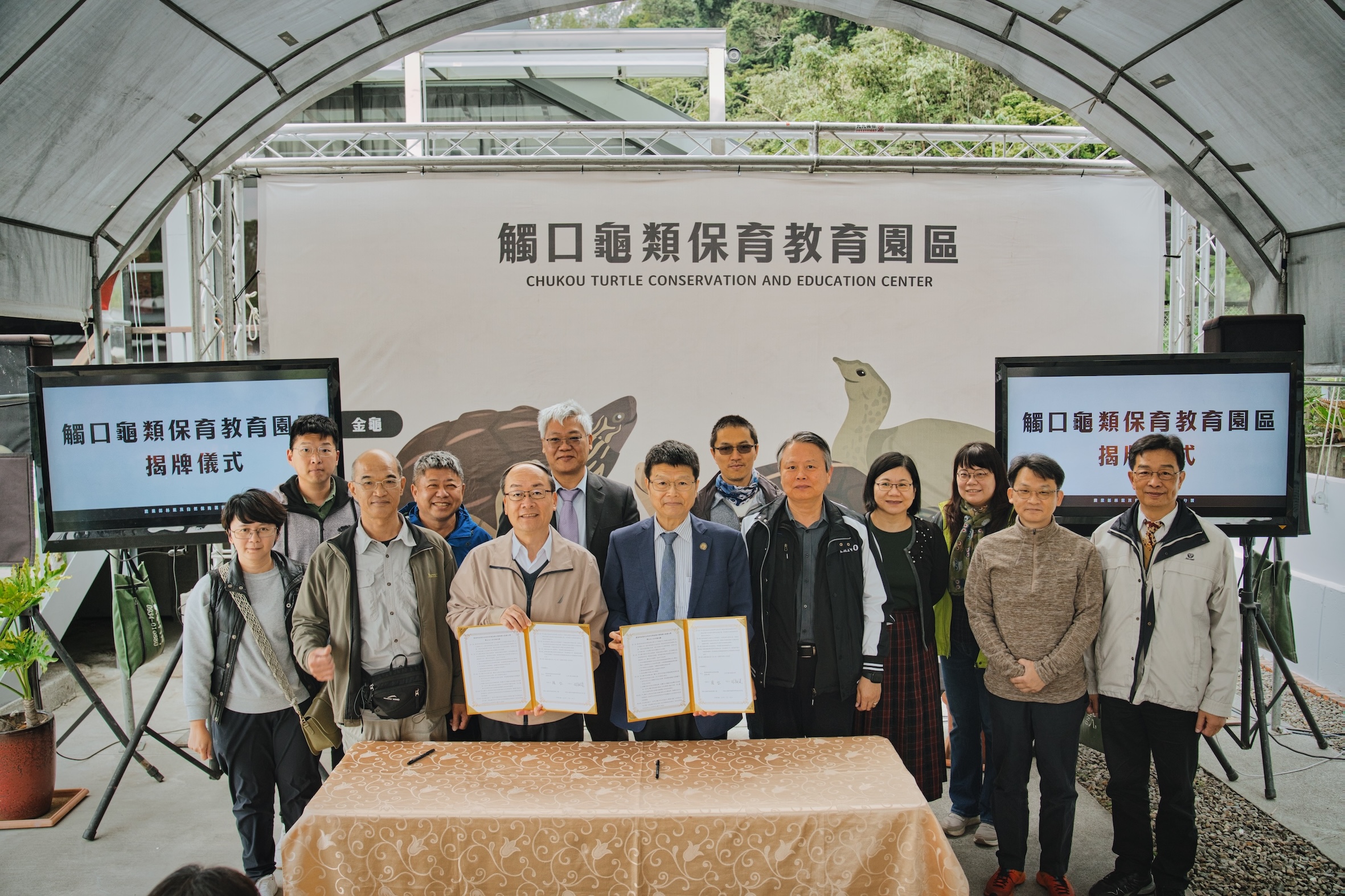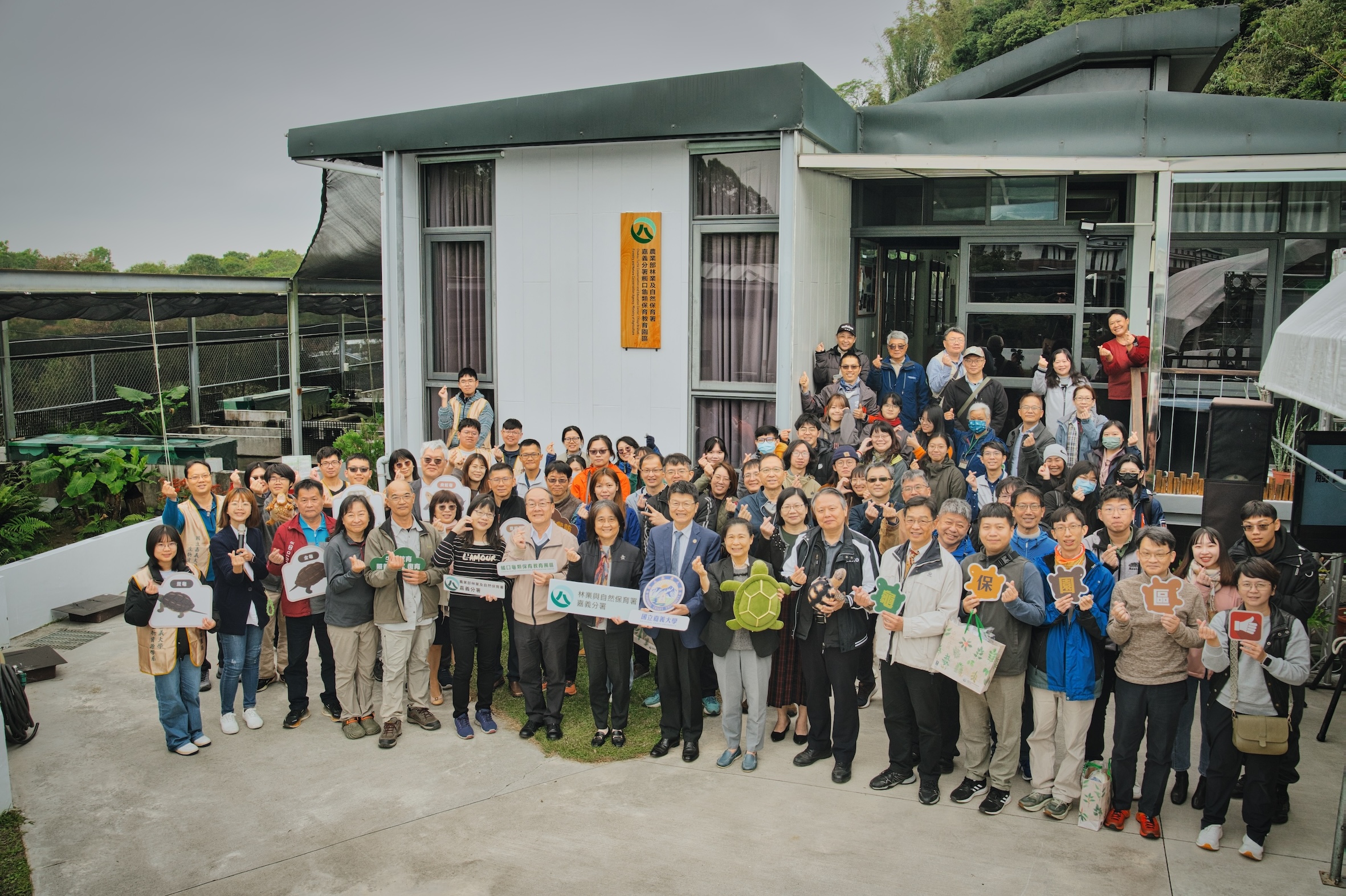 農業部林業及自然保育署嘉義分署今(24)日舉行觸口龜類保育教育園區揭牌儀式,由林業保育署副署長林澔貞、嘉義分署分署長張岱、國立嘉義大學校長林翰謙、林業保育署組長羅尤娟、生物多樣性研究所組長薛美莉及國立嘉義大學教授許富雄等貴賓攜手揭牌。會中並同步完成與嘉義大學簽署學生志工合作備忘錄,現場廣邀學界、公部門龜類專家及嘉義市區國民小學代表出席,共同見證此一重要時刻。