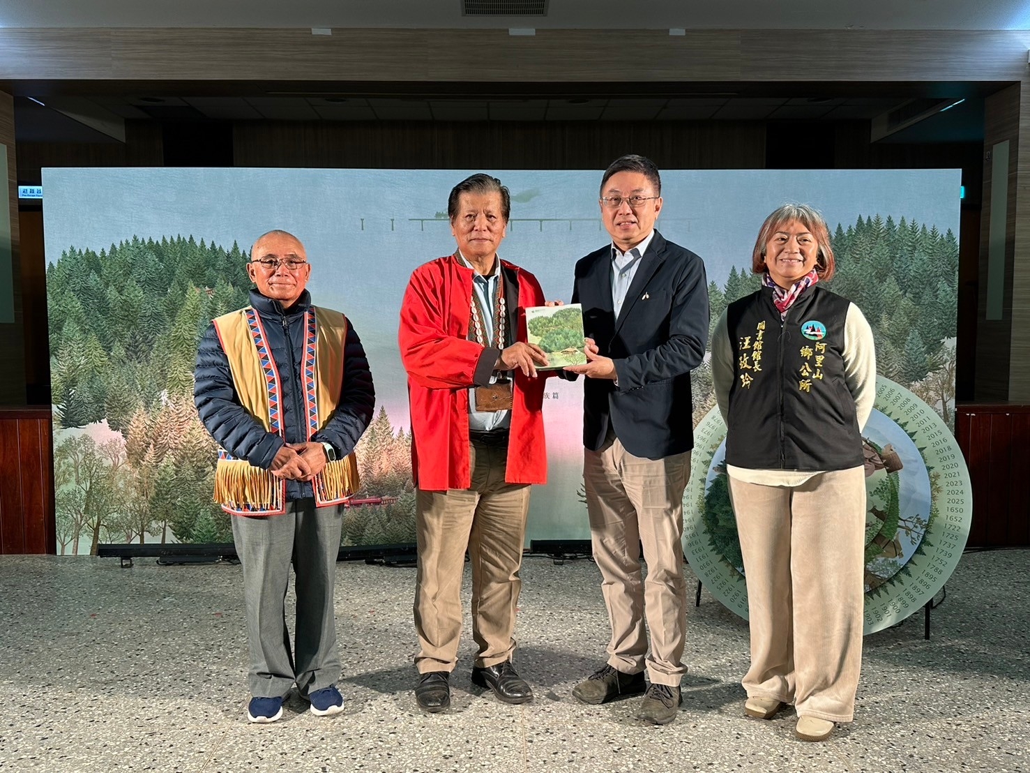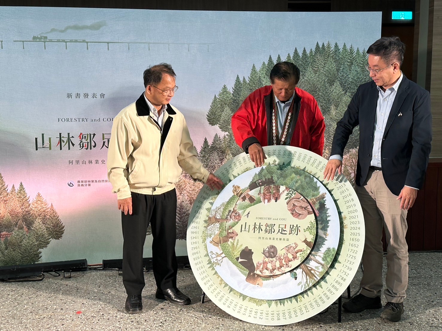 農業部林業及自然保育署嘉義分署今(26)日於嘉義文化創意園區舉辦《山林鄒族足跡-阿里山林業史鄒族篇》新書發表會,由林業保育署署長林華慶、嘉義分署副分署長李定忠及鄒族長老高德生等人共同轉動阿里山林業史及鄒族年輪,更以鄒族創意料理,以鄒族傳統智識驅動山林治理新篇章。