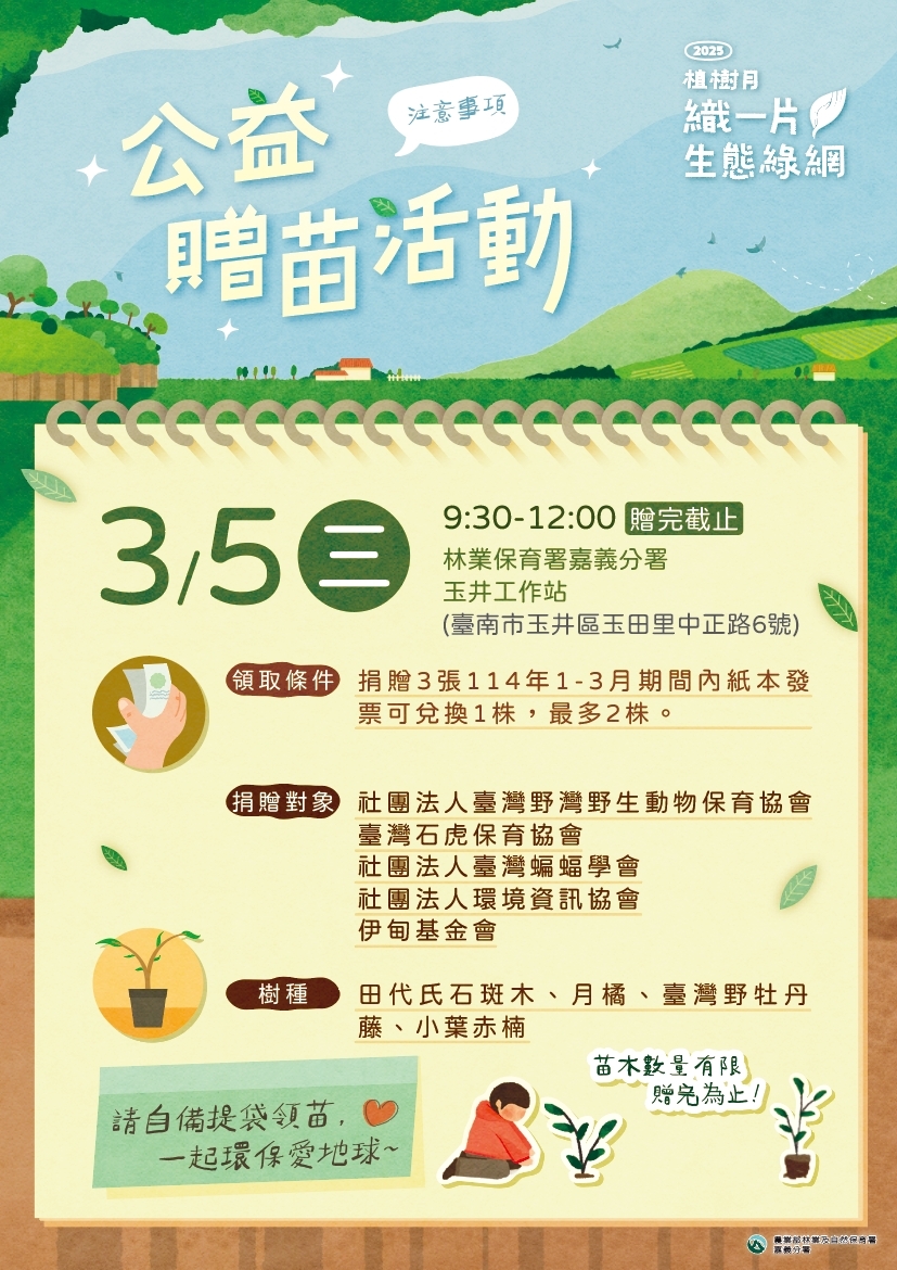 林業及自然保育署嘉義分署配合114年「織一片生態綠網」植樹月,3月在臺南地區將舉辦多場贈苗活動,預計發放2,000株原生種苗木,合作辦理單位包含臺南市政府、遠東百貨臺南成功店及關子嶺崁頂福安宮。首場贈苗活動於3月5日(三)上午9時30分在嘉義分署玉井工作站啟動,現場贈送開花雪白透粉的「田代氏石斑木」、花香遠飄的「月橘」、及新葉紅艷美麗的「小葉赤楠」等600株苗木,邀請民眾用發票兌換樹苗,每人捐贈114年1-3月未開獎發票3張可兌換1株苗木,最多兌換2株,歡迎民眾踴躍參加。