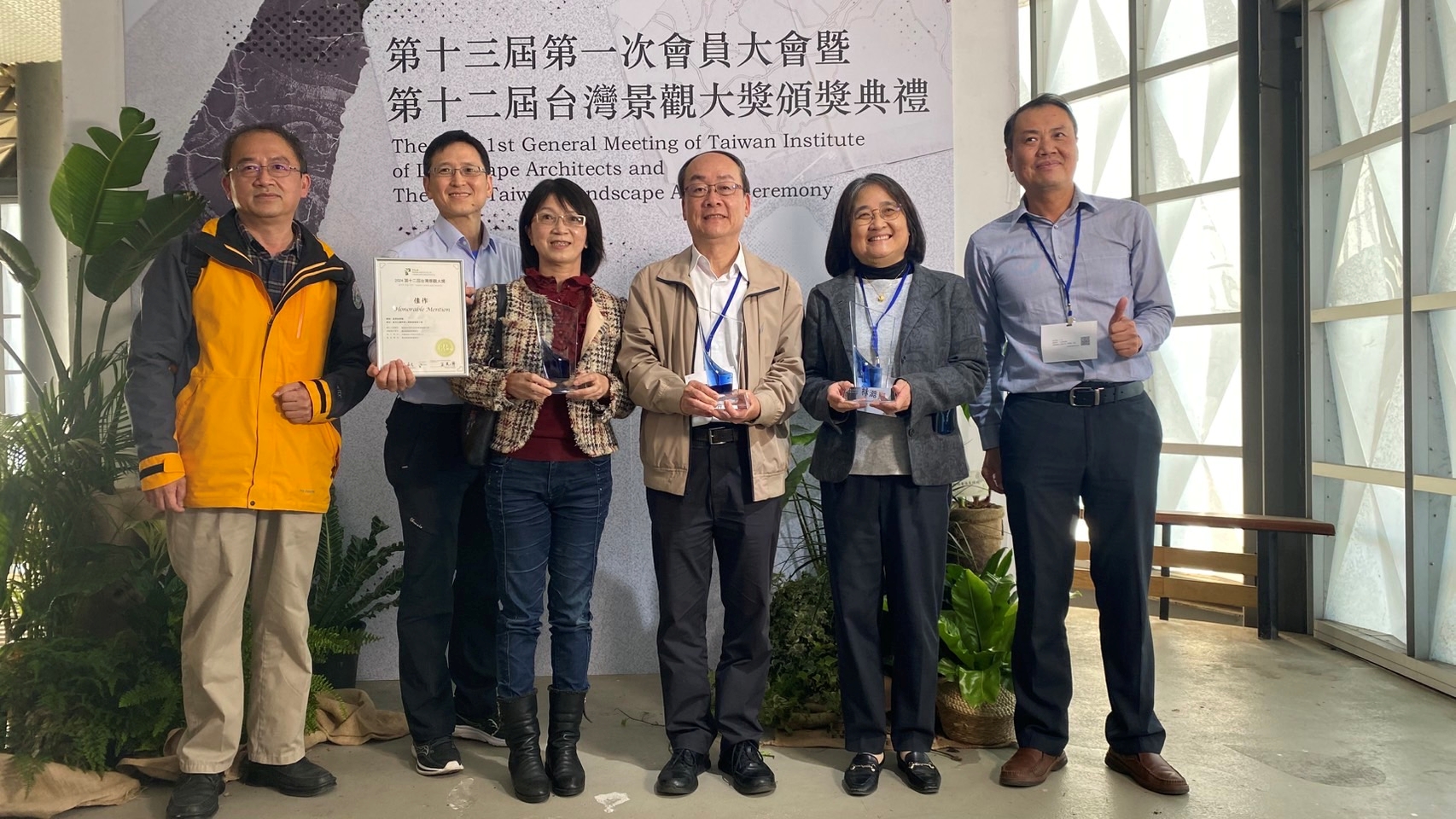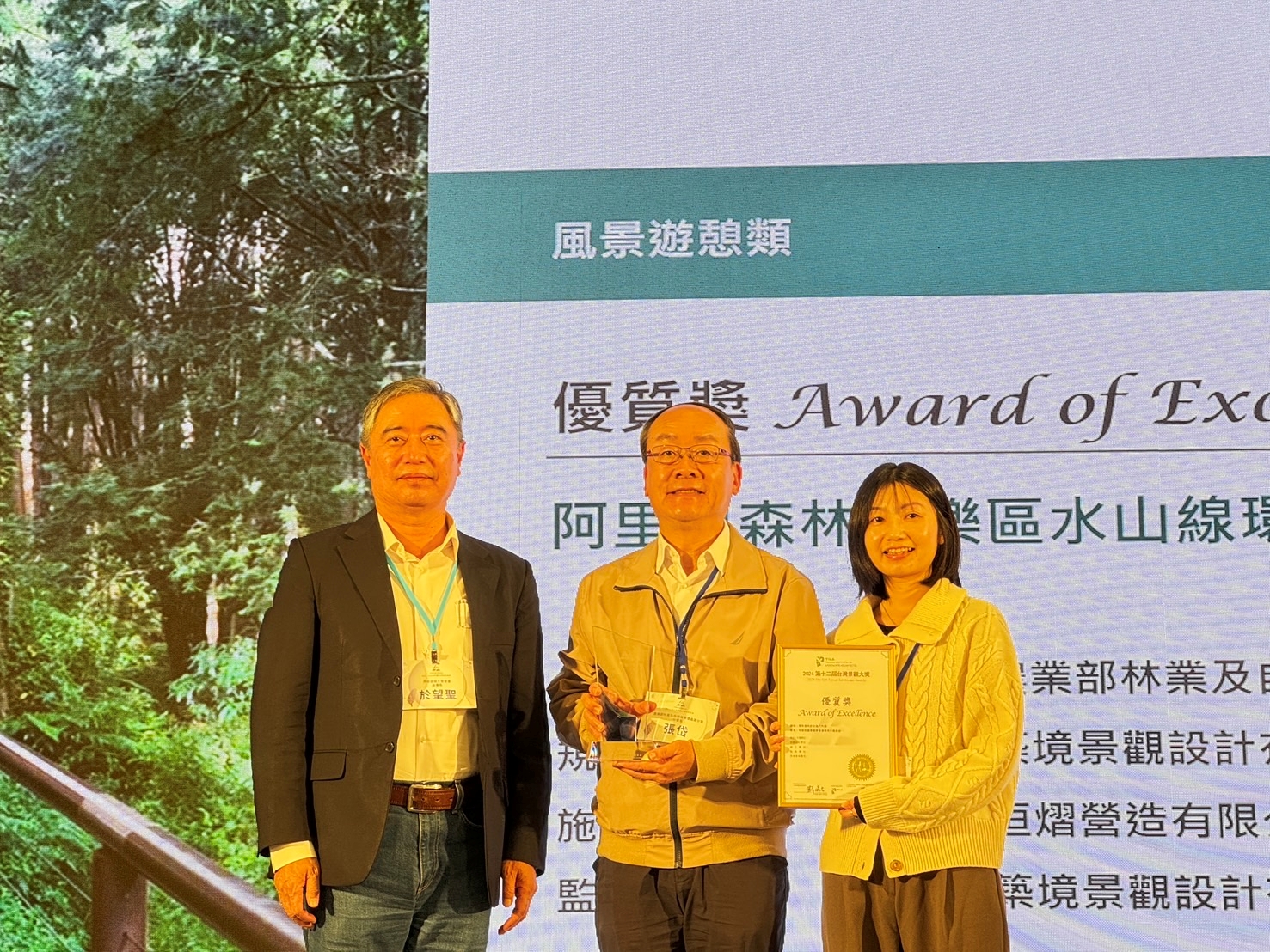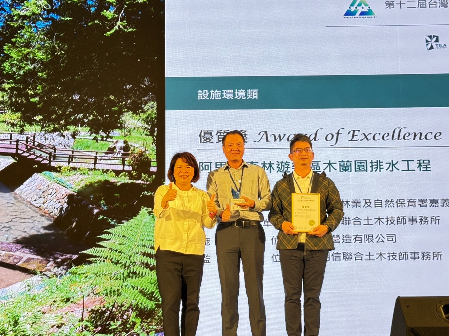 2024第十二屆台灣景觀大獎於22日在花博公園流行館舉行頒獎典禮,農業部林業及自然保育署嘉義分署首次參賽榮獲3件優質獎及1件佳作獎,分署長張岱率同仁及得獎廠商代表參與典禮,獲獎作品為風景遊憩類優質獎「阿里山森林遊樂區水山線環狀步道新設工程」與佳作獎「縣定古蹟阿里山貴賓館整修工程」、設施環境類優質獎「特富野古道設施改善工程」與「阿里山森林遊樂區木蘭園排水工程」。