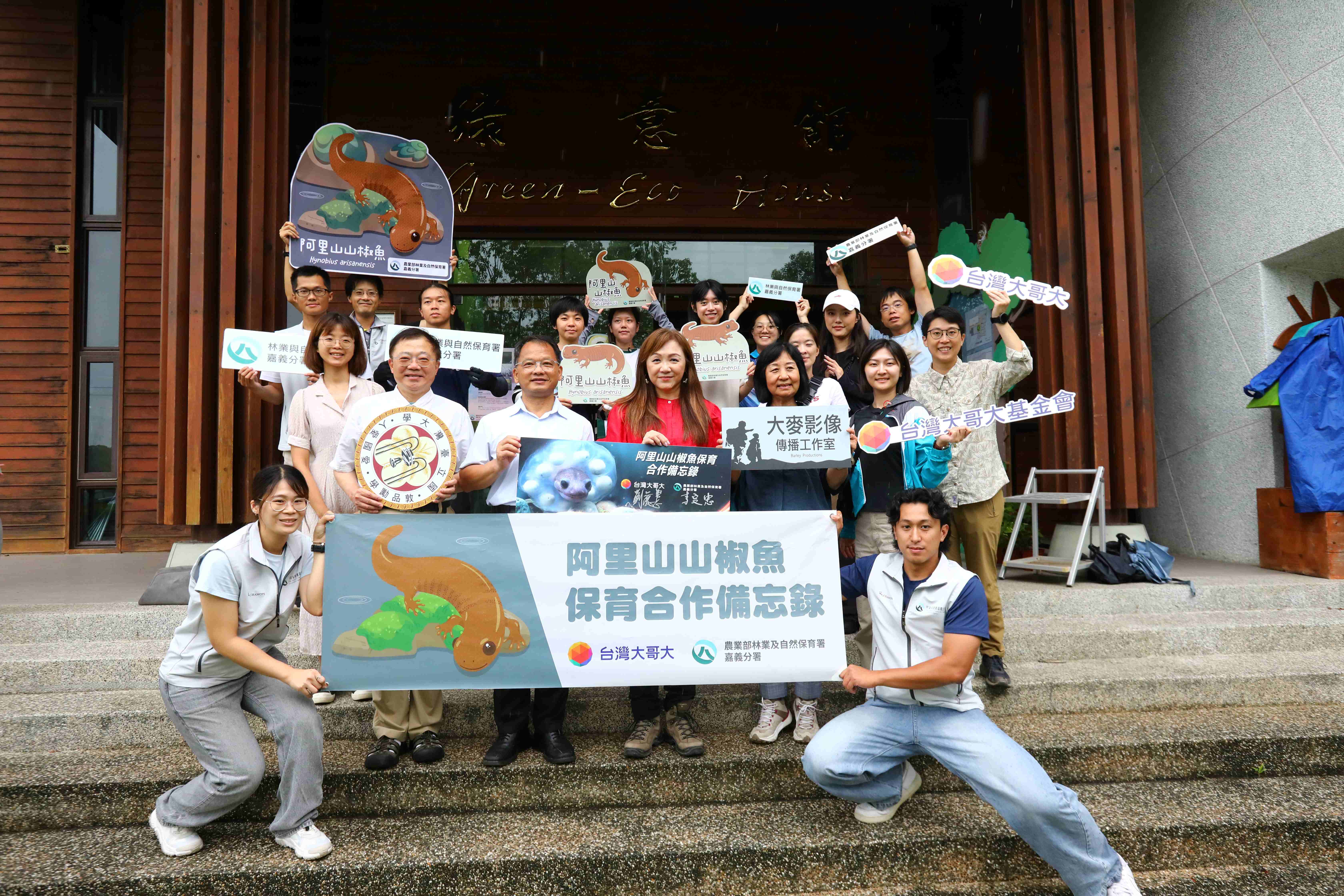 農業部林業及自然保育署嘉義分署12日由分署長李定忠與台灣大哥大股份有限公司永續品牌公關副總經理劉麗惠在觸口自然教育中心簽署阿里山山椒魚保育合作備忘錄(MOU),並在國立臺灣大學朱有田教授的解說下,讓台灣大哥大代表深入認識阿里山山椒魚復育棲地,為分署與民間企業合作阿里山山椒魚保育工作邁出一大步。