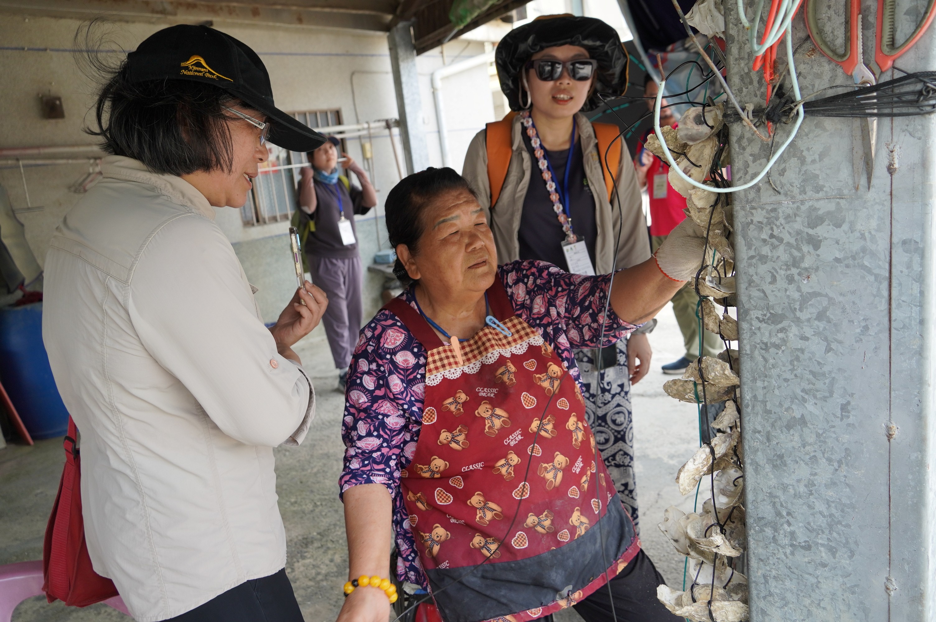 工作坊第二天實地踏查北門三寮灣與蘆竹溝社區,由深耕駐點團隊分享在地的人文背景、傳統產業與產業結構變遷衍生的環境問題,並探討如何透過多元行動協助改善當地生產、生態及社會結構,打造里海韌性社區。三寮灣社區以東隆宮作為當地傳統信仰中心,當地使用「關水」農法耕種紅蔥頭,減少土地鹽分與抑制雜草生長,同時提供秋過境候鳥覓食與棲息的空間,形成人與自然和諧共生的友善農耕生產地景。蘆竹溝社區以養蚵為主要產業,在地居民透過關注光電議題凝聚共識,爭取更合理的生活空間使用與永續發展權益,並藉由社區培力打造兼顧生產、生活、生態的三生共榮韌性社區。