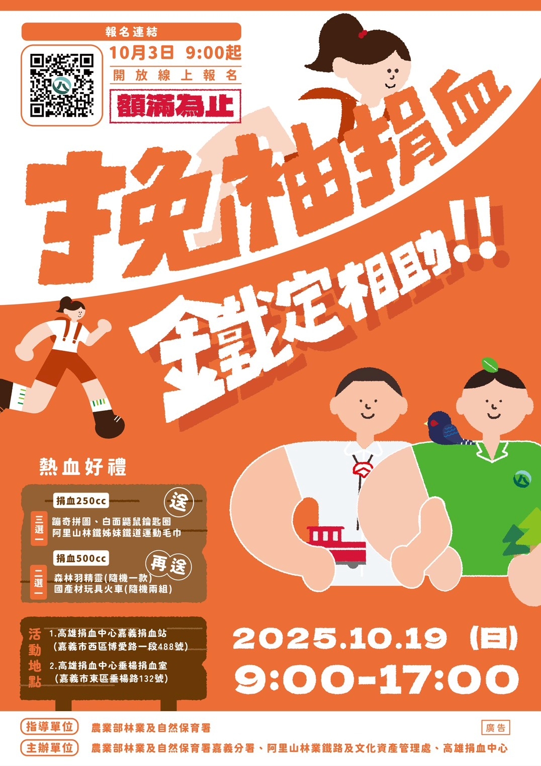 為鼓勵民眾踴躍捐血作公益,農業部林業及自然保育署嘉義分署與阿里山林業鐵路及文化資產管理處攜手合作,將於114年 10 月 19 日(星期日)上午 9 時至下午 5 時同步於高雄捐血中心嘉義捐血站與垂楊捐血室舉辦「挽袖捐血 鐵定相助」捐血活動,現場備有森林羽精靈布偶、國產材玩具火車等多項文創商品要送給熱血民眾。活動採事前線上報名,限額250位,報名網址將於114年10月3日(星期五)上午9時整開放,歡迎民眾一起響應捐血,以實際行動將愛延續。