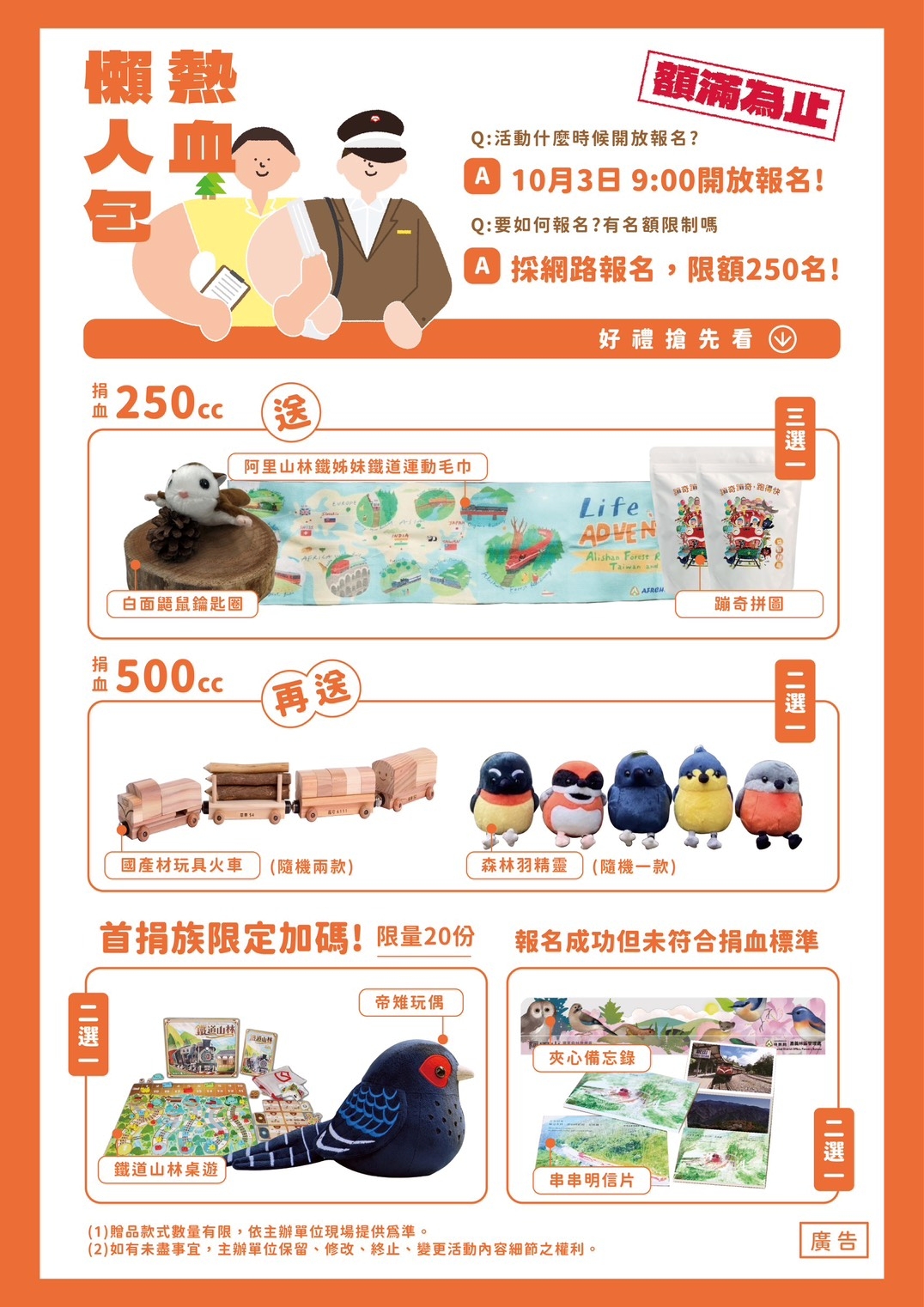 本次捐血活動限額250名,凡報名成功且當日完成捐血的民眾即可獲得特色好禮。捐血250 CC的民眾可獲得「白面鼯鼠鑰匙圈」、「阿里山林鐵姊妹鐵道運動毛巾」或「蹦奇拼圖」三選一;捐血500 CC者可再獲得「國產材玩具火車」或「森林羽精靈造型玩偶」二選一。為鼓勵更多人勇敢跨出熱血公益的腳步,針對第一次挽袖捐血的民眾,嘉義分署與林鐵處更限量加碼,前20名首捐族可獲得好禮「鐵道山林桌遊」或「帝雉玩偶」二選一。