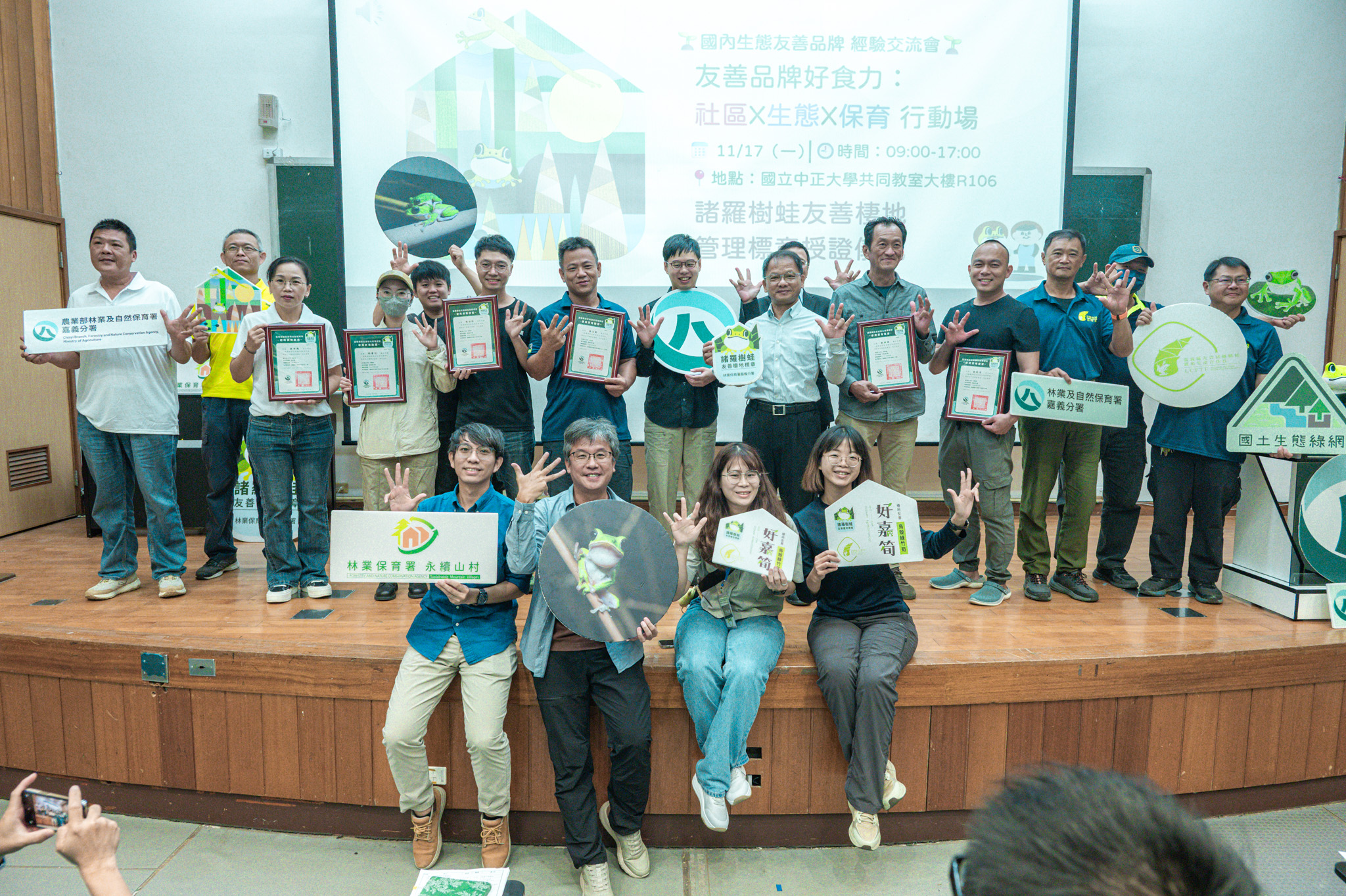 為促進國內生態友善品牌的交流與合作,農業部林業及自然保育署嘉義分署17日舉辦「友善品牌好食力:社區X生態X保育 行動場」,邀集各地實踐者分享經驗,探討生產與保育間的平衡,如何將生態保育議題轉化為具有保育價值與市場潛力的生態友善品牌,並以「好食力」為主軸,串聯社區特色產品,推廣友善農業的多元發展。當日也舉行「113年度嘉義分署社區林業績優社區頒獎」及114年度29位共58處田區(19.3公頃)「諸羅樹蛙友善棲地管理標章」標章農友授證典禮,鼓勵持續推動生態友善農業的農友與社區夥伴。嘉義分署期望透過活動能讓民眾更了解生態友善品牌耕耘在生態保育上的用心與努力,進而改變大眾的消費思維,用「鈔」能力來實際支持保育行動。