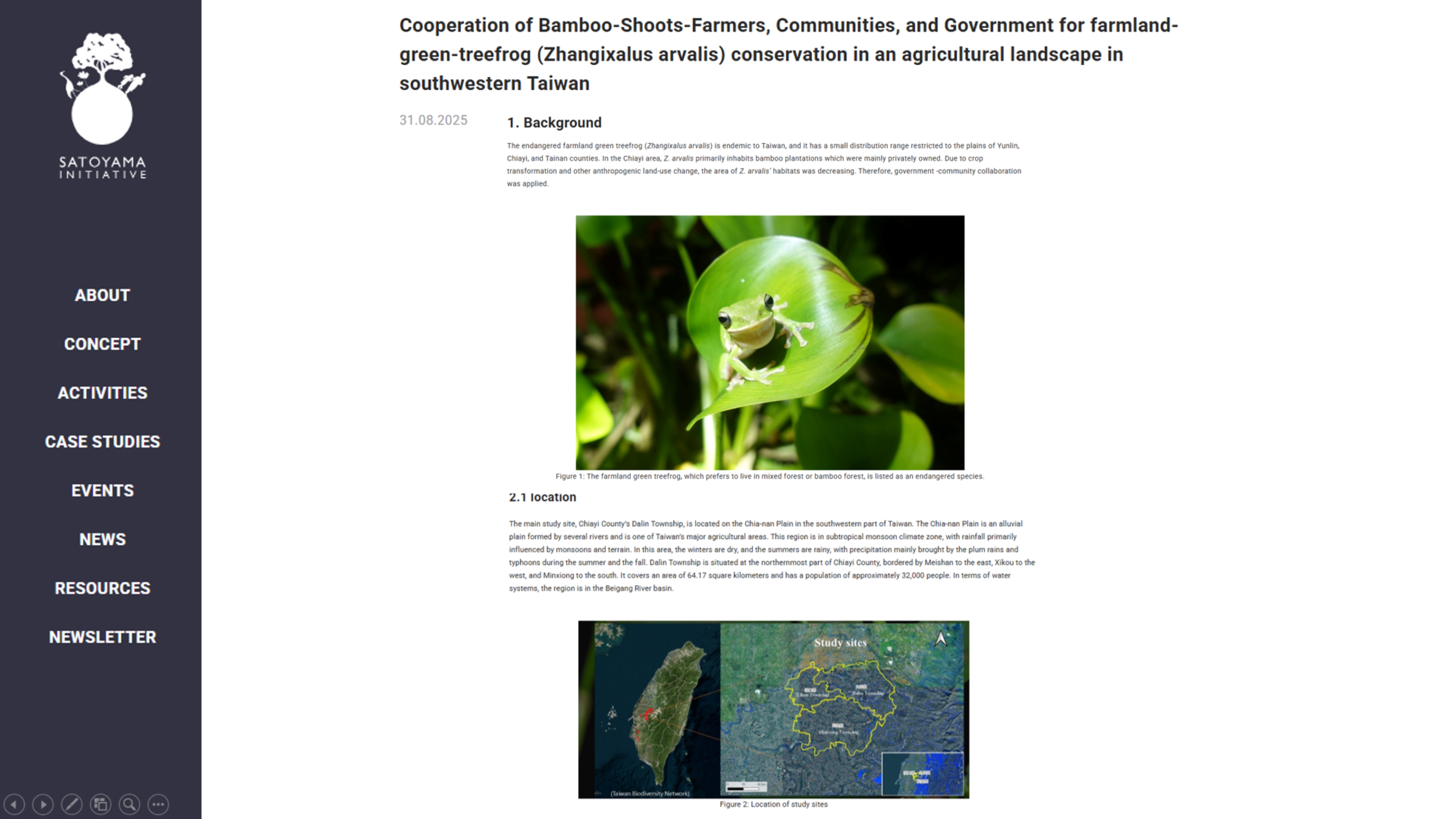 另一則刊登於里山倡議國際夥伴關係(International Partnership for the Satoyama Initiative, IPSI)的案例,則以更宏觀農業地景尺度的諸羅樹蛙保育為核心,因諸羅樹蛙與農地有高度依存關係,因此保育工作必須要吸引農民持續種植竹筍,將田與田串連成為綠網,再串聯從產地到餐桌的人網,把筍賣出去以回饋農民投入保育的辛苦。嘉義分署攜手嘉義地區筍農推出「諸羅樹蛙友善棲地管理標章」認證,並輔導「嘉義縣諸羅樹蛙友善蔬果生產合作社」運銷高品質又顧生態的標章竹筍到消費者手中,透過保育與農業經濟共好的方式,實踐「人與自然和諧共生」的里山倡議精神。IPSI 為聯合國生物多樣性公約(CBD)架構下的重要國際夥伴網絡,匯集全球各地政府、研究機構、非政府組織與社區團體,共同推動里山倡議。該平台所蒐錄的案例強調地方智慧與多方合作,嘉義分署的案例展現了臺灣在推動方面的具體實踐,並與世界各地的成功經驗相互呼應。