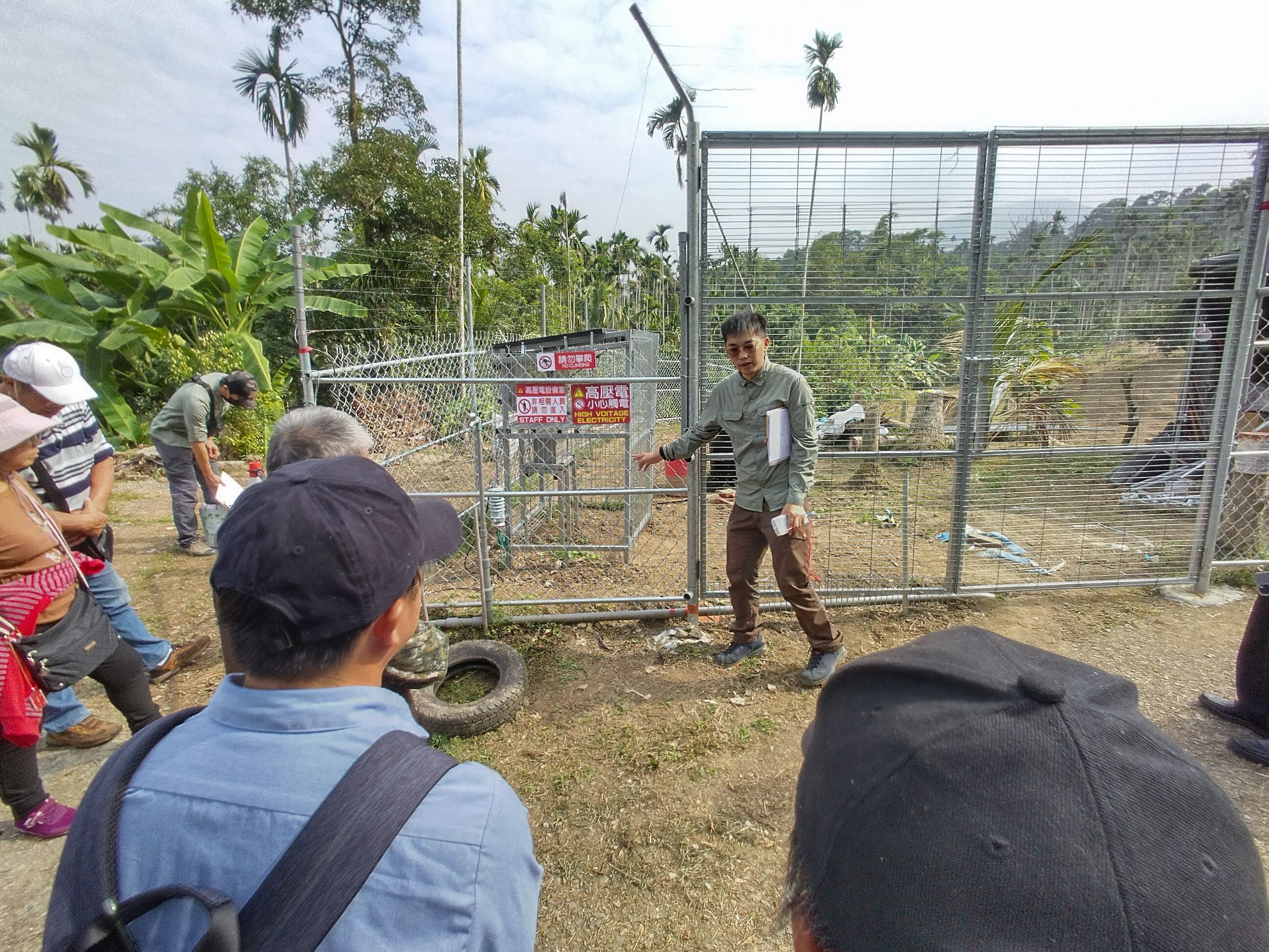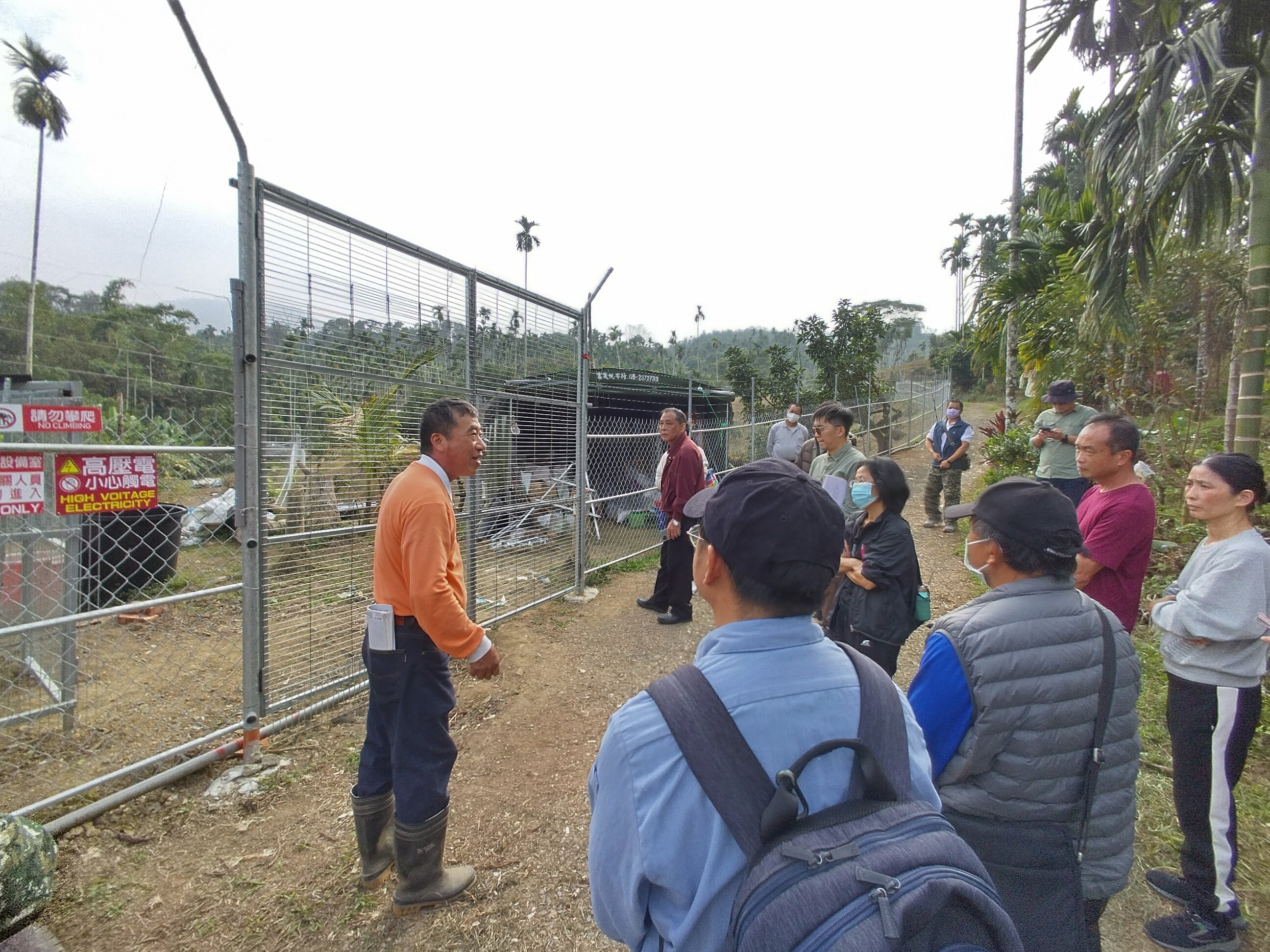 農友袁振東的農園位於嘉義縣中埔鄉低海拔的淺山地區,栽植黃金果、牛奶果及酪梨達0.65公頃,深受獼猴危害損失逾200公斤,曾嘗試多種防治方法成效仍有限,114年申請架設電牧器電圍網,架設完成後農園周邊的獼猴至今都沒有再入侵農園,其表示成功關鍵在於電牧器電圍網兩側的果樹及雜木需進行修枝或移除,形成獼猴防線,阻斷入侵路徑。經過現場觀摩及經驗分享,農友們更能掌握電牧器電圍網的安全性、架設規格方法及注意事項,也能提升實際架設後的防治成效。