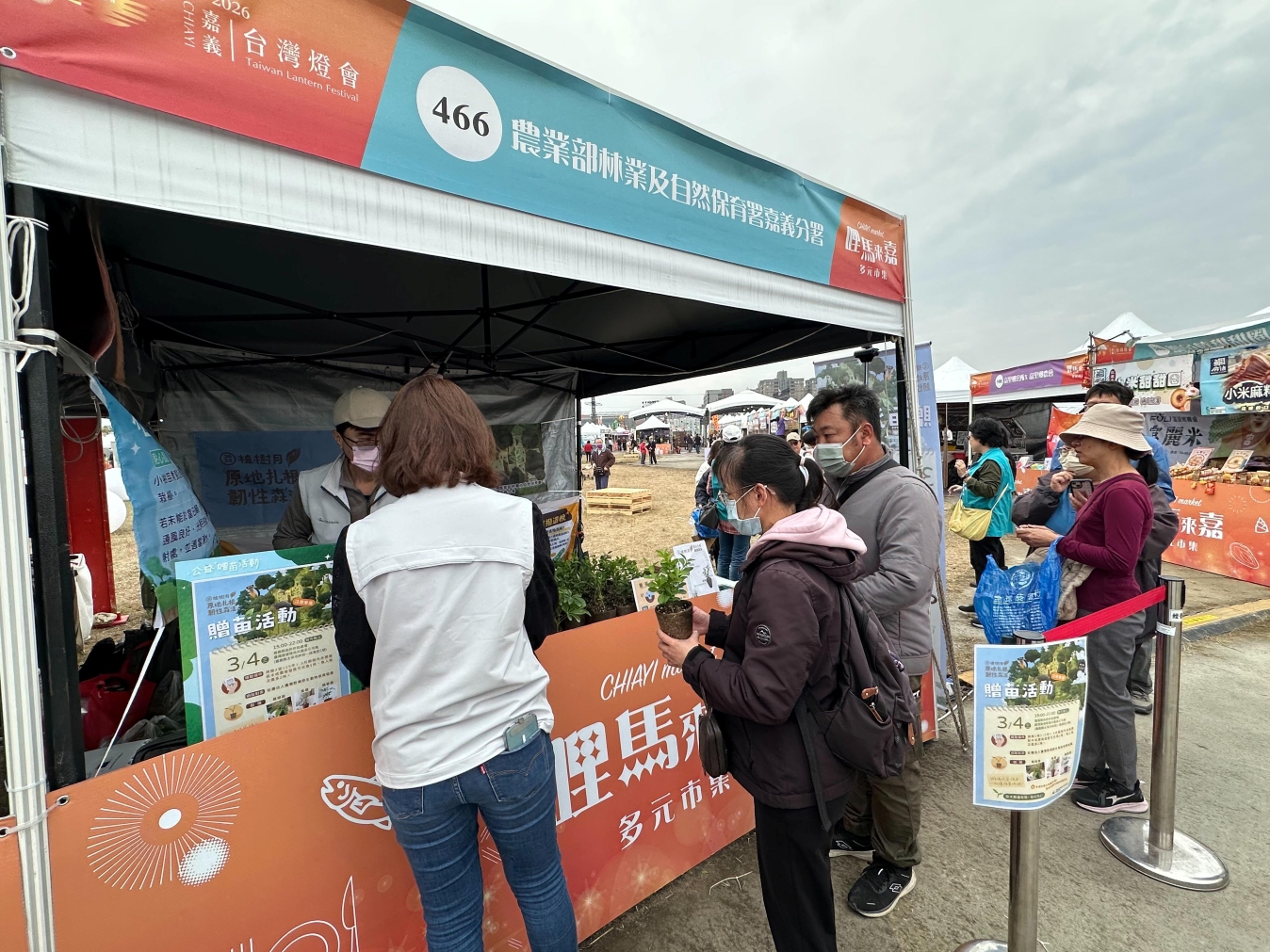 嘉義分署今年辦理多場贈苗活動,讓植樹綠化走入生活,3月4日結合「臺灣燈會」揭開序幕,以精緻居家綠植及限定盆器成功吸引賞燈民眾,擴大推廣綠化效益;3月7日辦理線上預約領苗專場,500株苗木於網路登記階段即被索取一空,現場領取流程順暢高效,同日亦與阿里山國家風景區管理處於嘉義分署觸口工作站合辦闖關活動,讓民眾透過淺顯易懂的方式了解林業相關政策、新知與樹木修剪維護方式;3月21日參與茂林國家風景區管理處活動於臺南關子嶺嶺頂公園辦理贈苗,同日亦與臺南市政府合作於柳營科技工業區舉辦植樹及贈苗活動,掀起參與熱潮;系列活動最後一站於3月29日在阿里山劃下完美句點。